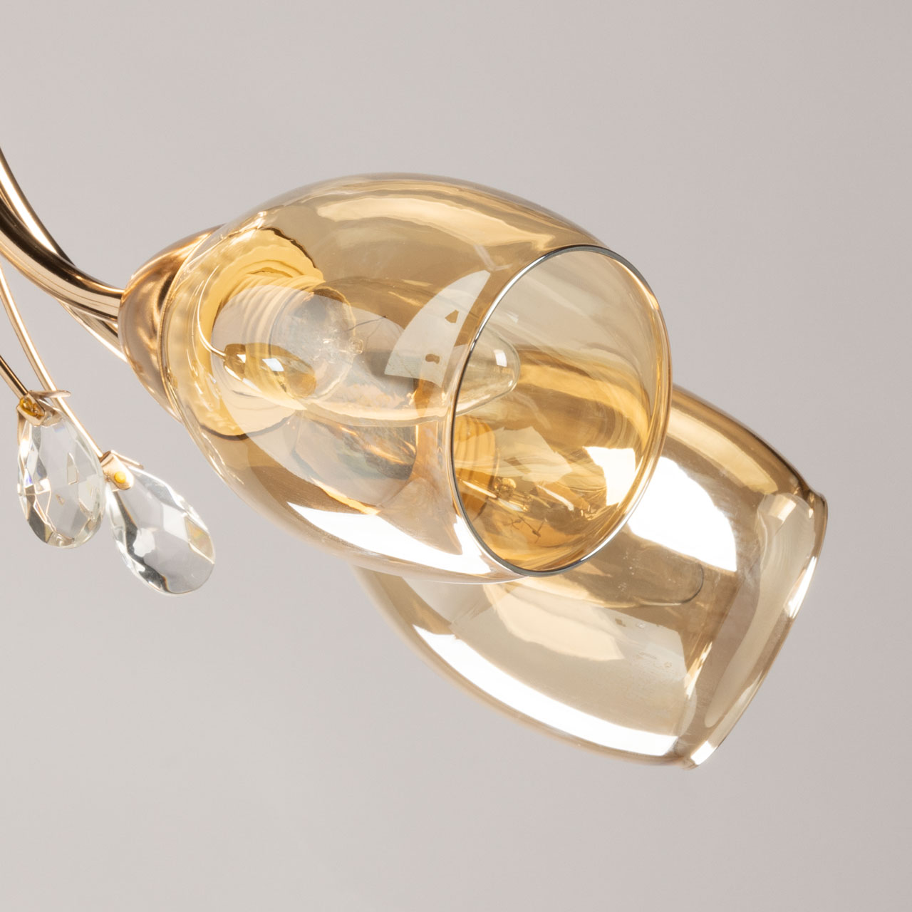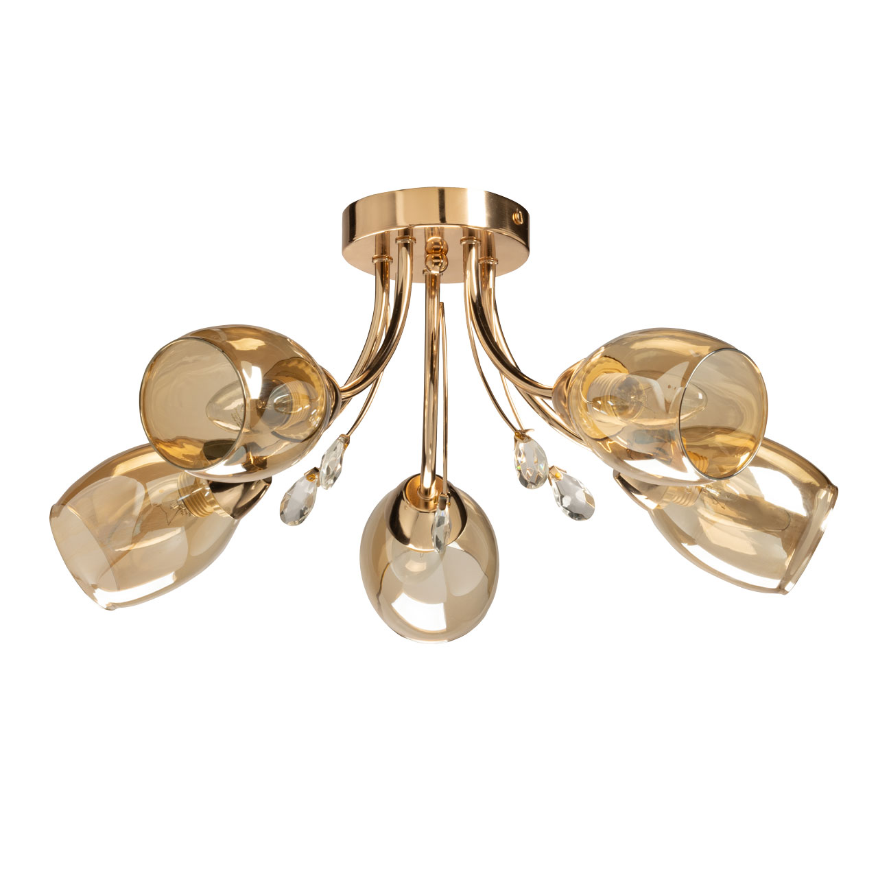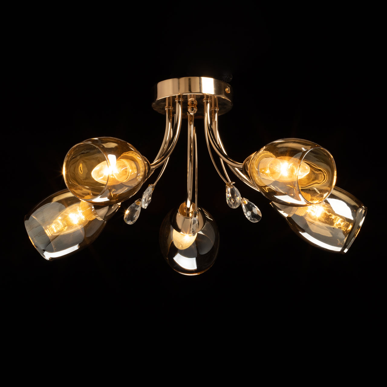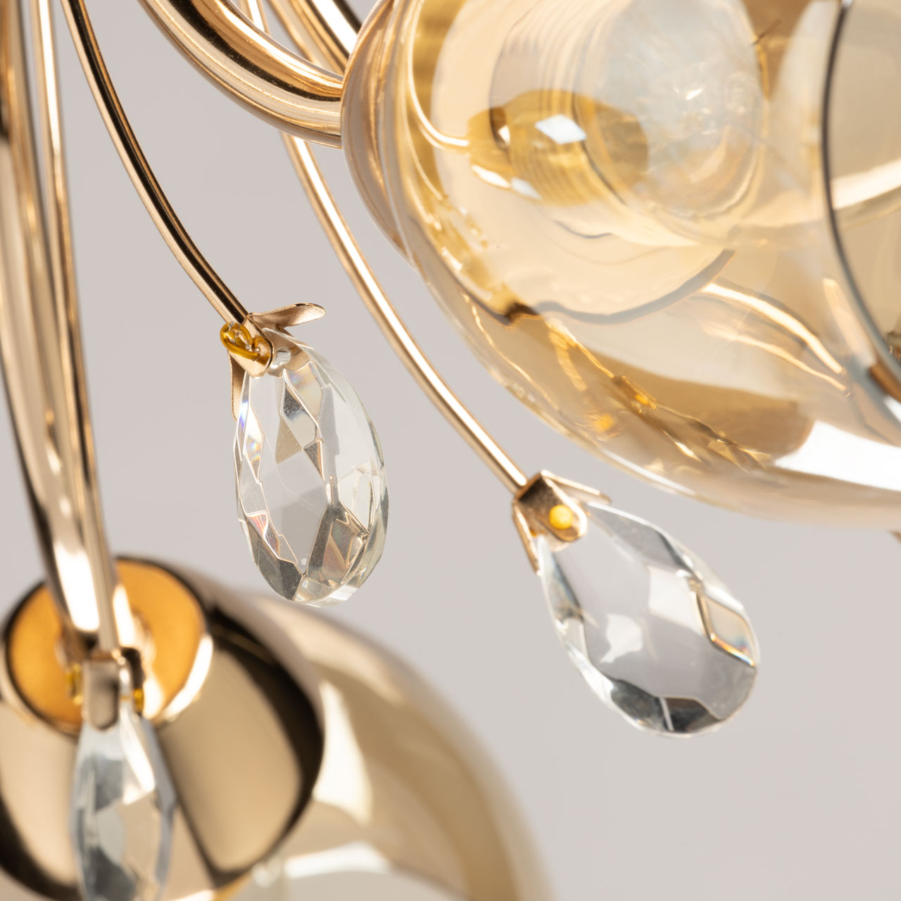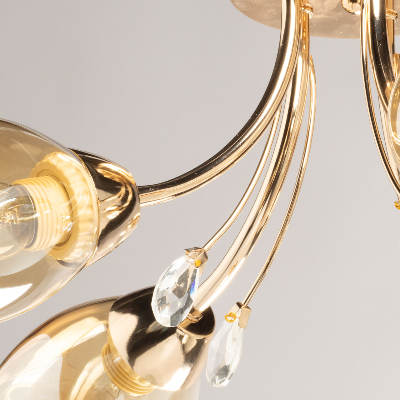 Металлическое основание потолочной люстры гальванизировано в цвет золота. Стеклянные плафоны гальванизированы в цвет шампань. Люстра декорирована прозрачным хрустальным стеклом.