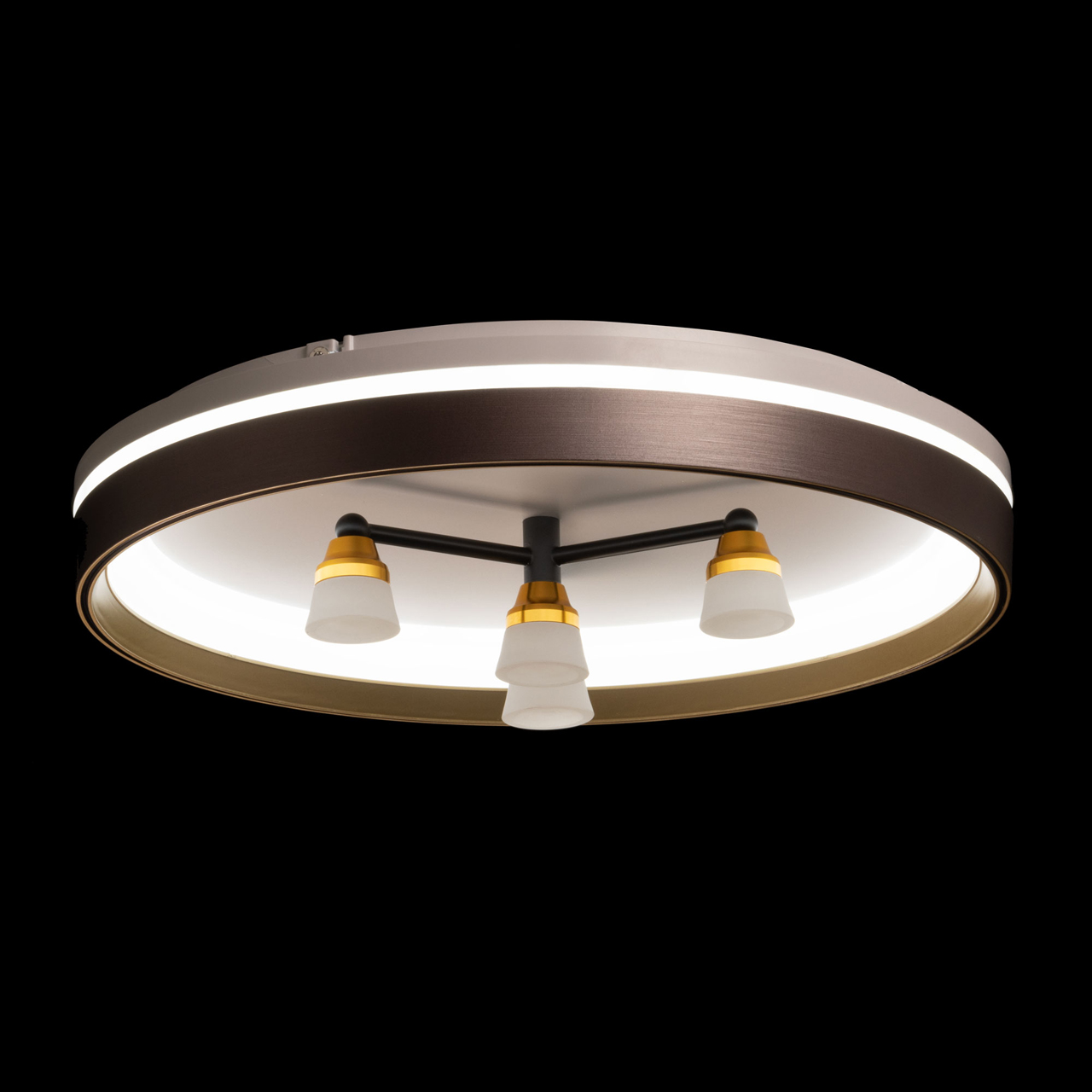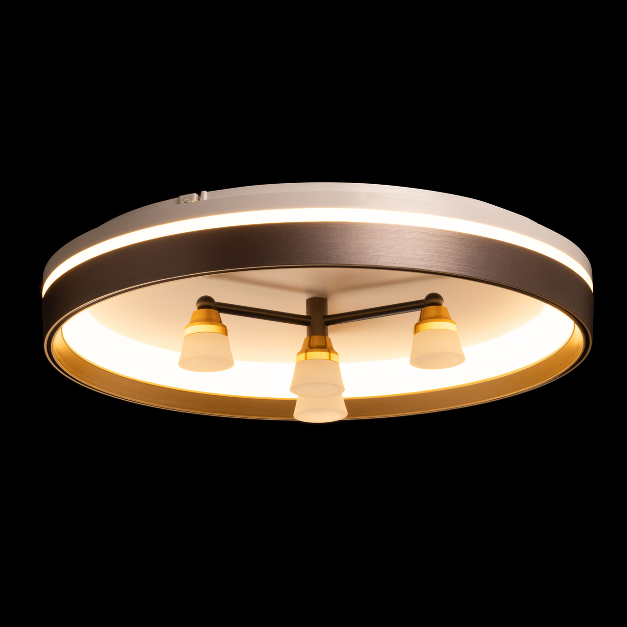 Металлическое основание потолочной люстры окрашено в белый цвет. Корпус плафона выполнен из сплава алюминия и окрашен с наружи в серый цвет, с внутренней стороны в золотой. Светодиодные источники света закрыты белым матовым акрилом. Рожки окрашены в черный цвет, держатели ламп гальванизированы в цвет золота.