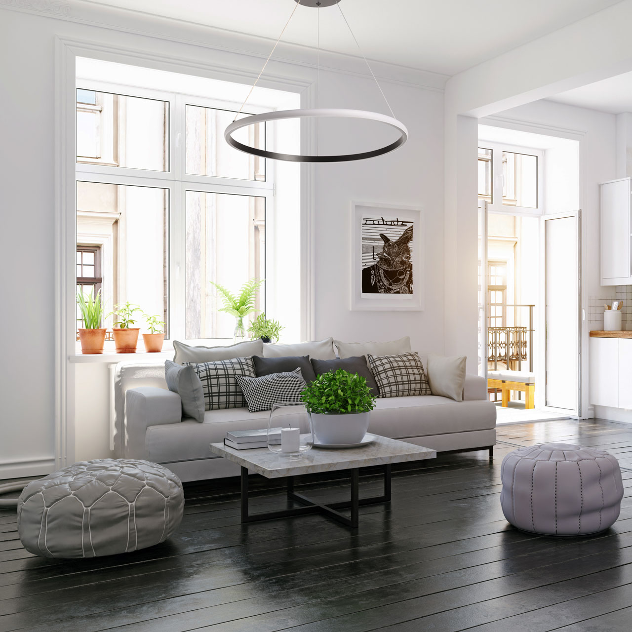 Металлическое основание подвесной люстры окрашено в черный цвет. Корпус плафона выполнен из сплава алюминия с цинком и окрашен в цвет основания. Светодиодные источники света закрыты белым матовым силиконом.