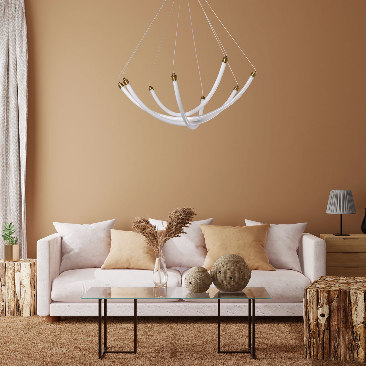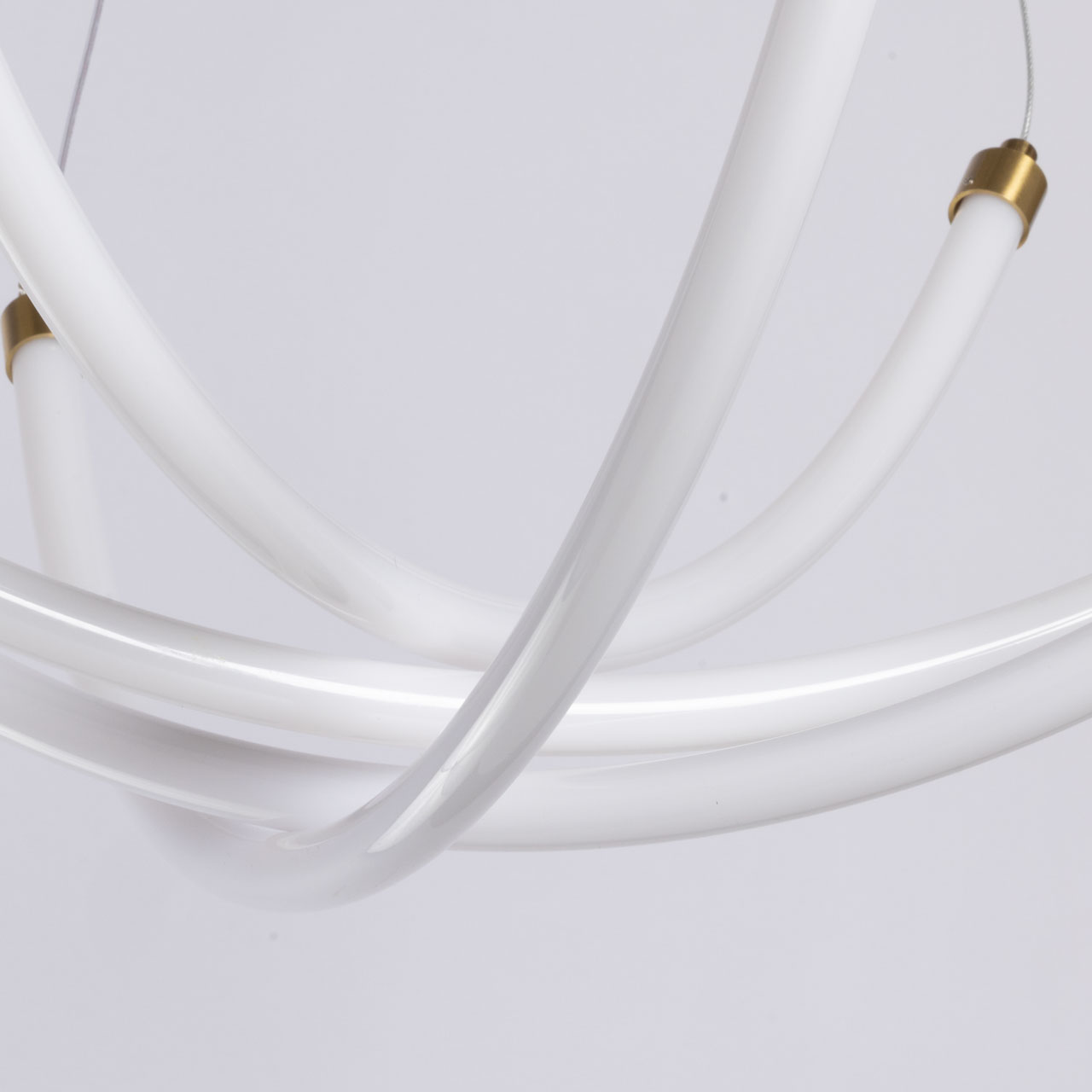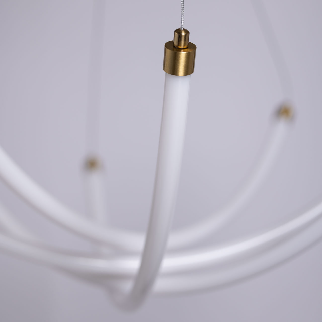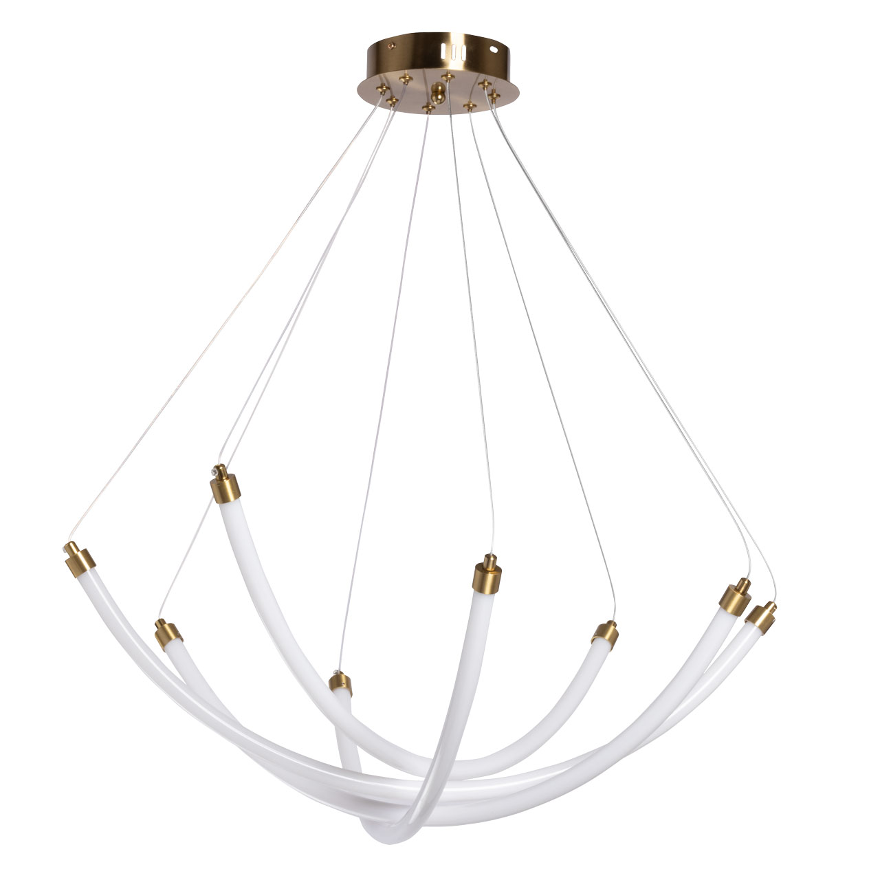 Металлическое основание подвесной люстры гальванизировано в цвет золота. Светодиодные источники света закрыты плафонами из белого матового акрила.
