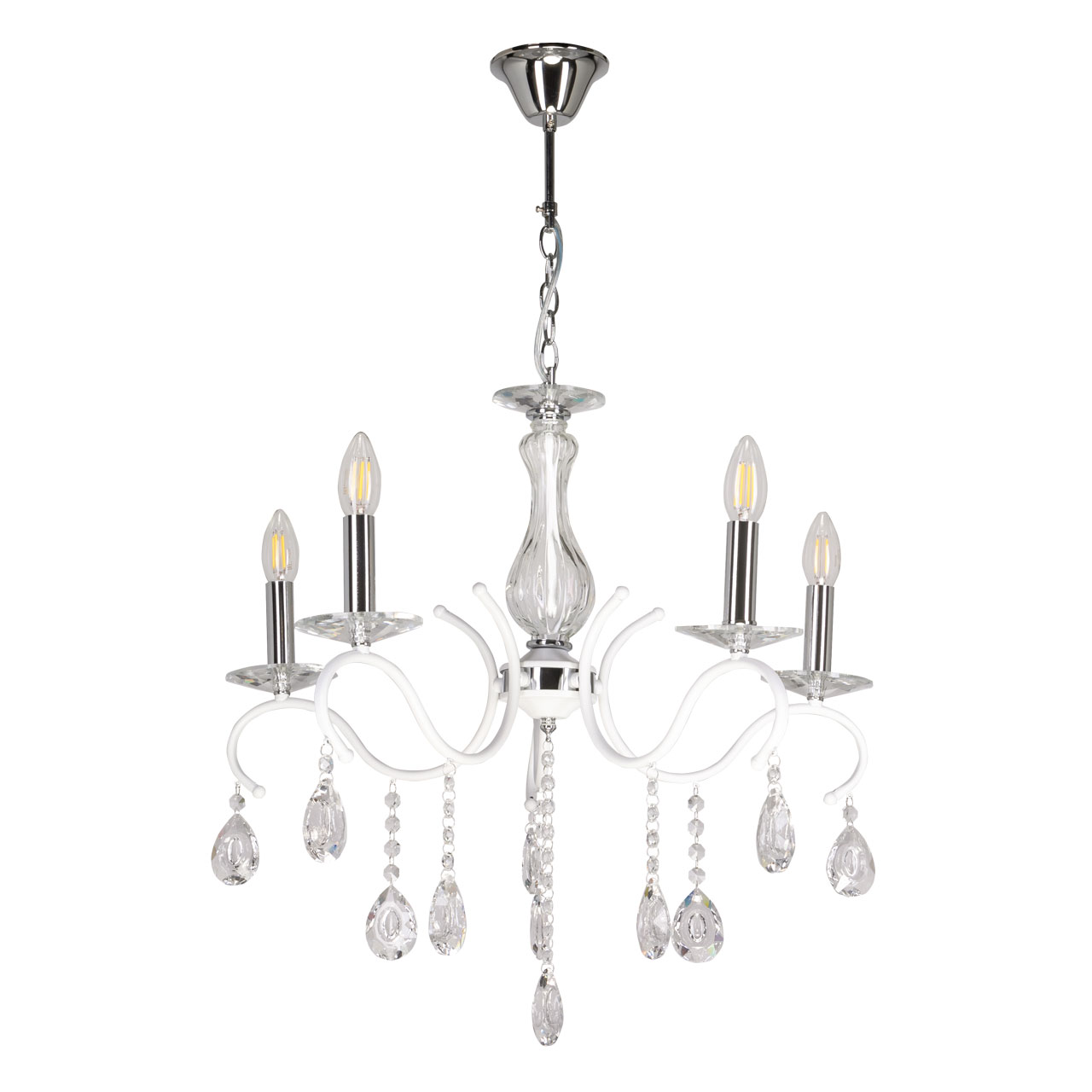 Металлическое основание светильника окрашено в белый цвет. Отдельные элементы основания гальванизированы в цвет хрома. Светильник декорирован выдувным стеклом и подвесками из хрусталя миндалевидной формы.
