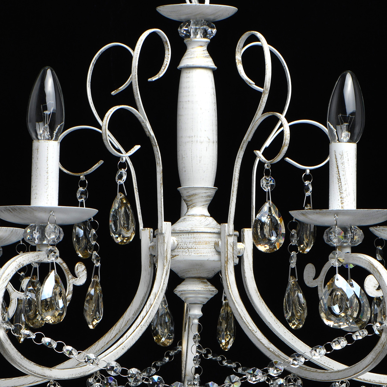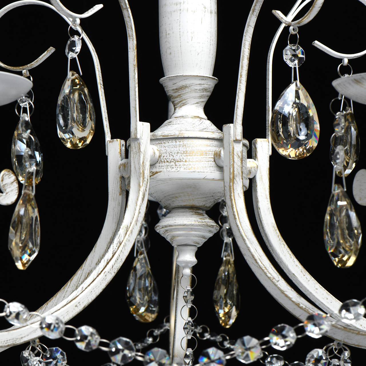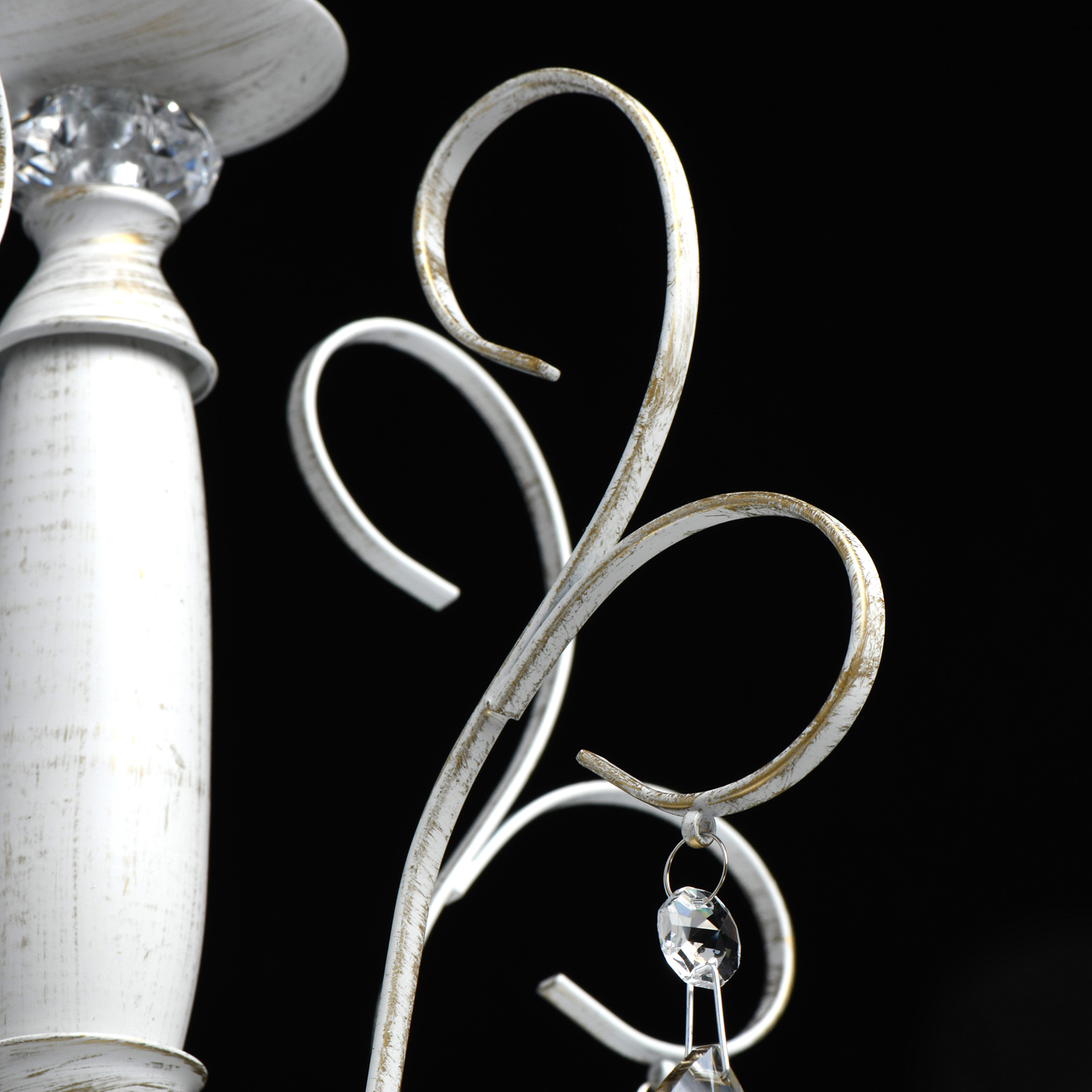 Основание светильника выполнено из металла и обработано по технологии хай-лайт, где основной слой белого цвет, а декоративный — золотого. Светильник декорирован прозрачным хрусталем формы октагон и хрусталем формы миндаль, гальванизированным в цвет шампань.