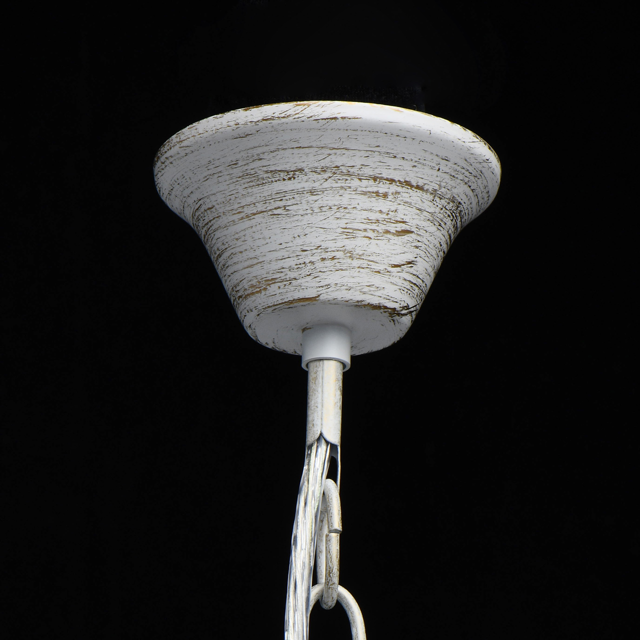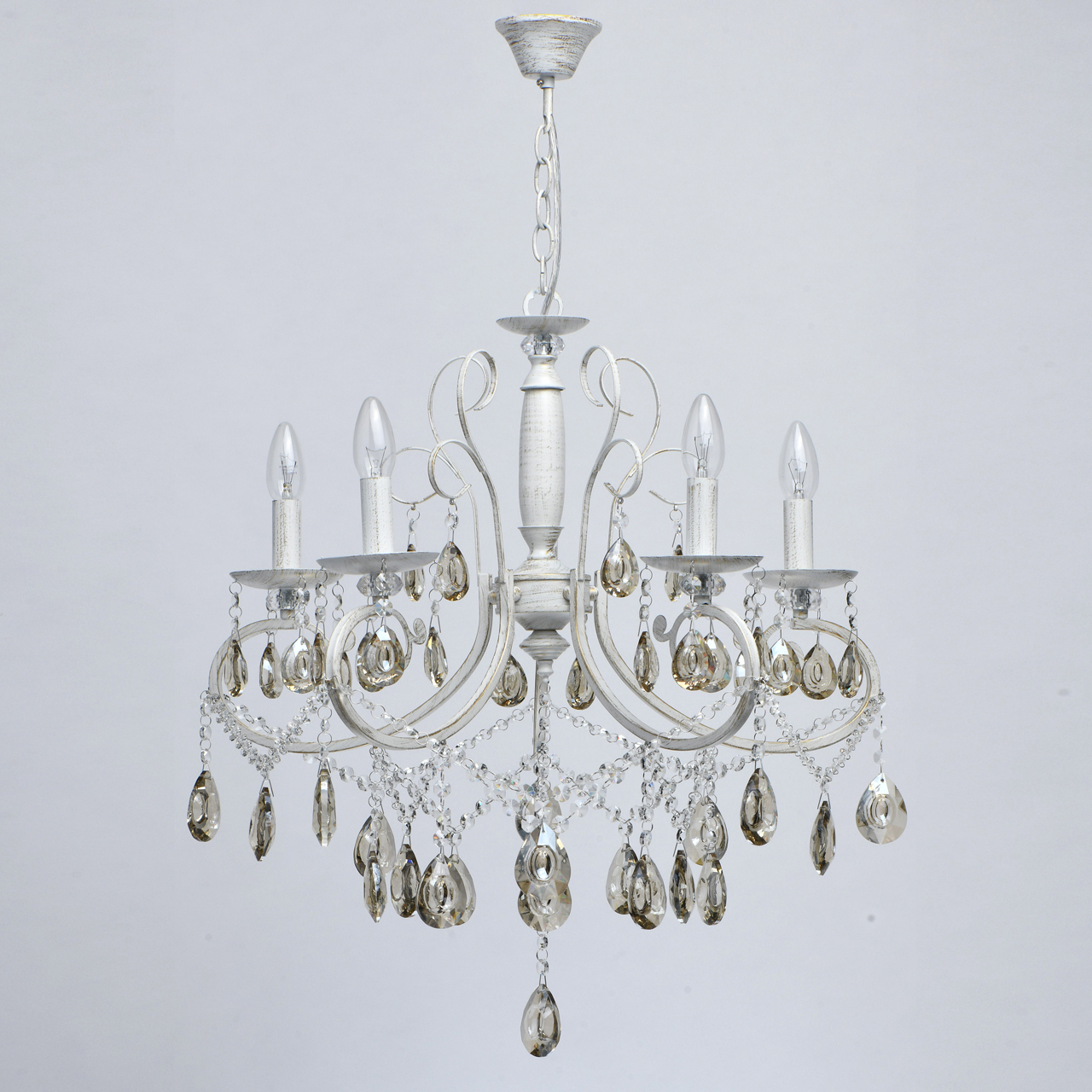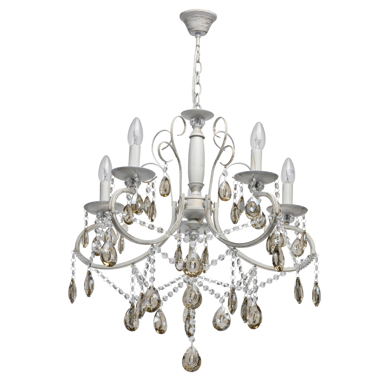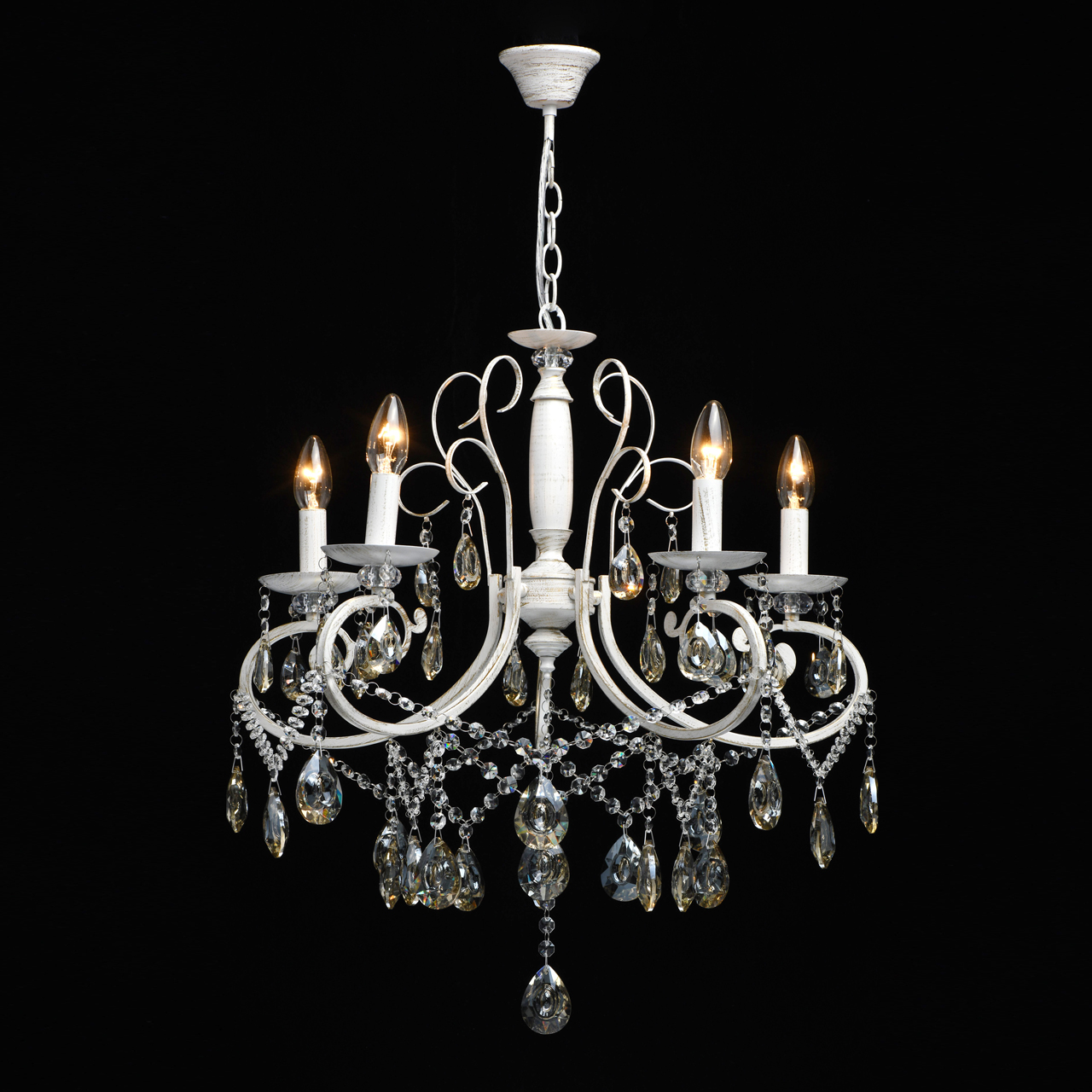 Основание светильника выполнено из металла и обработано по технологии хай-лайт, где основной слой белого цвет, а декоративный — золотого. Светильник декорирован прозрачным хрусталем формы октагон и хрусталем формы миндаль, гальванизированным в цвет шампань.