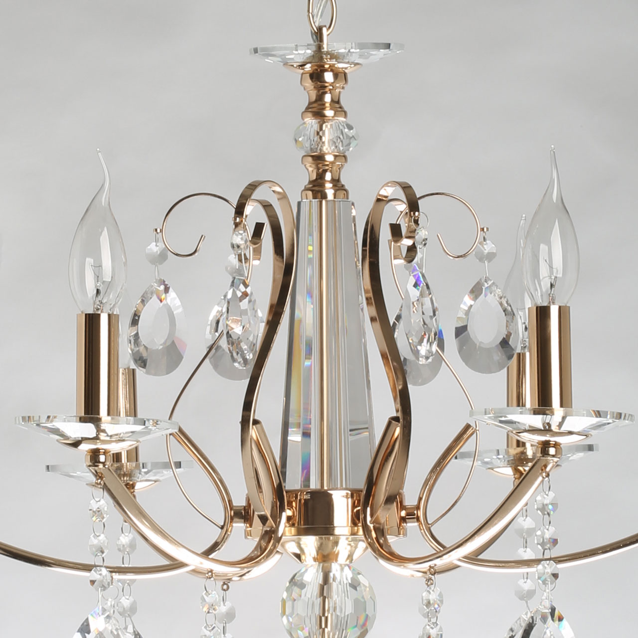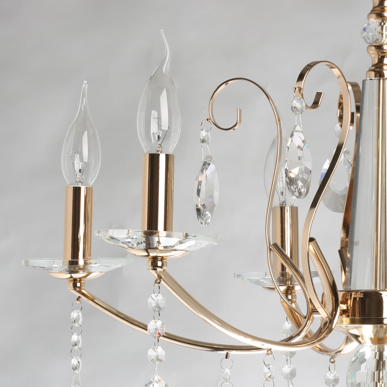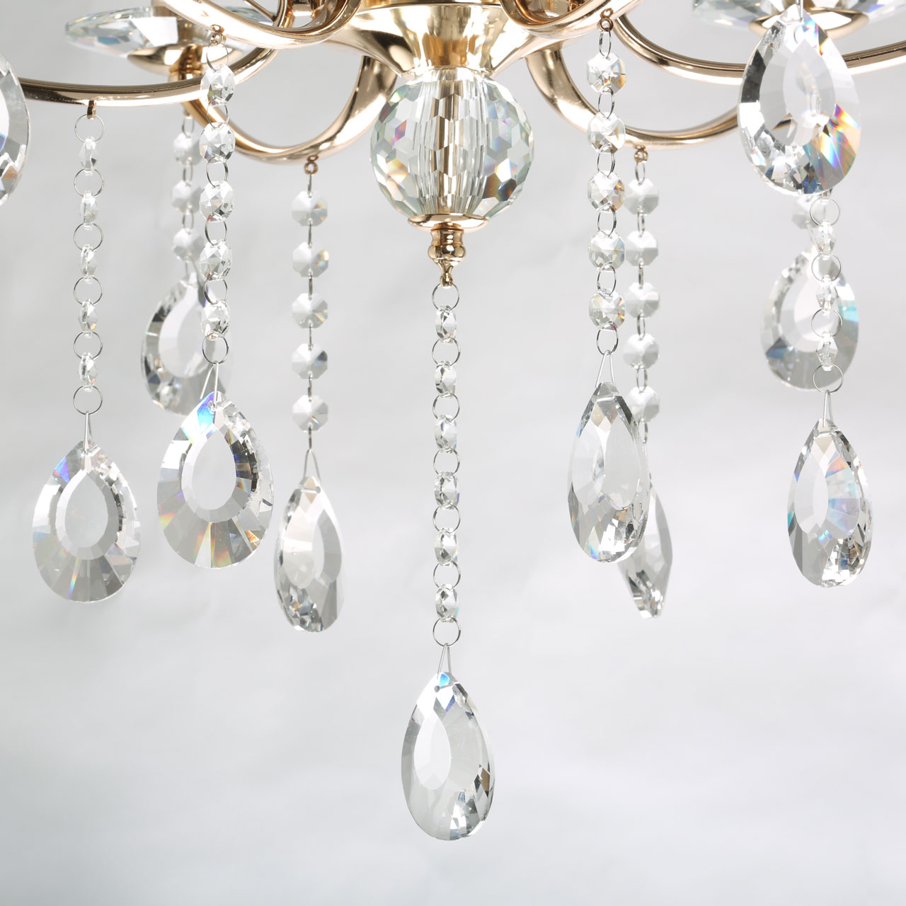 Металлическое основание подвесного светильника гальванизировано в цвет золота. Светильник декорирован прозрачным хрусталем.