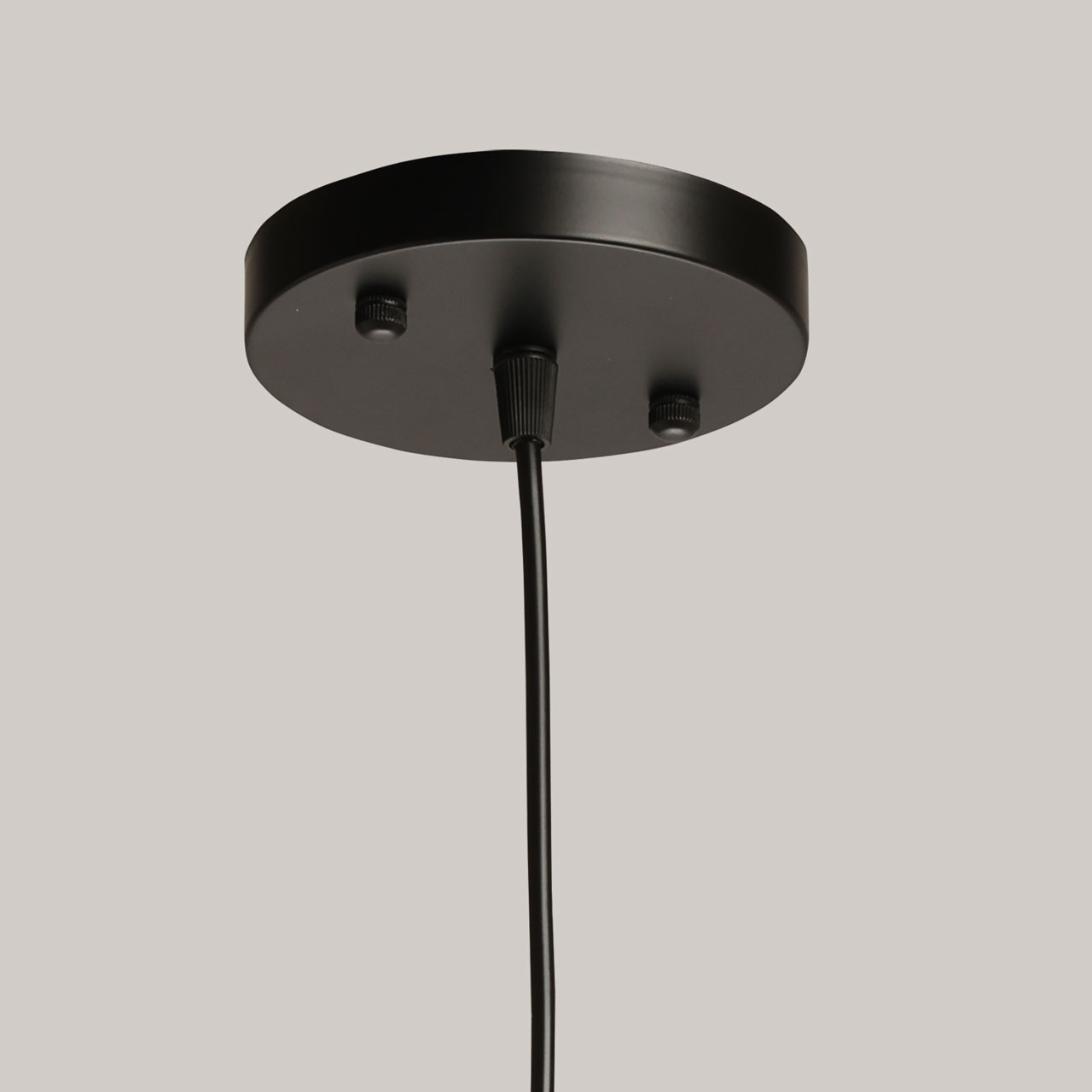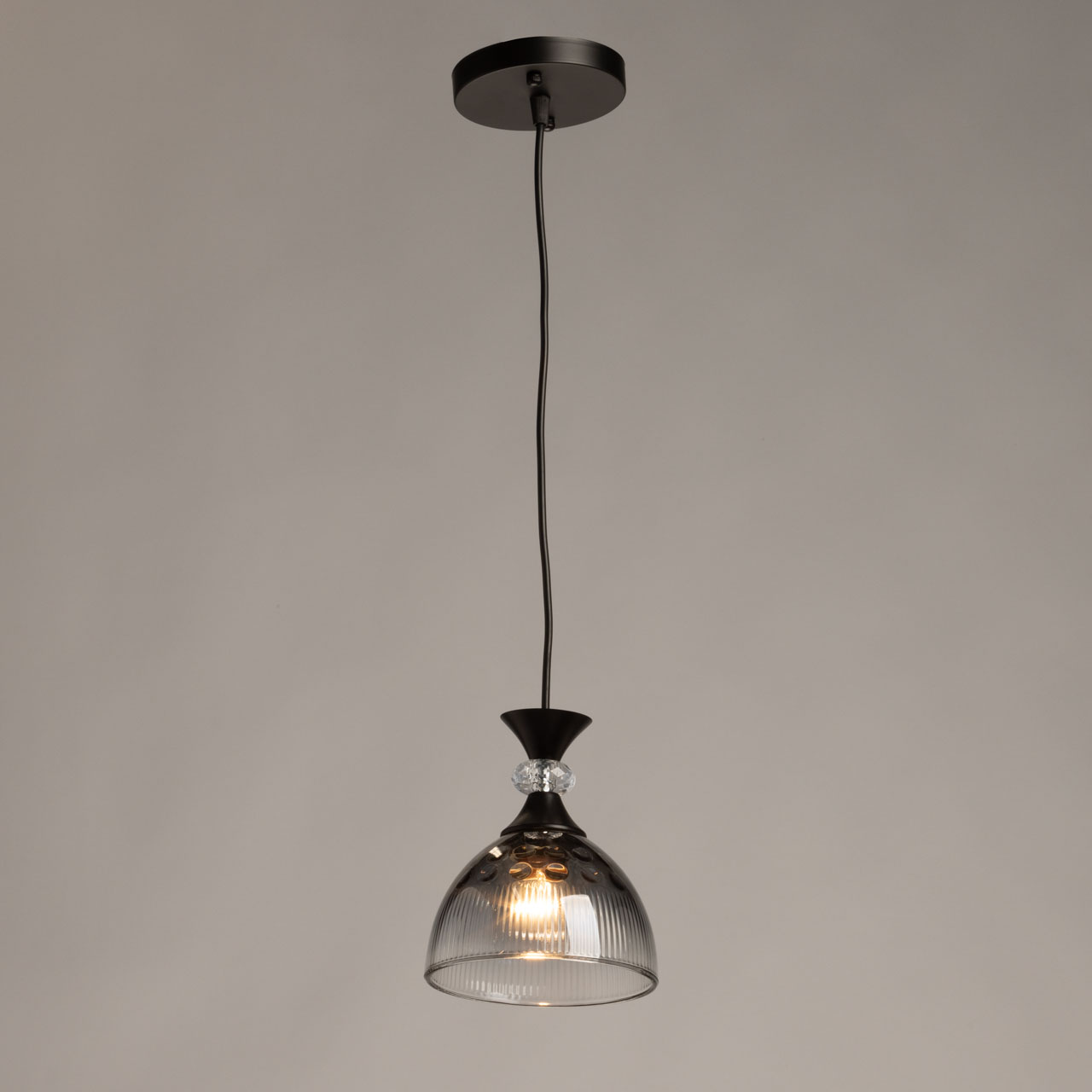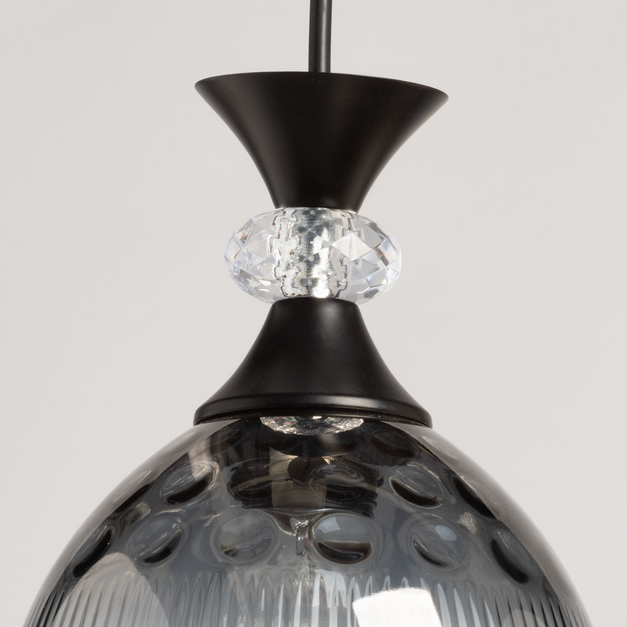 Металлическое основание светильника окрашено в черный цвет. Стеклянный плафон отлит в сложную форму и гальванизирован в дымчатый цвет с эффектом градиента от темного к светлому. Декоративный элемент на подвесе выполнен из акрила.