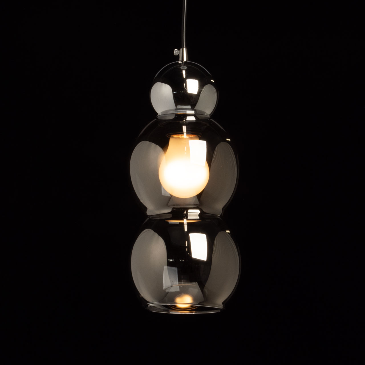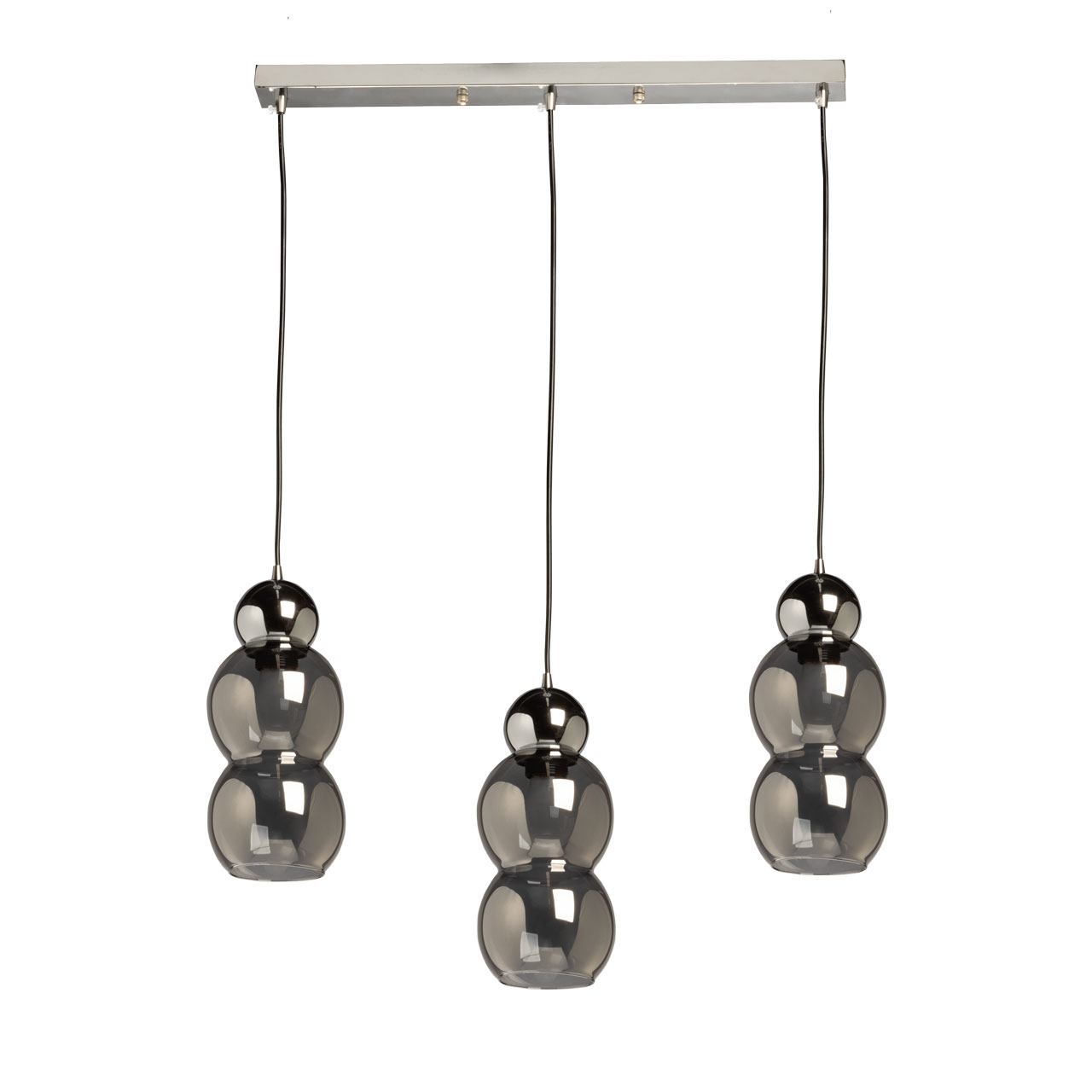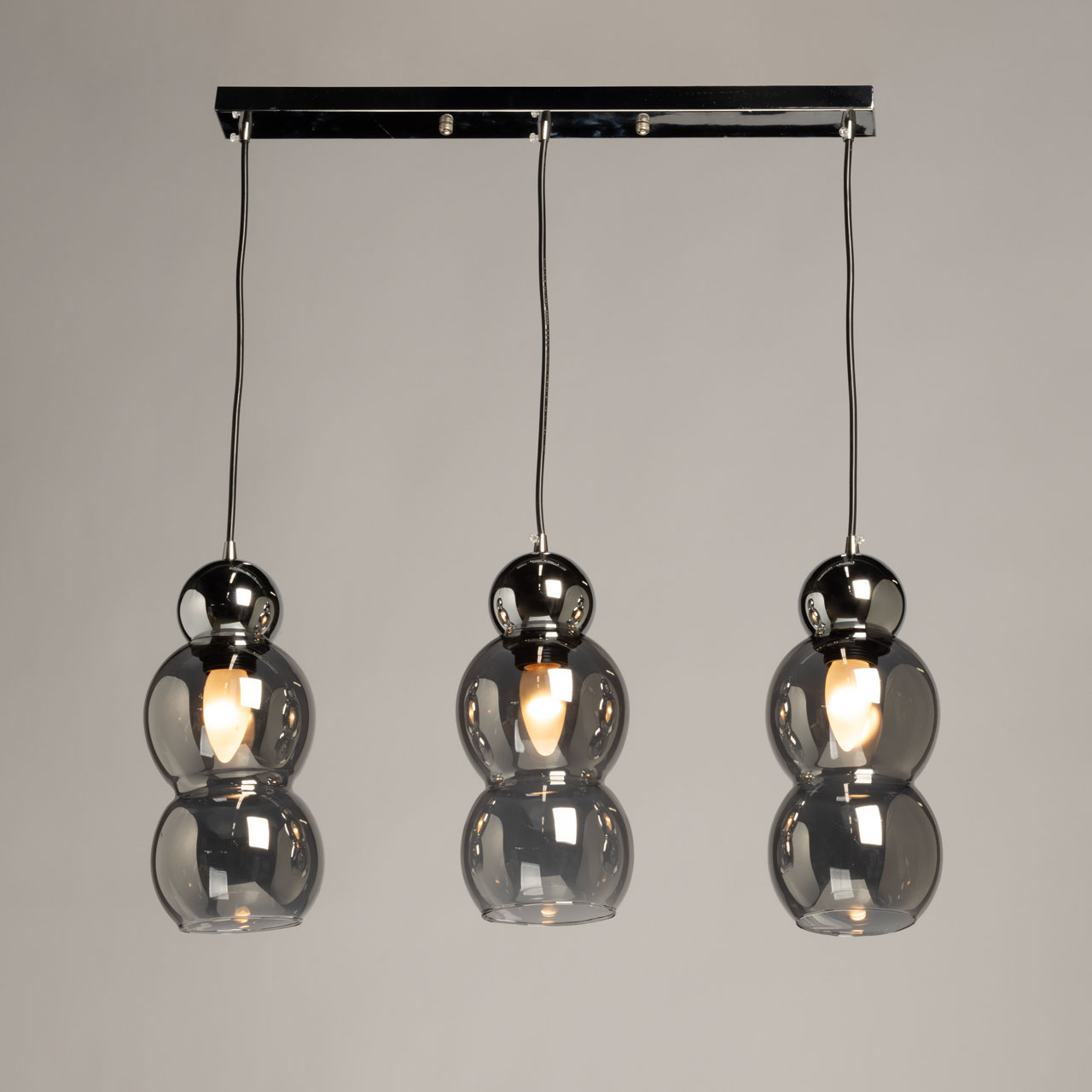Металлическое основание подвеса гальванизировано в цвет хрома. Стеклянные плафоны отлиты в сложную форму и гальванизированы в дымчатый цвет.