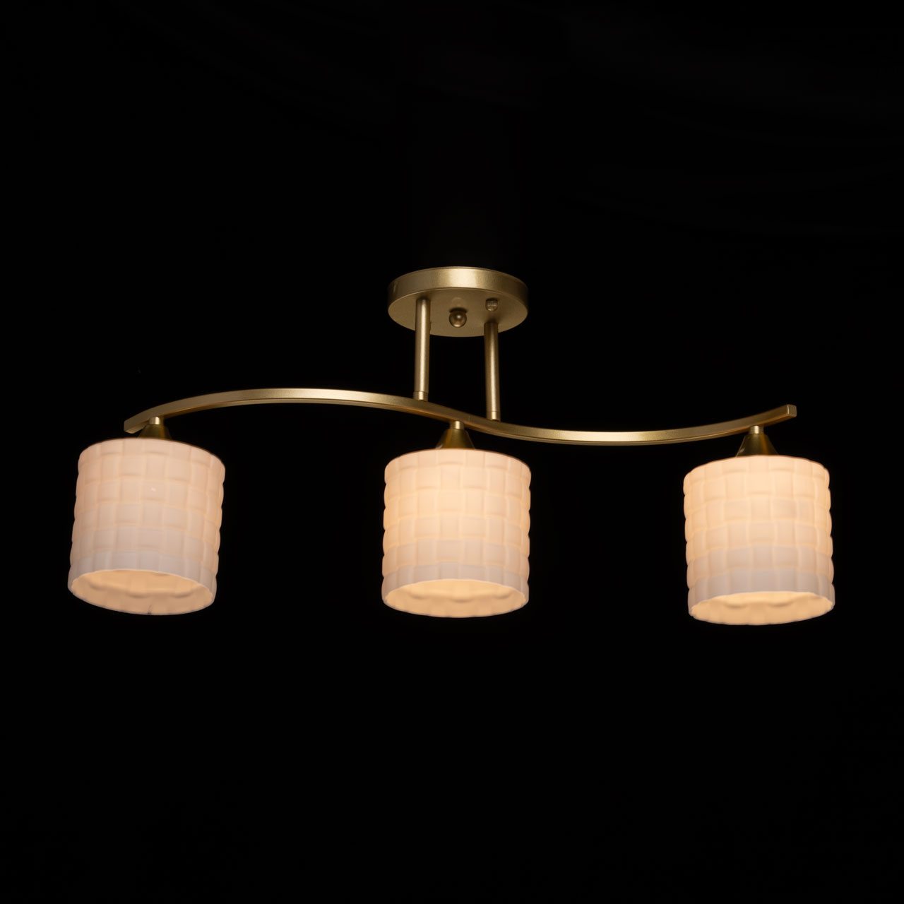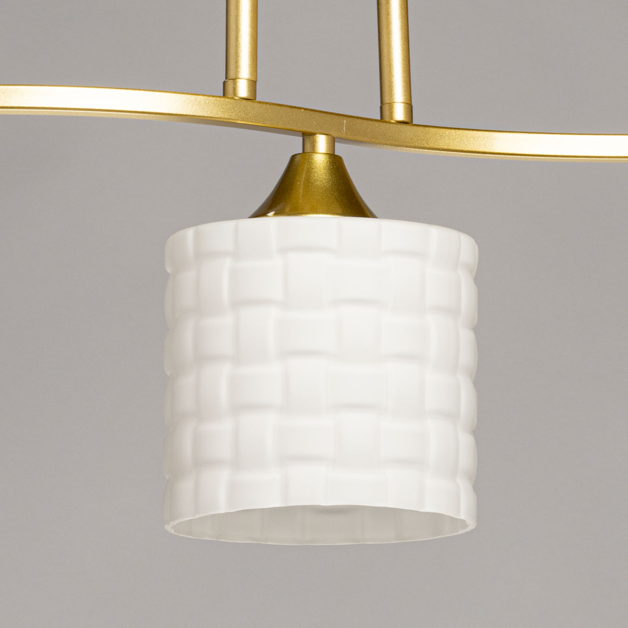 Металлическое основание потолочной люстры окрашено в цвет золота. Стеклянные плафоны отлиты в сложную форму и окрашены в белый цвет.