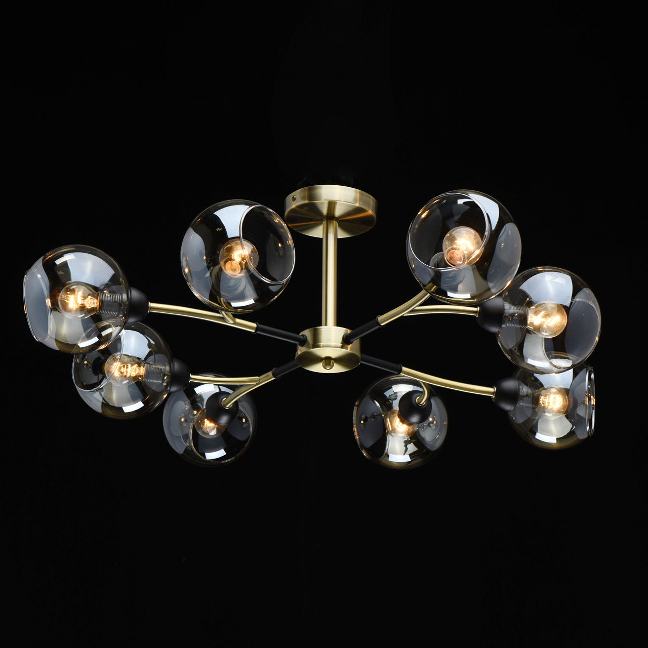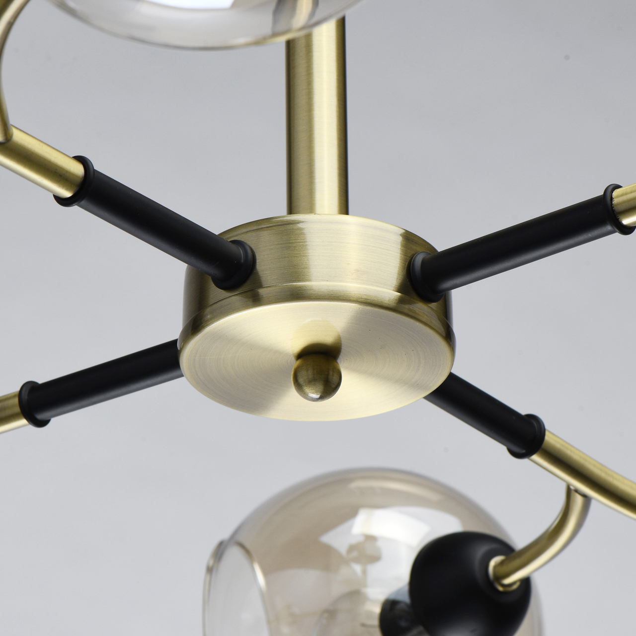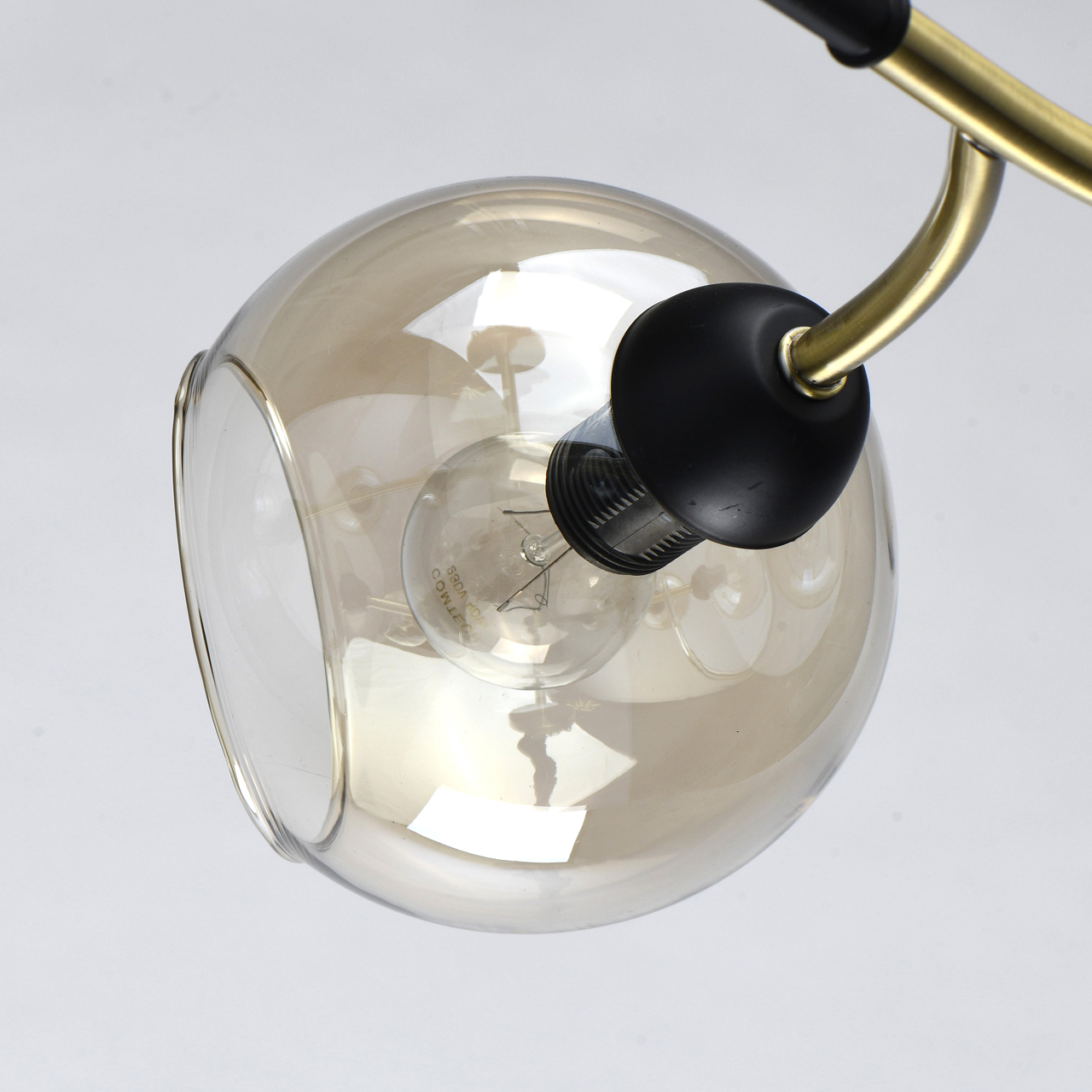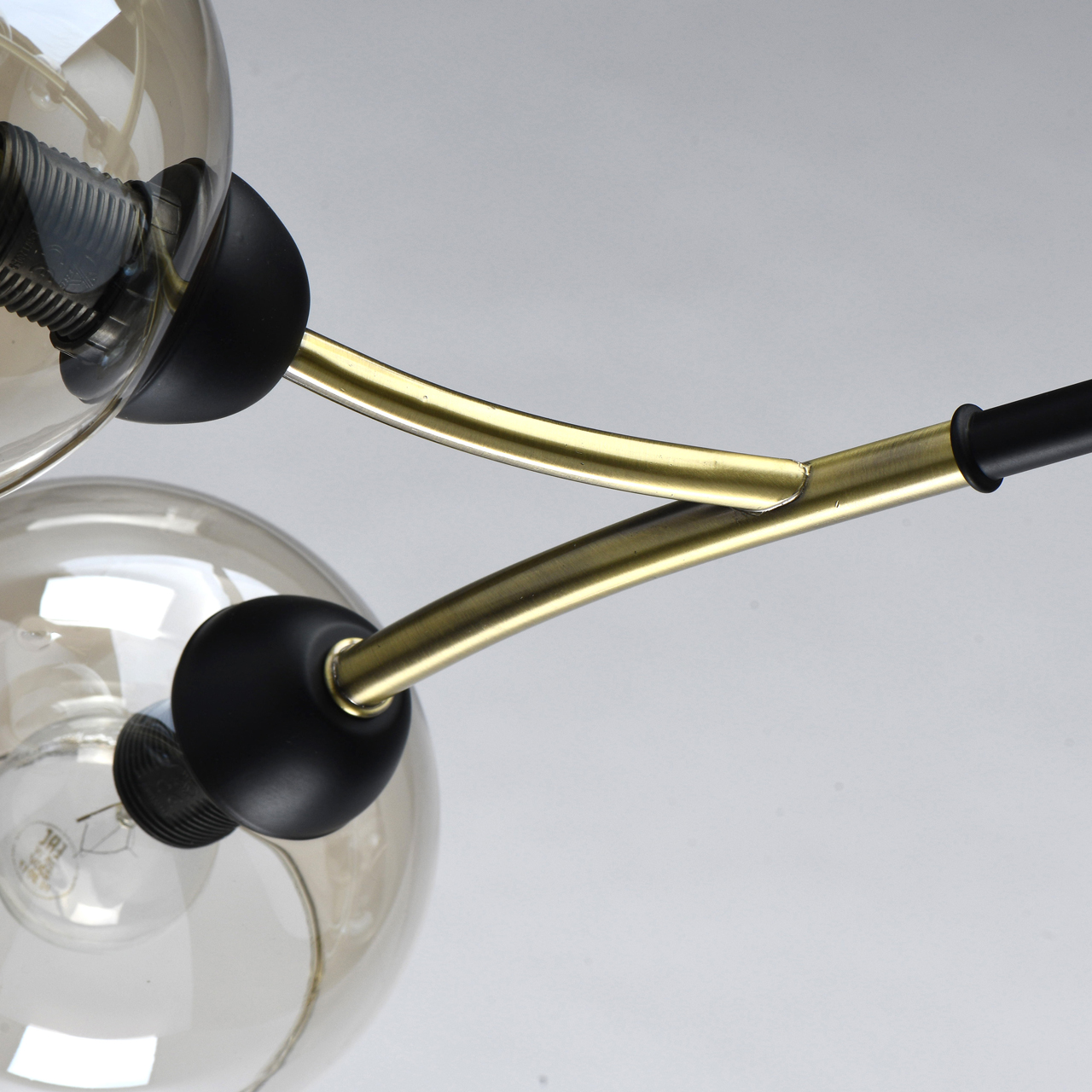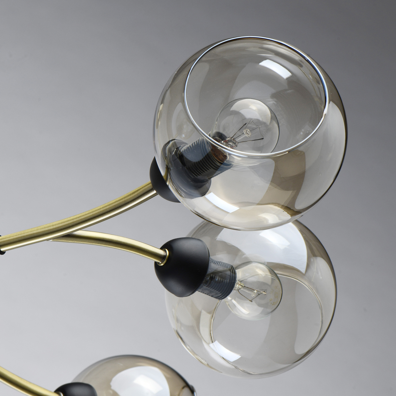 Основание светильника выполнено из металла и окрашено в черный цвет. Отдельные элементы основания гальванизированы в цвет латуни. Стеклянные плафоны отлиты в сложную форму и гальванизированы в цвет шампань.