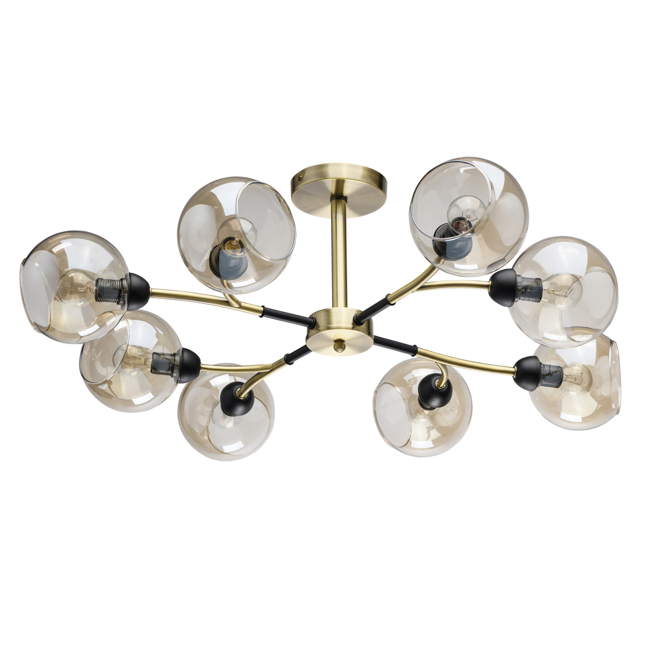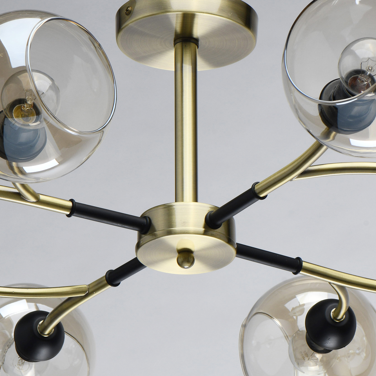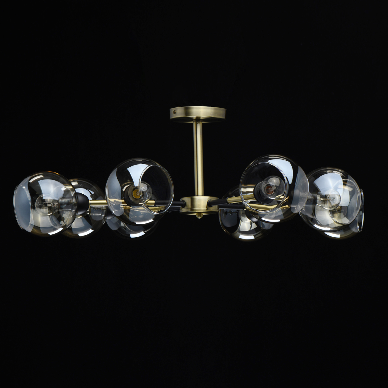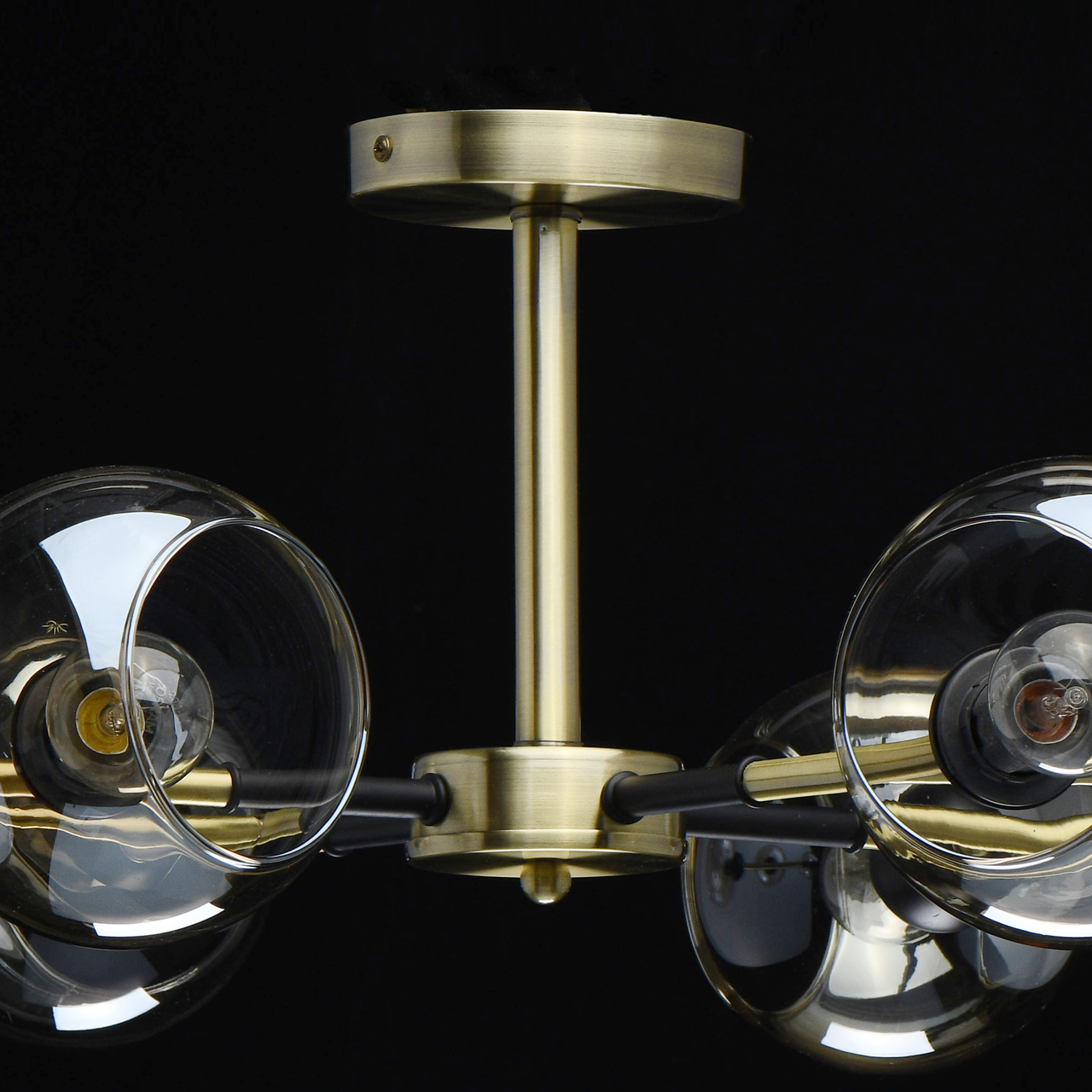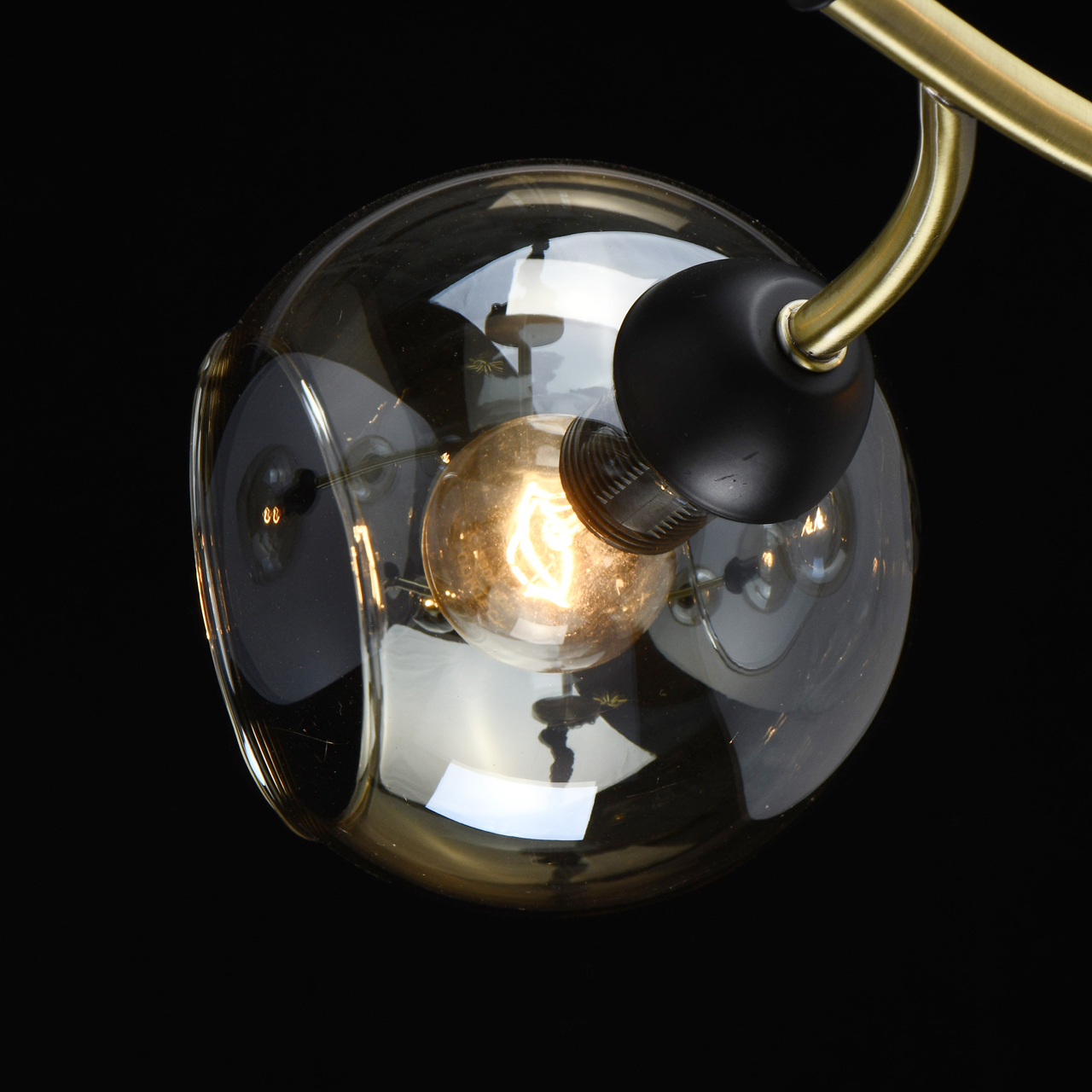 Основание светильника выполнено из металла и окрашено в черный цвет. Отдельные элементы основания гальванизированы в цвет латуни. Стеклянные плафоны отлиты в сложную форму и гальванизированы в цвет шампань.