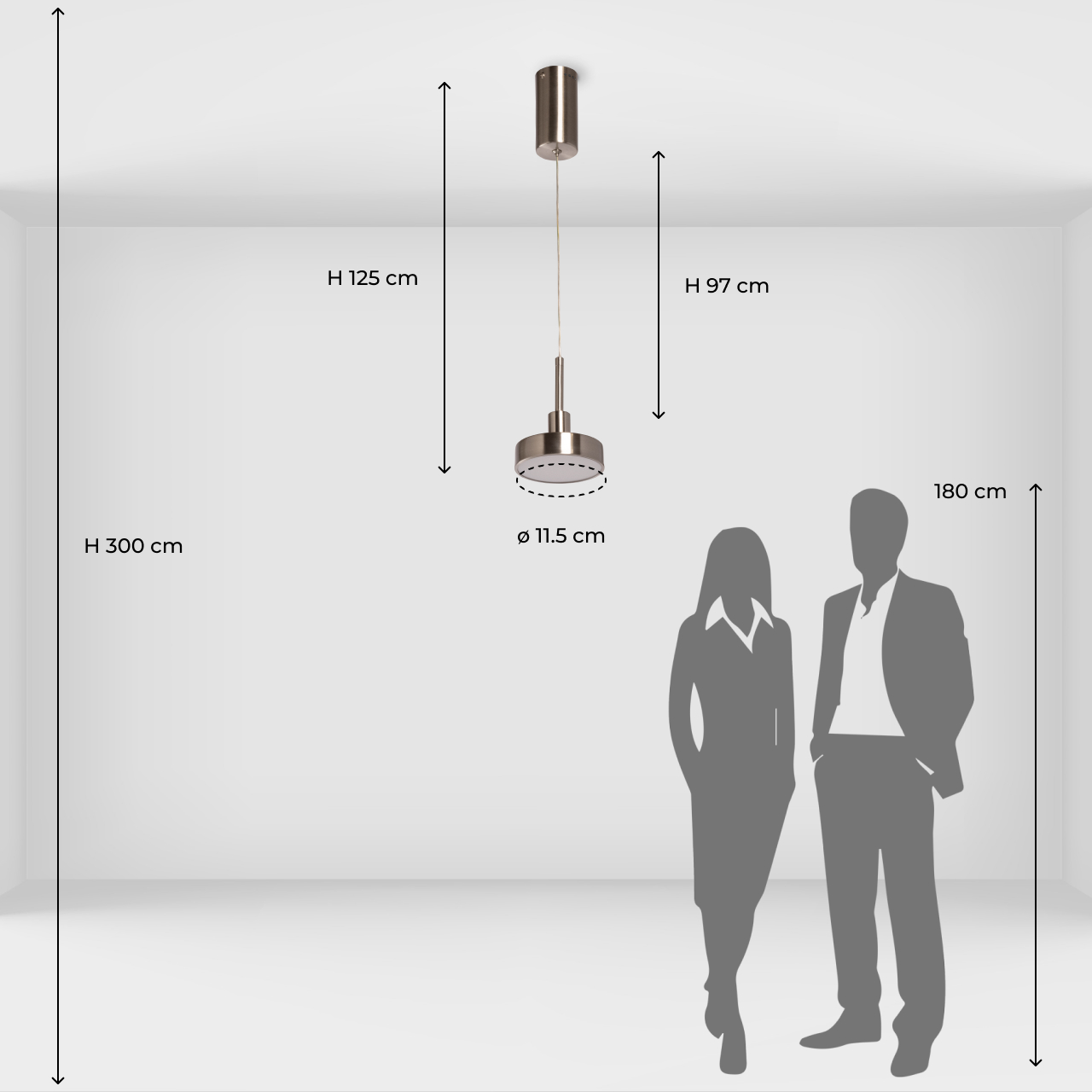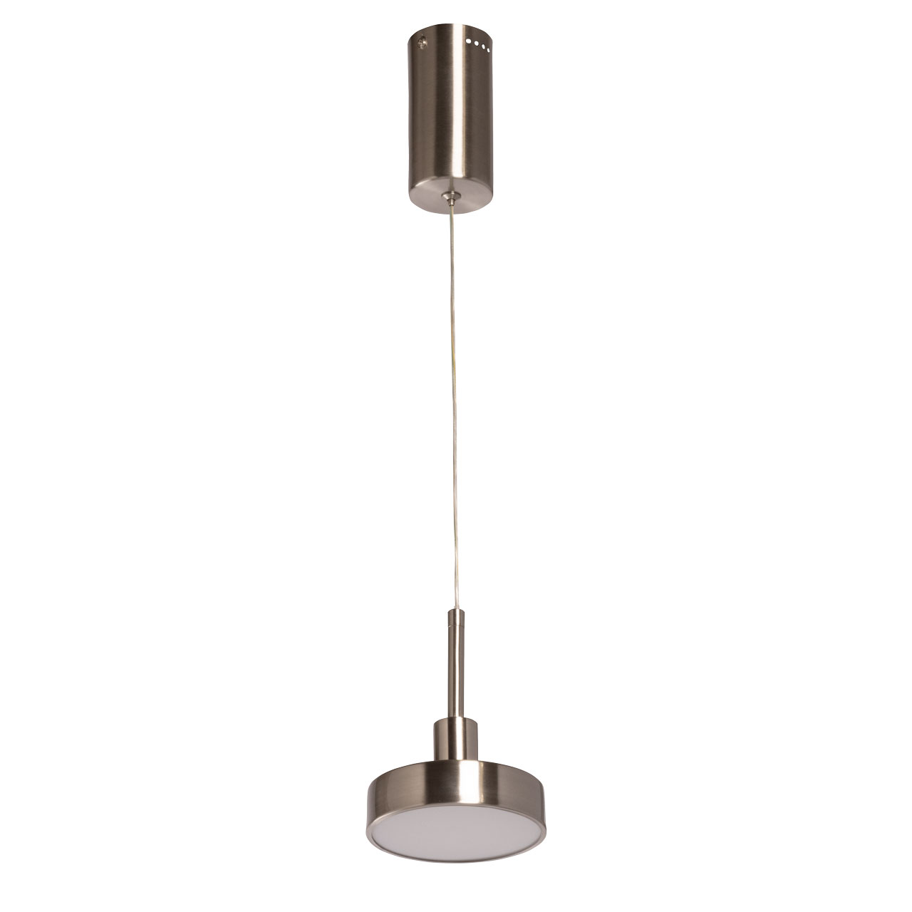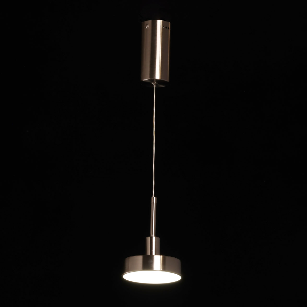 Металлическое основание подвеса гальванизировано в цвет никеля. Корпус плафона выполнен из сплава алюминия и гальванизирован в цвет основания. Светодиодный источник света закрыт матовым акрилом.