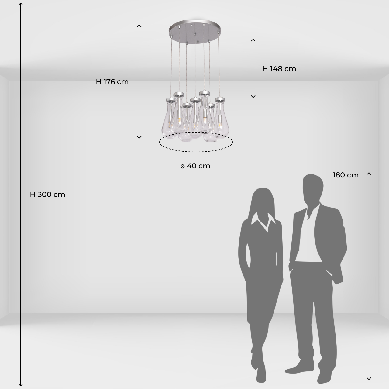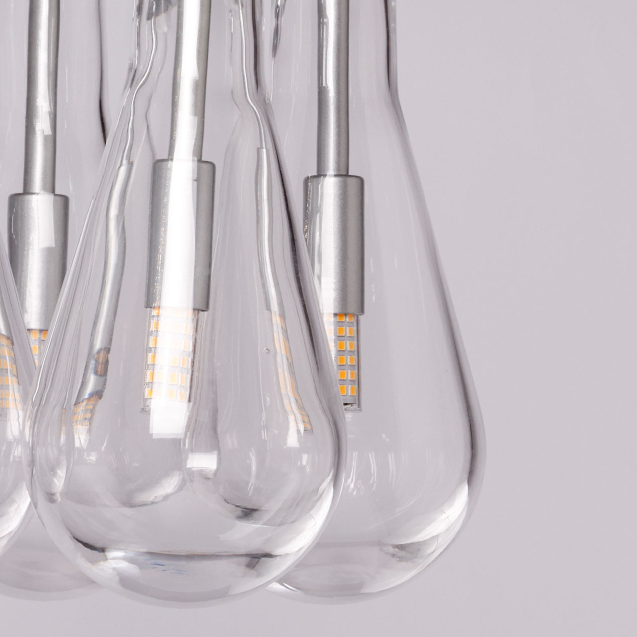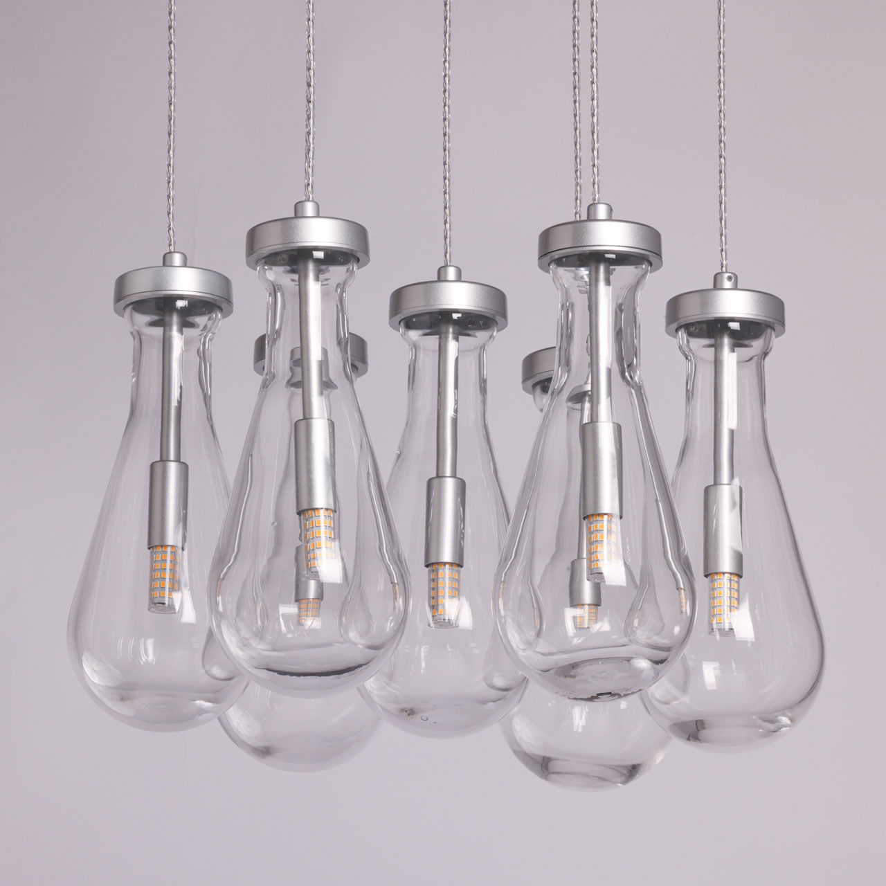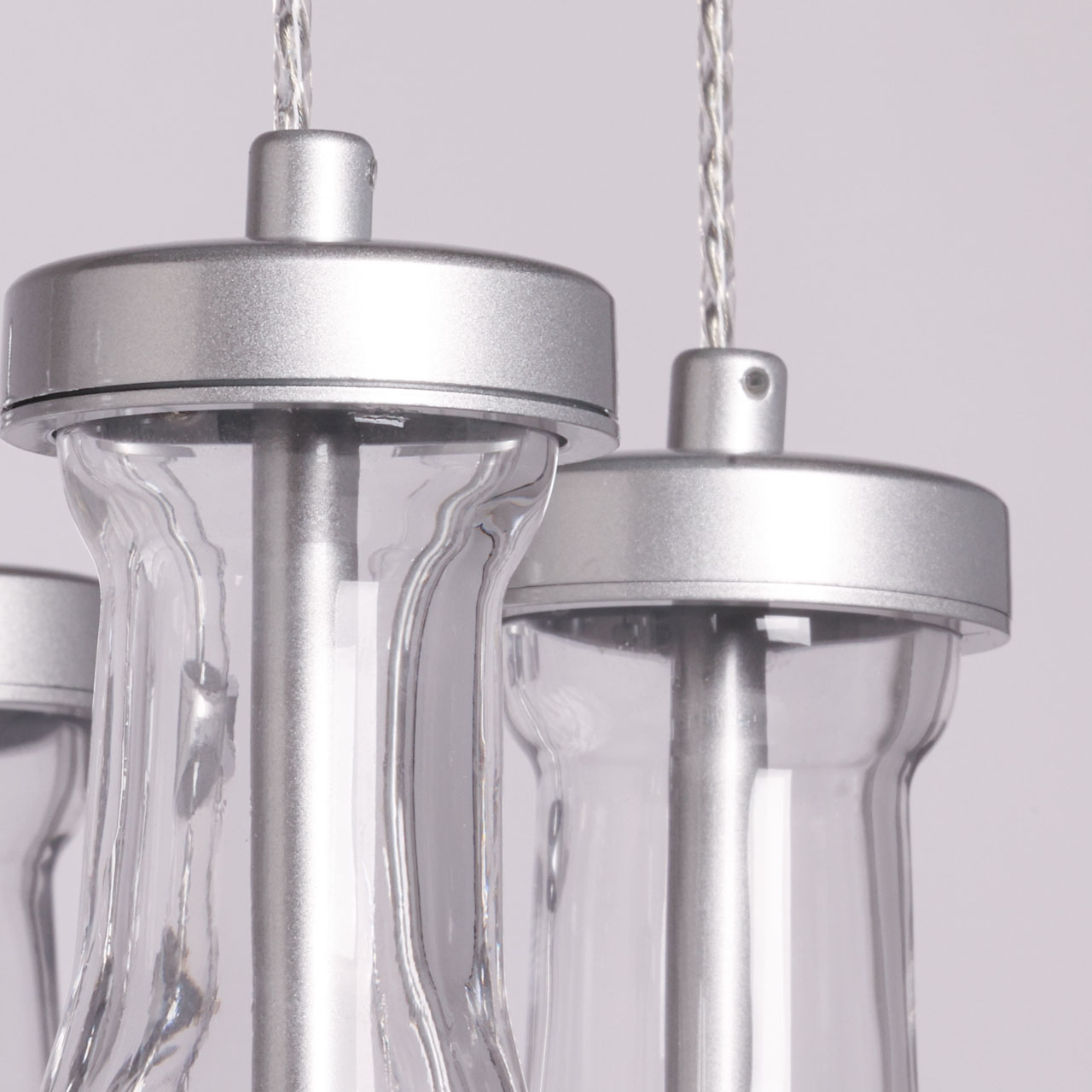 Металлическое основание подвесной люстры окрашено в цвет матового серебра. Светильник декорирован оригинальными плафонами обтекаемой формы, выполненными из прозрачного, выдувного вручную стекла