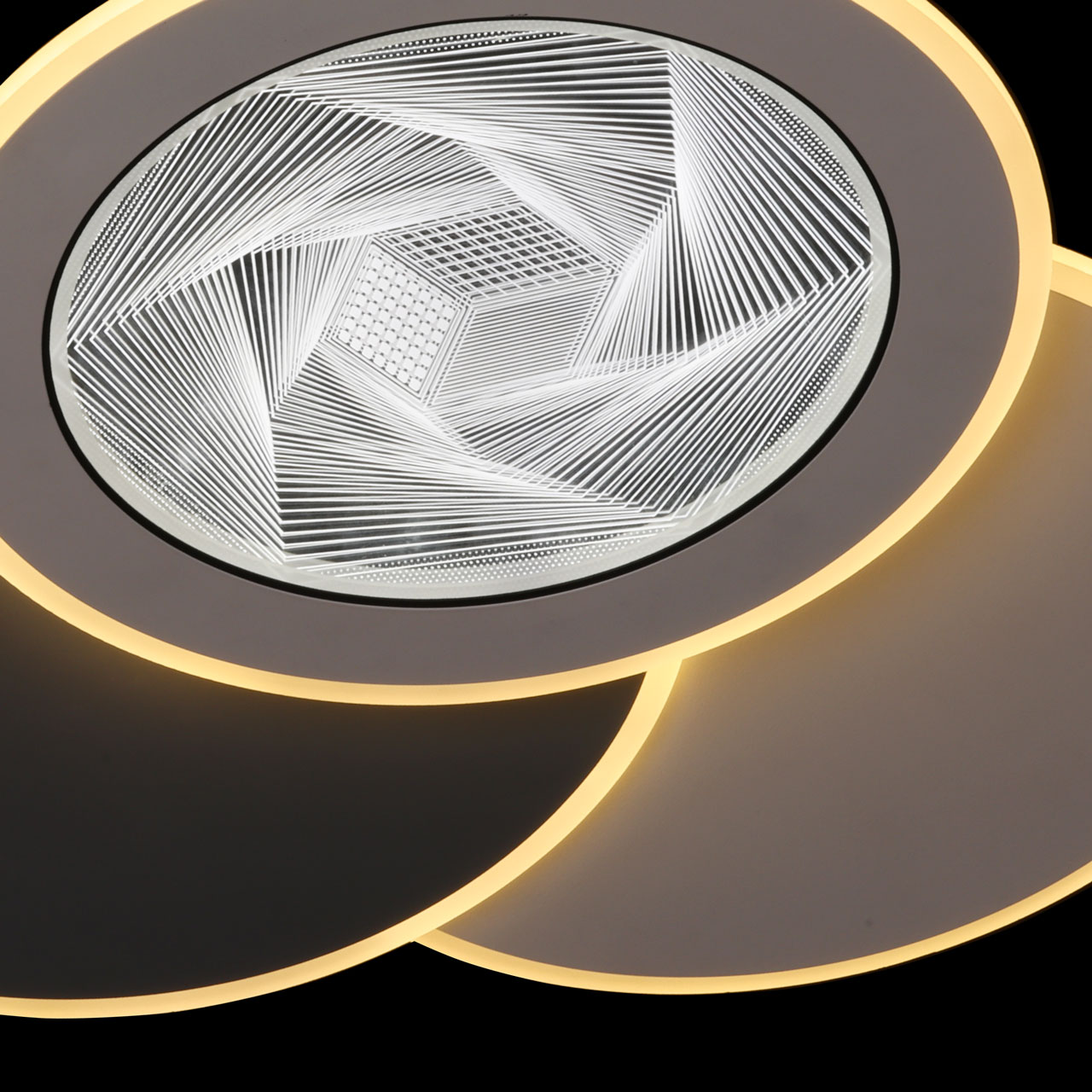 Металлическое основание потолочной люстры окрашено в белый цвет. Корпус плафонов выполнен из сплава алюминия с цинком и окрашен в белый и серый цвета. Светодиодные источники света закрыты матовым акрилом с 3D-эффектом.