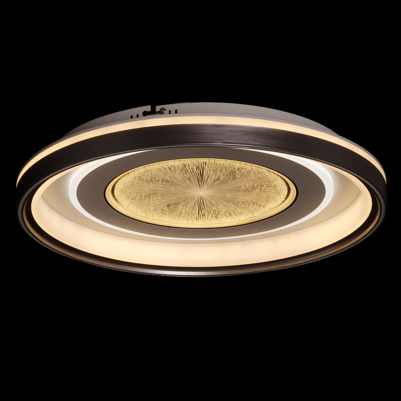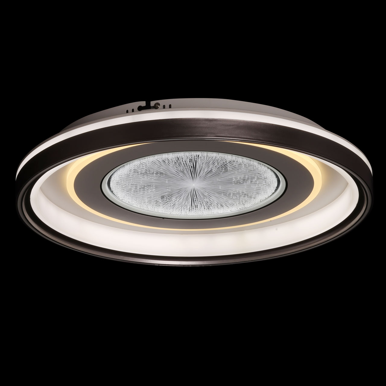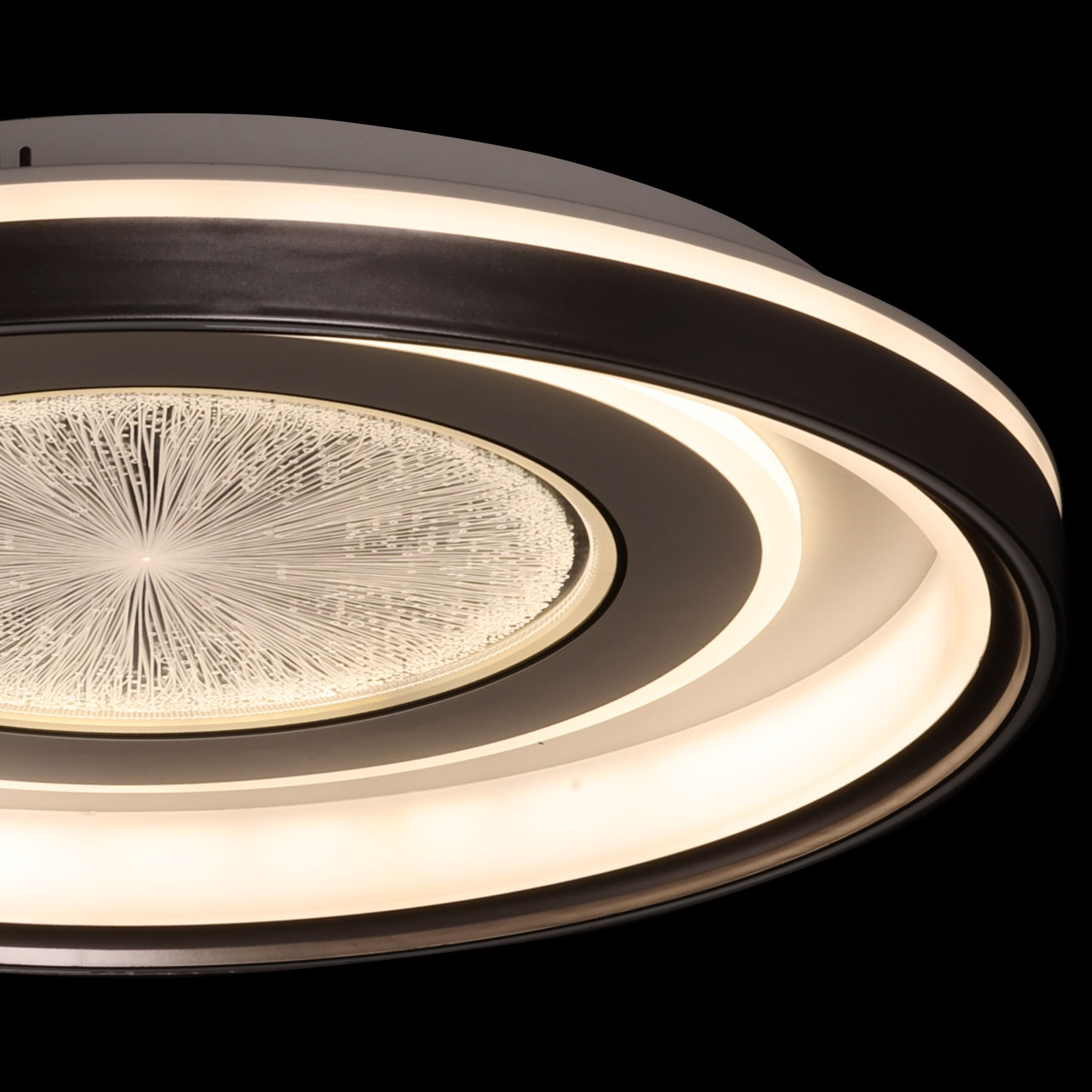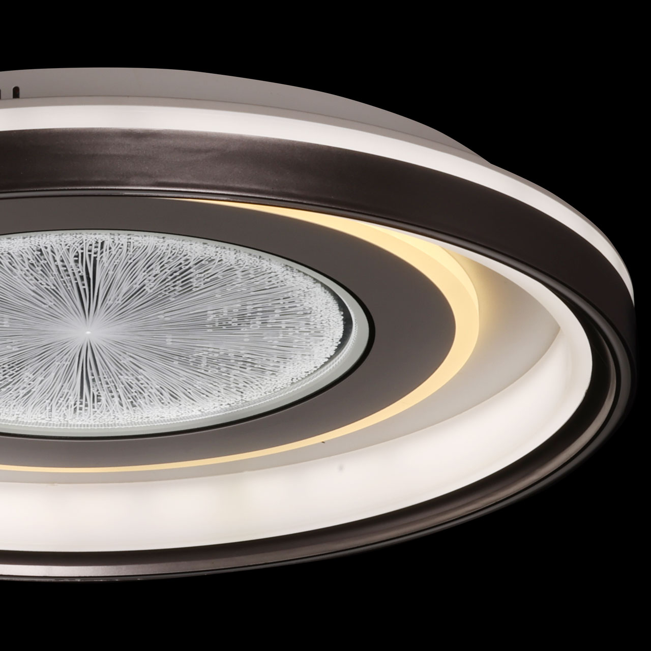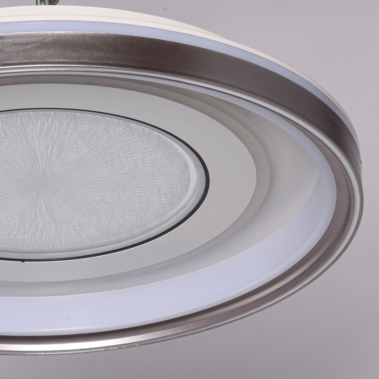 Металлическое основание потолочной люстры окрашено в белый цвет. Корпус плафона выполнен из сплава алюминия с цинком и окрашен в серый и белый цвета. Светодиодные источники света закрыты прозрачным акрилом с 3D-эффектом. Светодиоды по периметру плафона закрыты белым матовым силиконом.