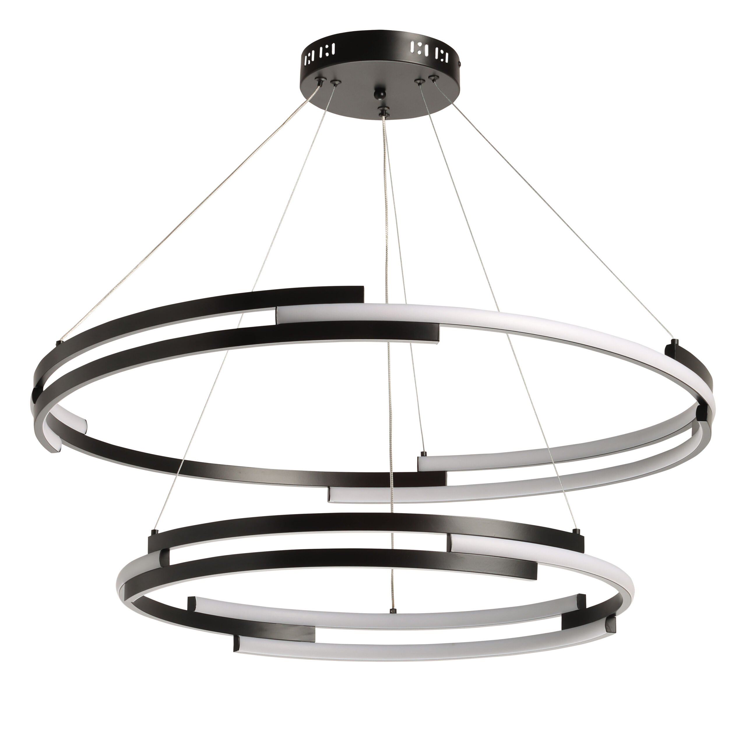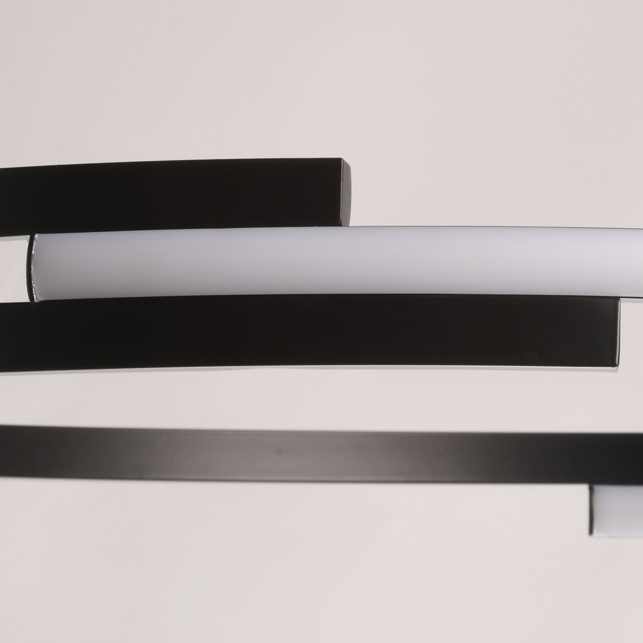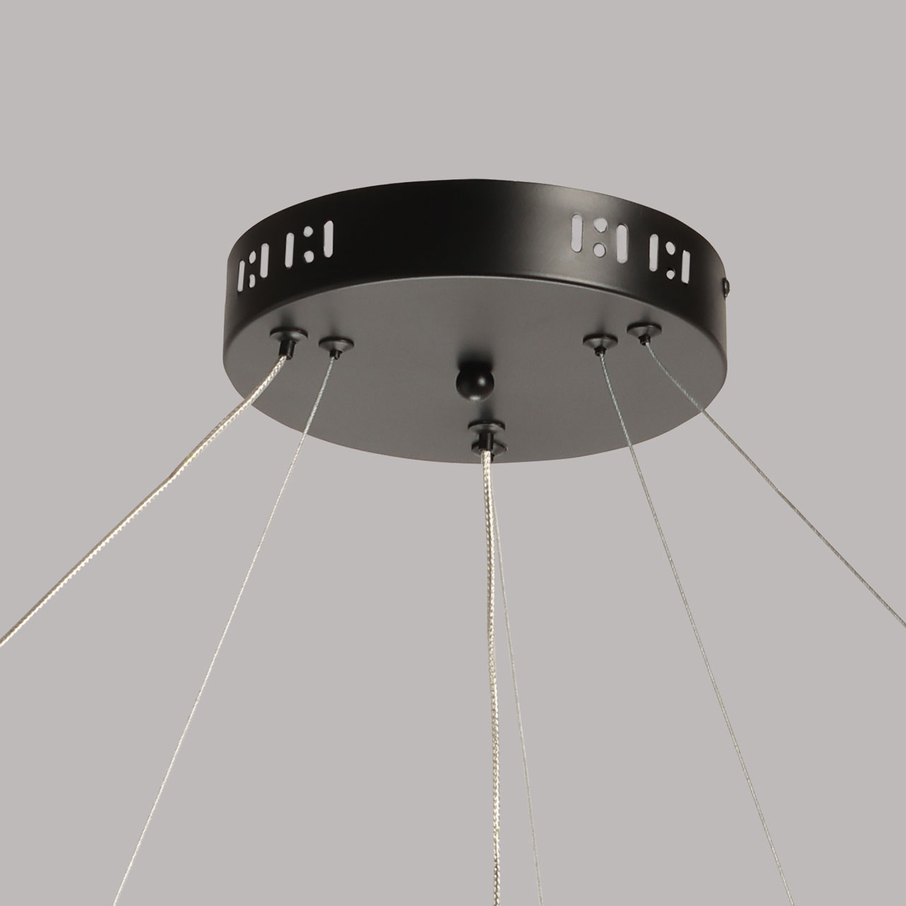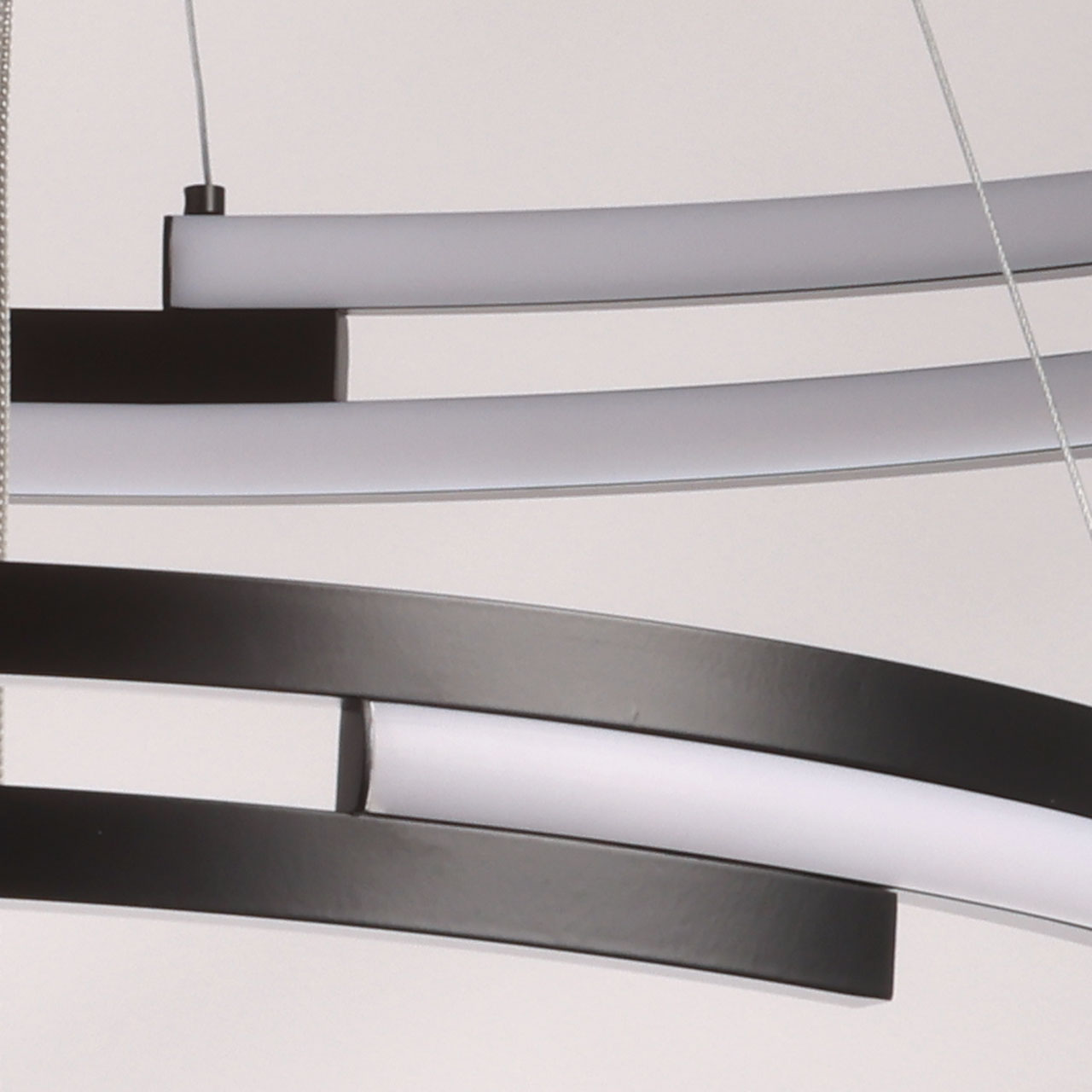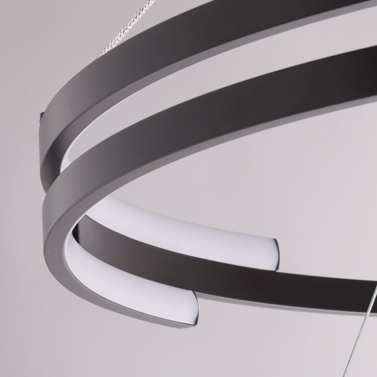 Металлическая потолочная чаша подвесной люстры окрашена в черный цвет. Плафон выполнен из сплава алюминия с цинком и окрашен в цвет основания. Светодиодные источники света закрыты белым матовым силиконом.