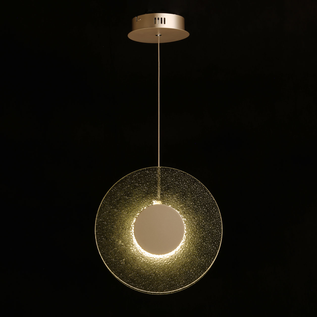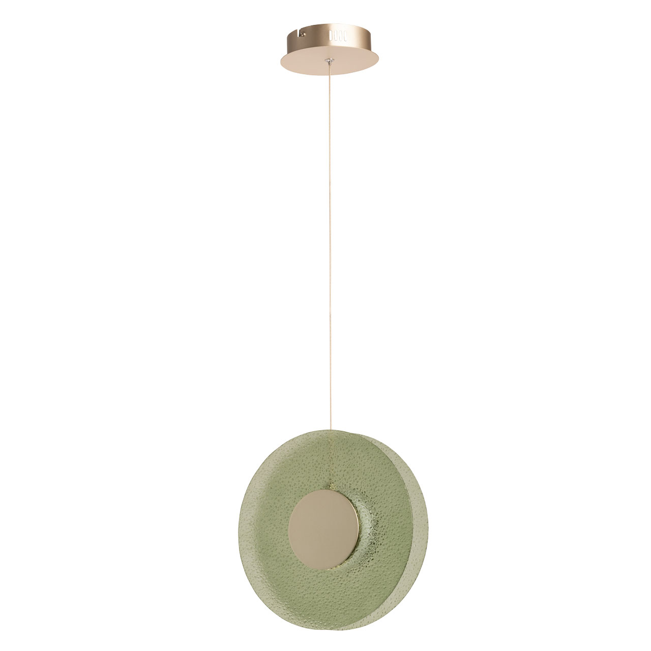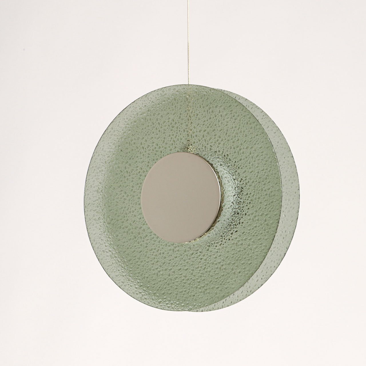Металлическое основание подвеса гальванизировано в цвет никеля. Корпус плафона выполнен из сплава алюминия с цинком и гальванизирован в цвет основания. Светодиодные источники света закрыты матовым акрилом. Подвес декорирован фактурным стеклом, окрашенным в массе в зеленый цвет.