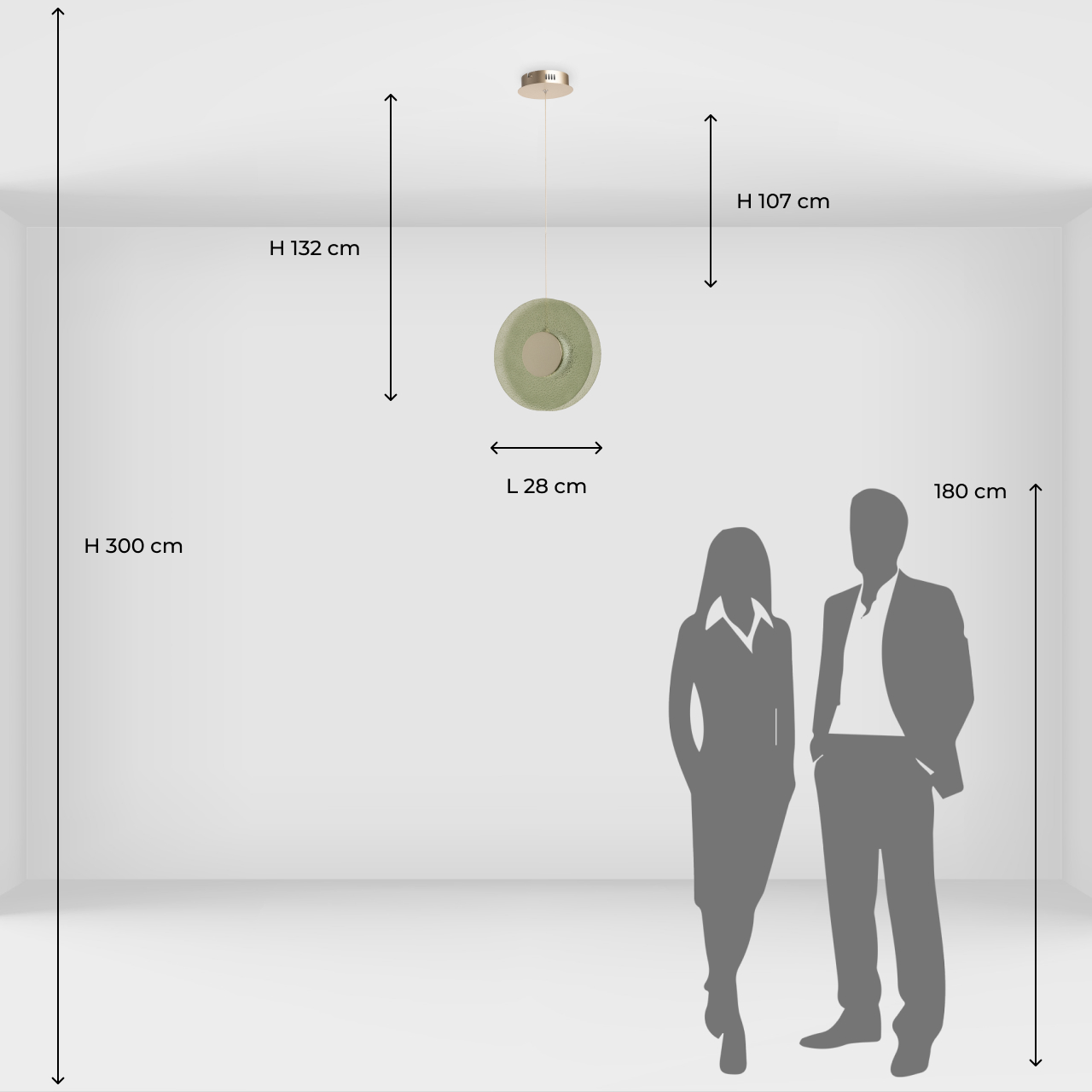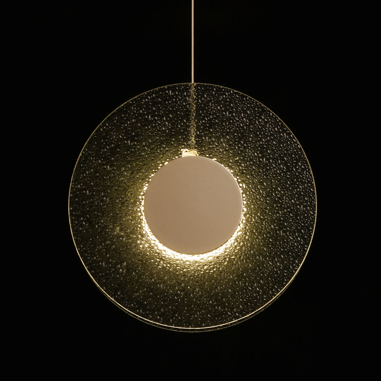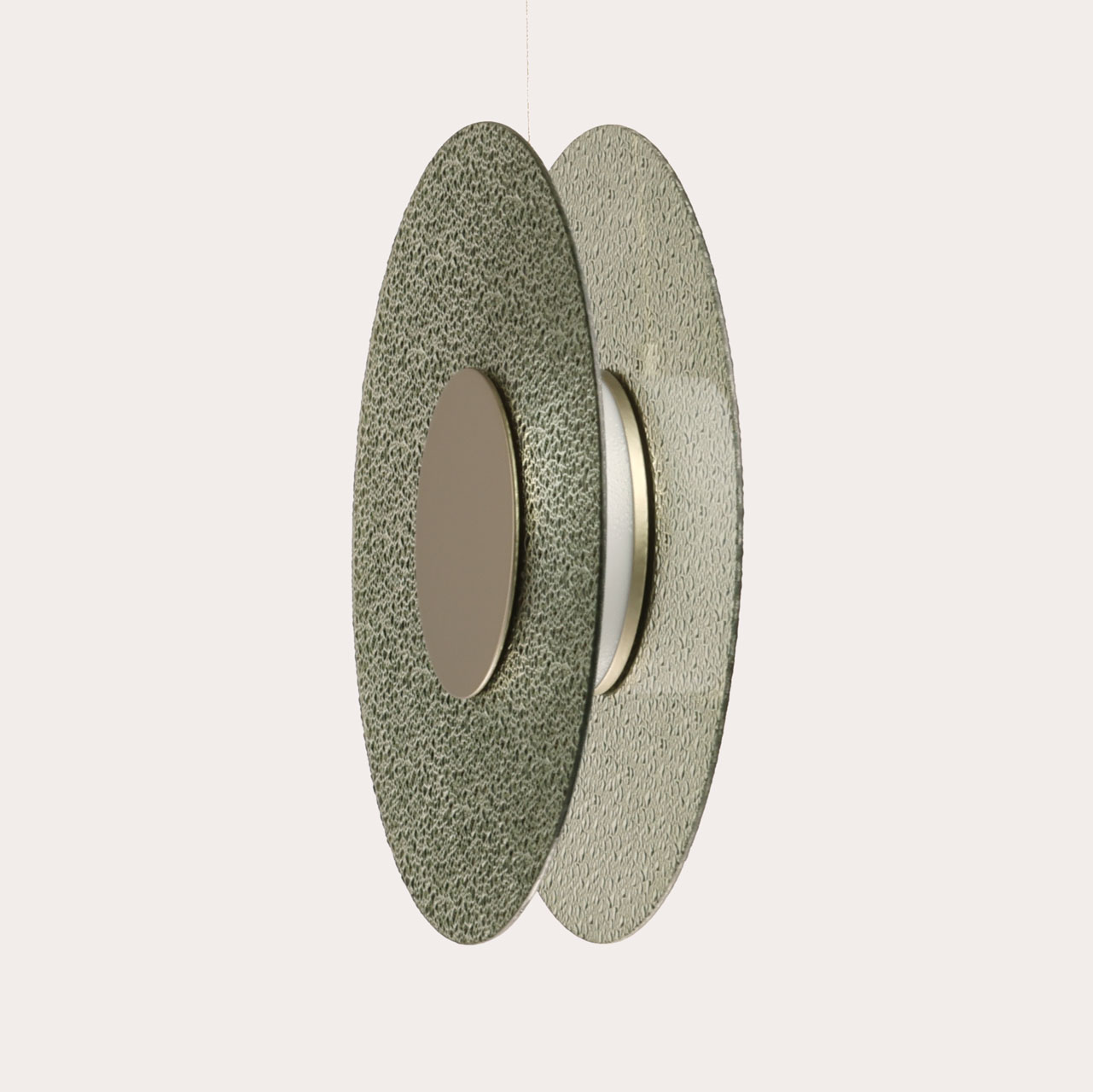 Металлическое основание подвеса гальванизировано в цвет никеля. Корпус плафона выполнен из сплава алюминия с цинком и гальванизирован в цвет основания. Светодиодные источники света закрыты матовым акрилом. Подвес декорирован фактурным стеклом, окрашенным в массе в зеленый цвет.