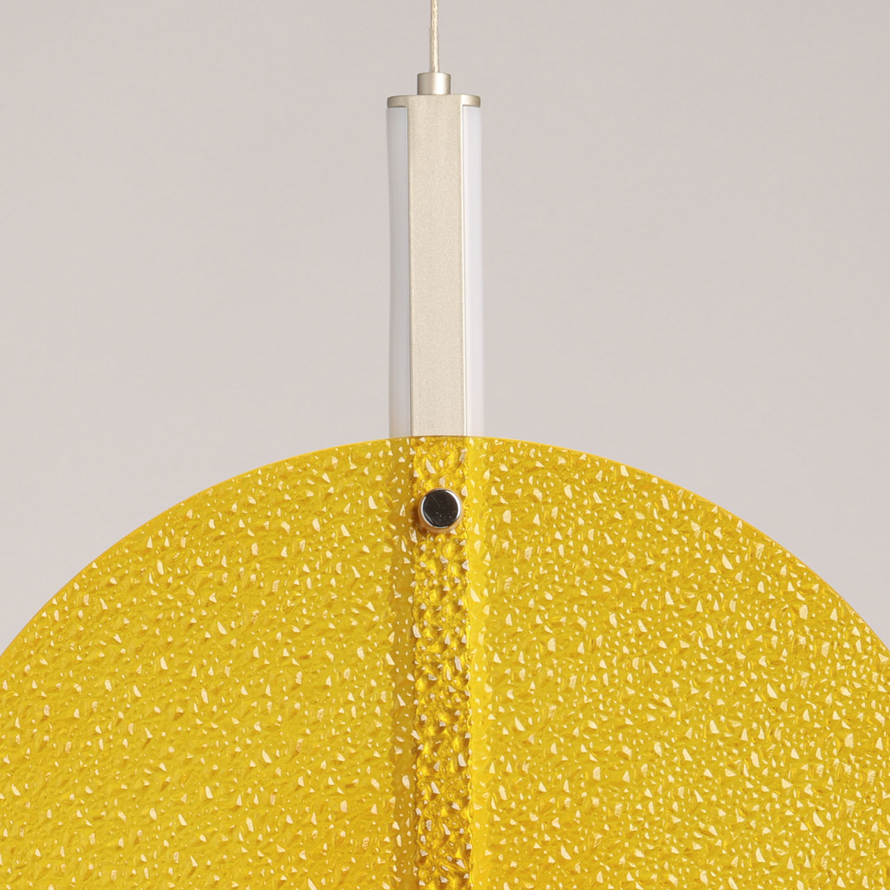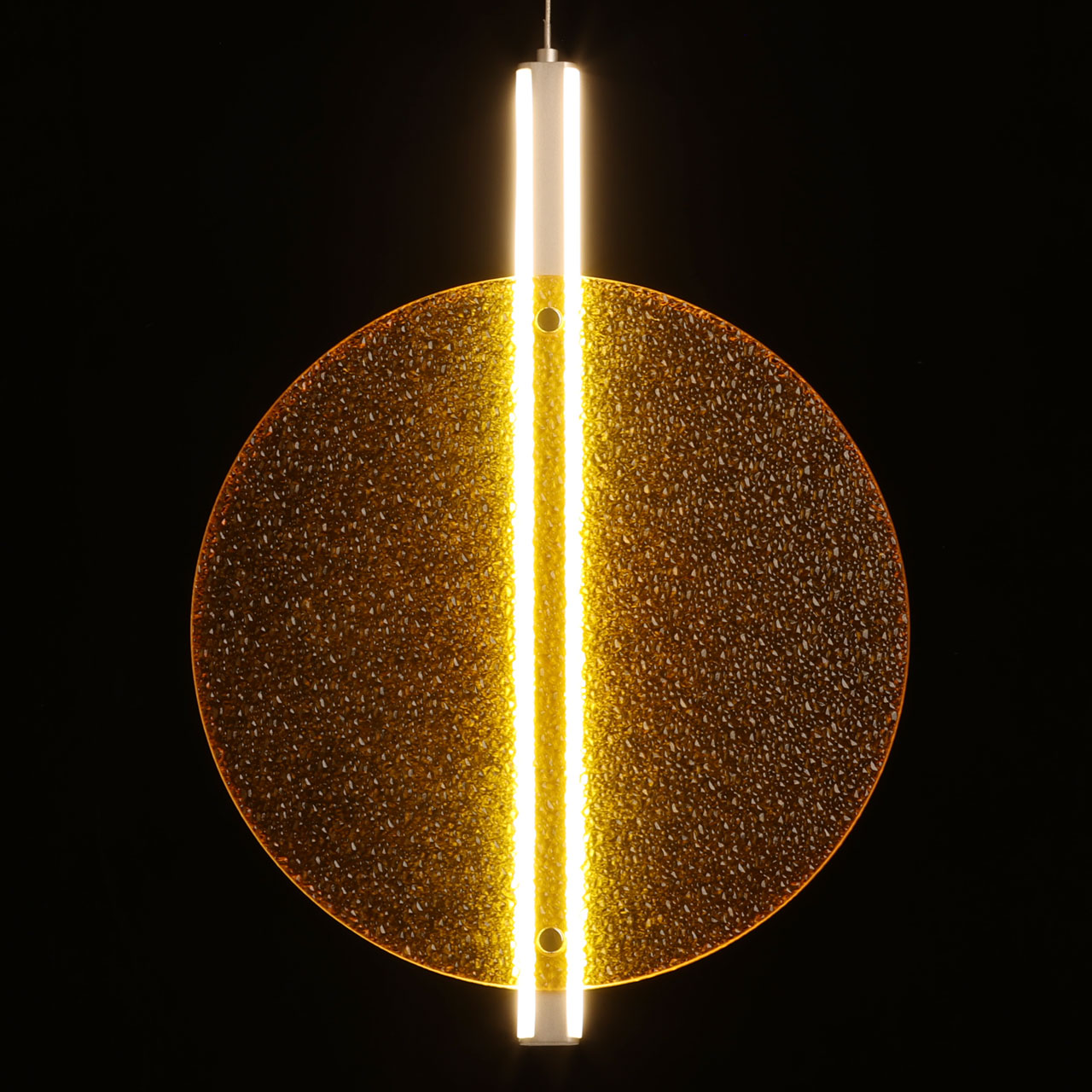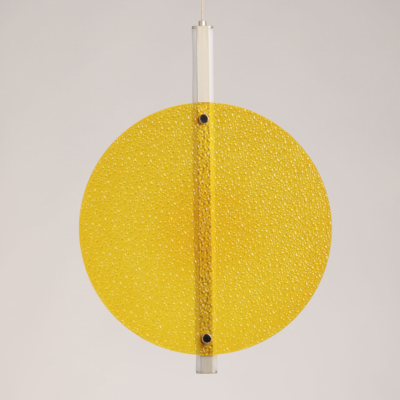 Металлическое основание подвеса гальванизировано в цвет никеля. Корпус плафона выполнен из сплава алюминия с цинком и гальванизирован в цвет основания. Светодиодные источники света закрыты матовым акрилом. Подвес декорирован фактурным стеклом, окрашенным в массе в желтый цвет.