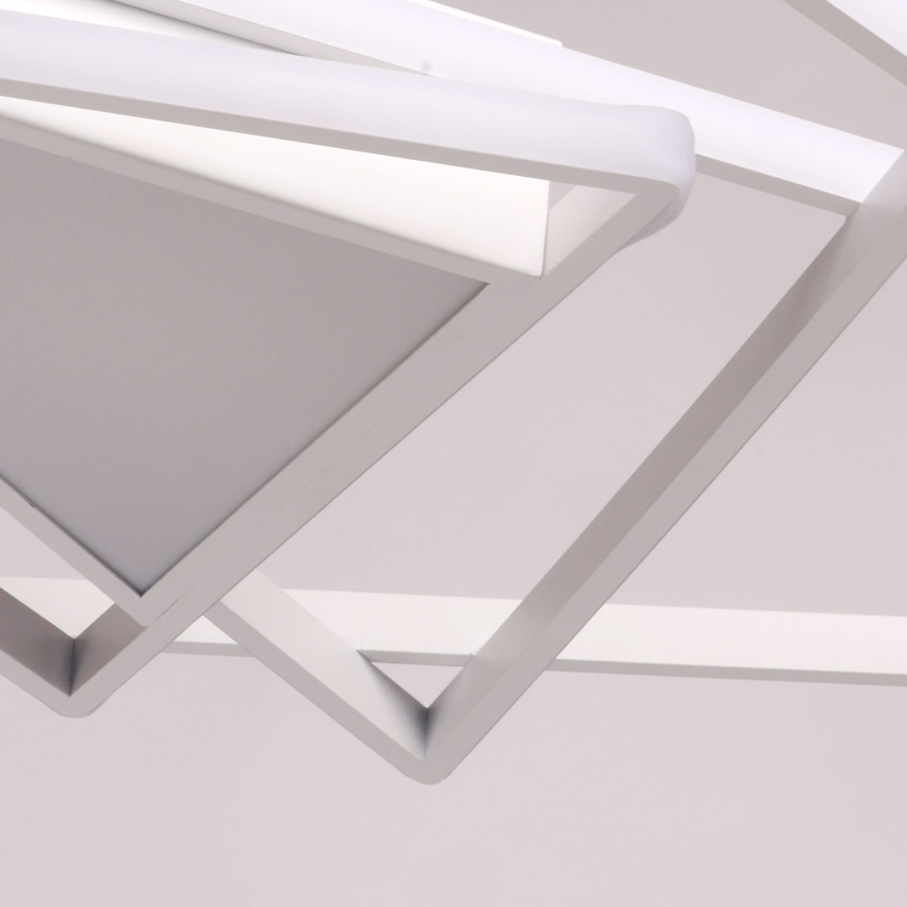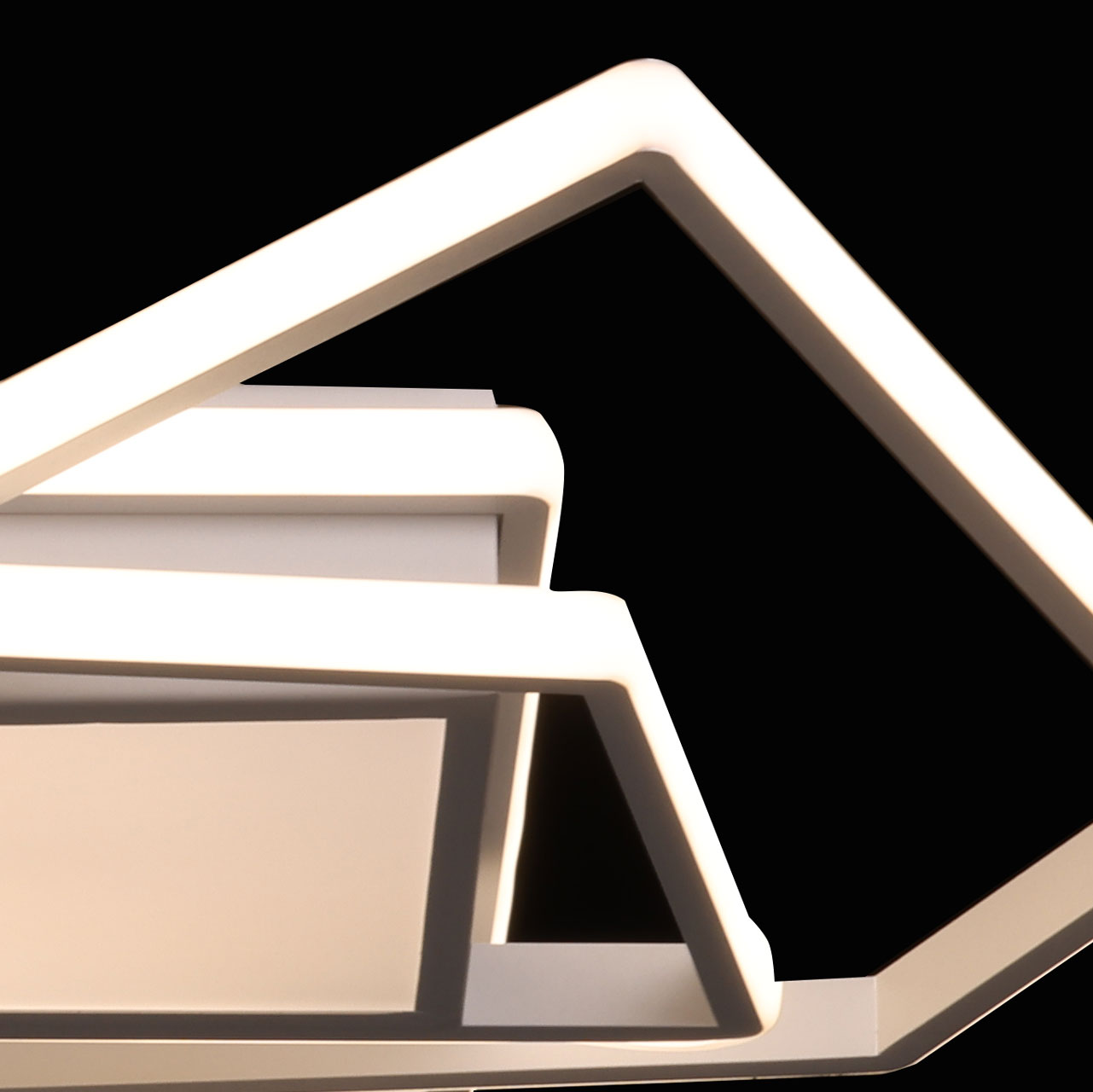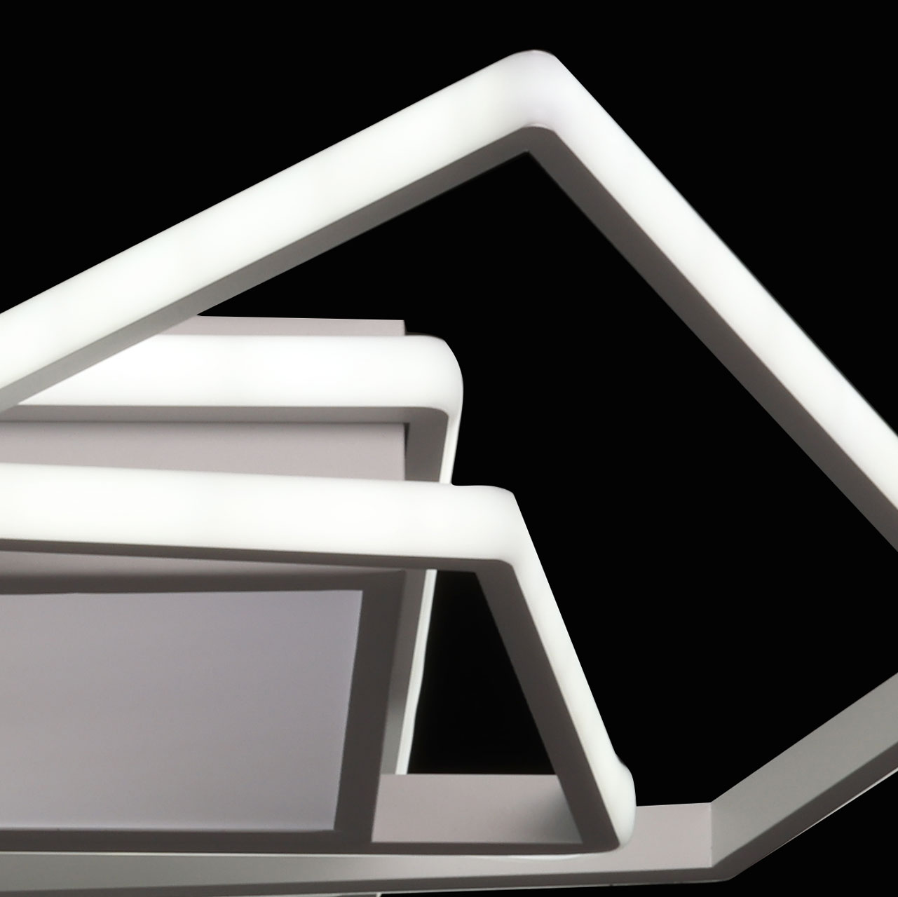 Металлическое основание потолочной люстры окрашено в белый цвет. Корпус плафона выполнен из сплава алюминия и окрашен в цвет основания. Светодиодные источники света закрыты белым силиконом и матовым акрилом.