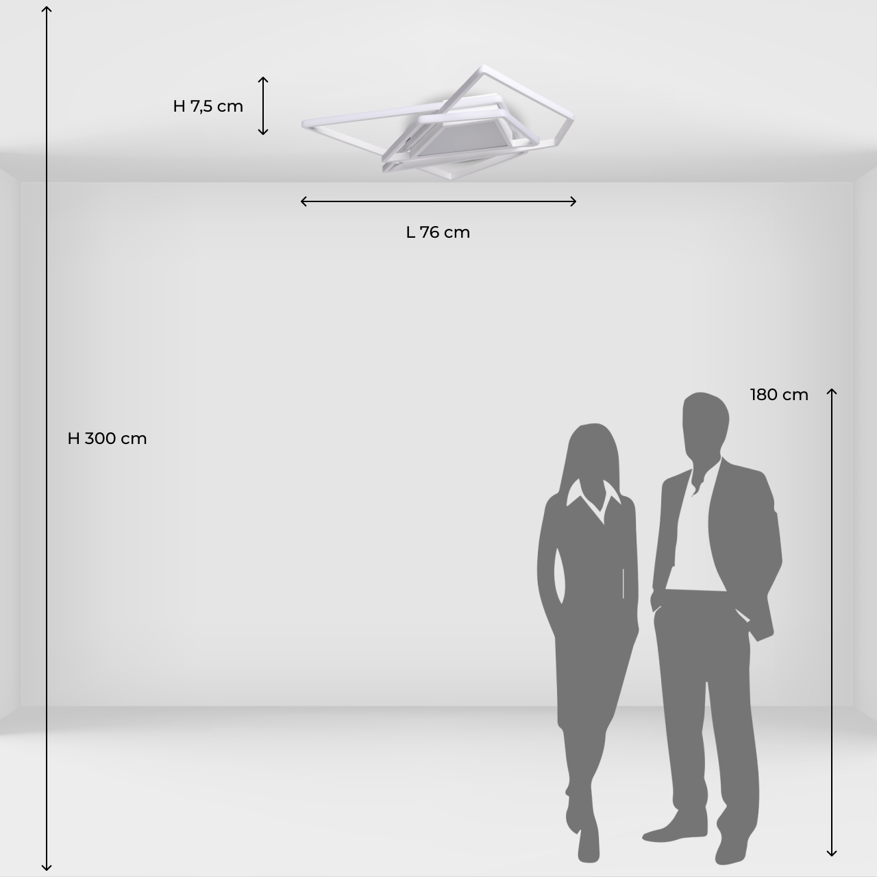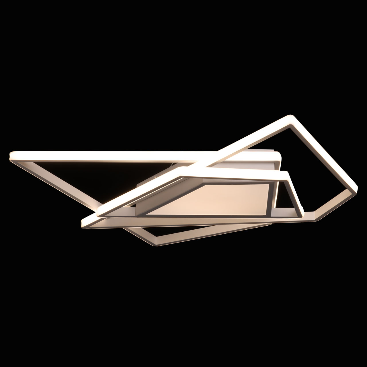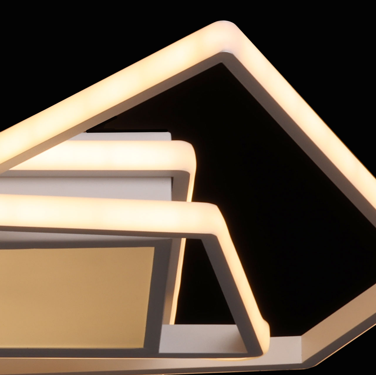 Металлическое основание потолочной люстры окрашено в белый цвет. Корпус плафона выполнен из сплава алюминия и окрашен в цвет основания. Светодиодные источники света закрыты белым силиконом и матовым акрилом.