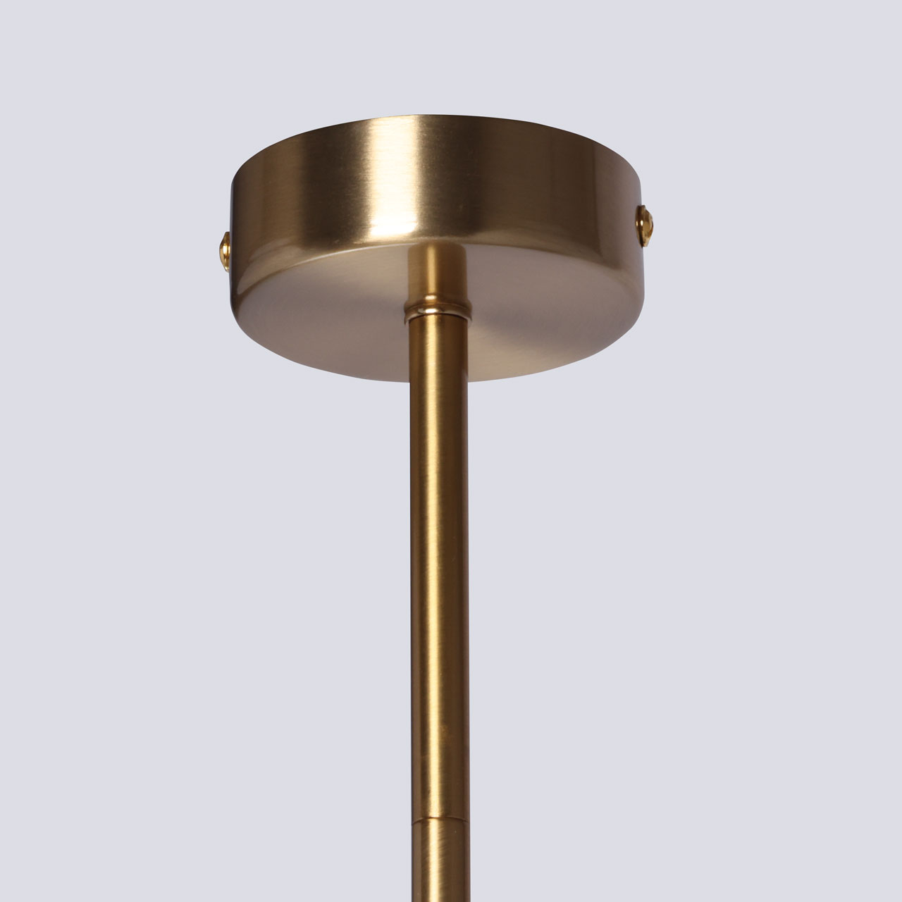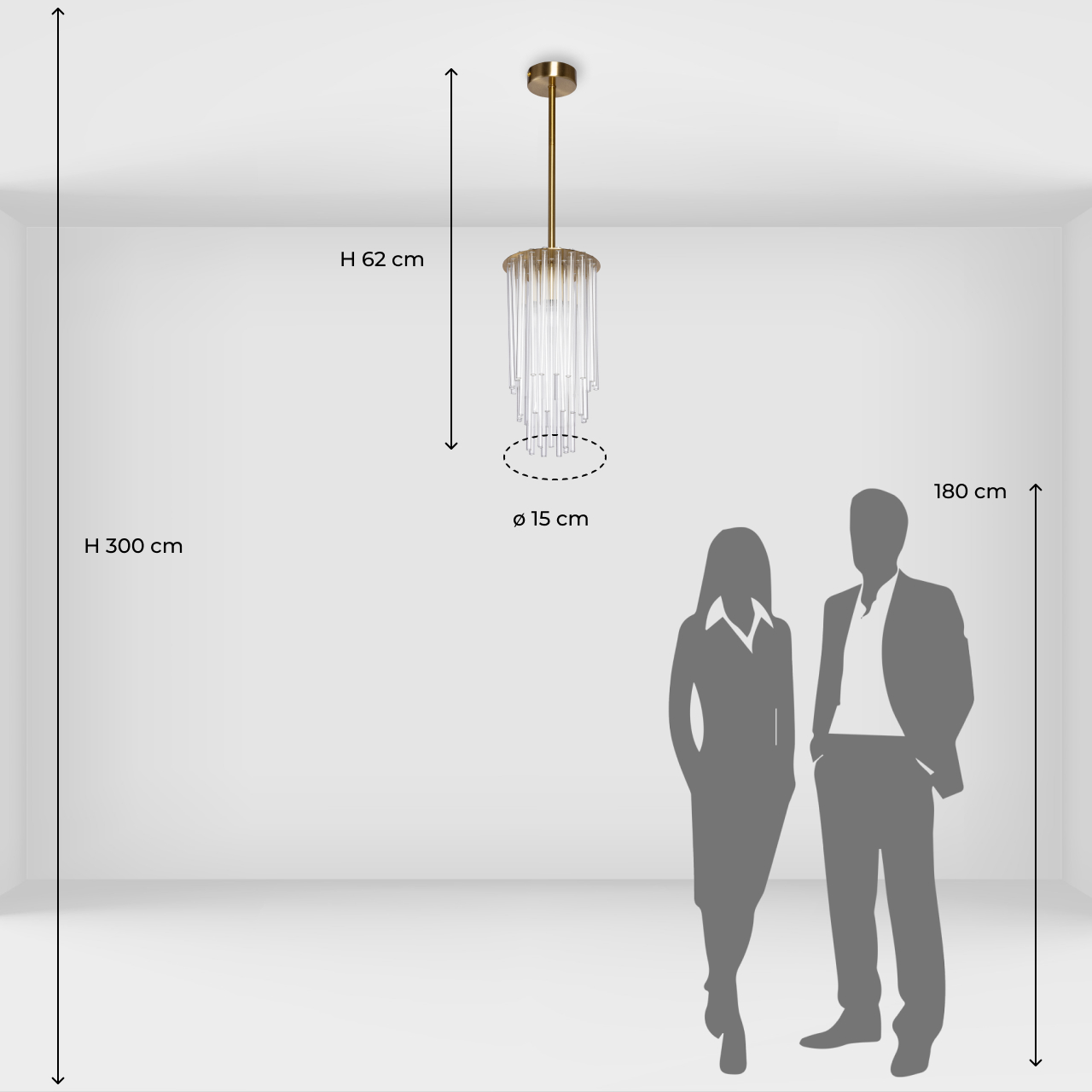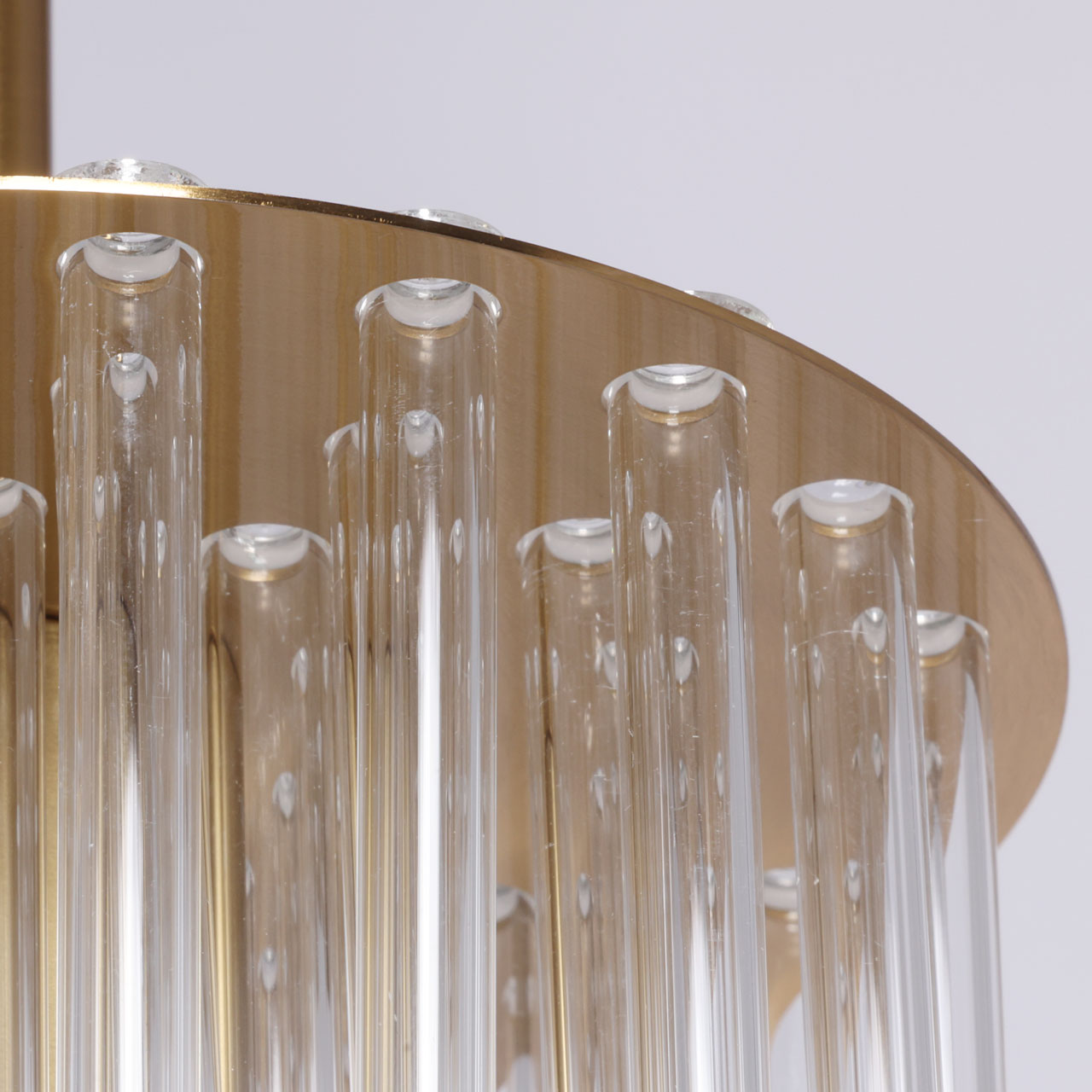Металлическое основание подвесной люстры гальванизировано в цвет латуни. Светильник декорирован прозрачными стеклянными трубочками.