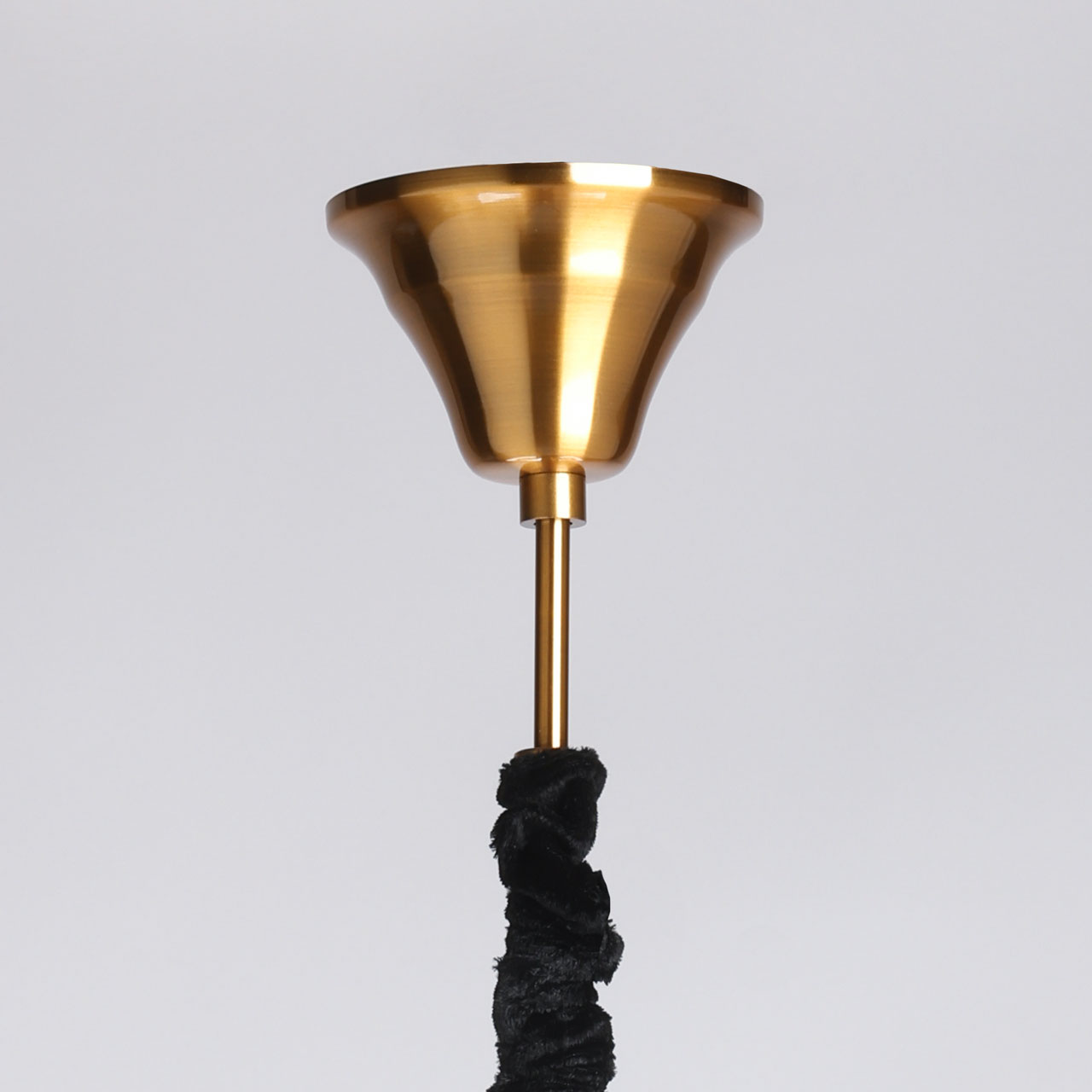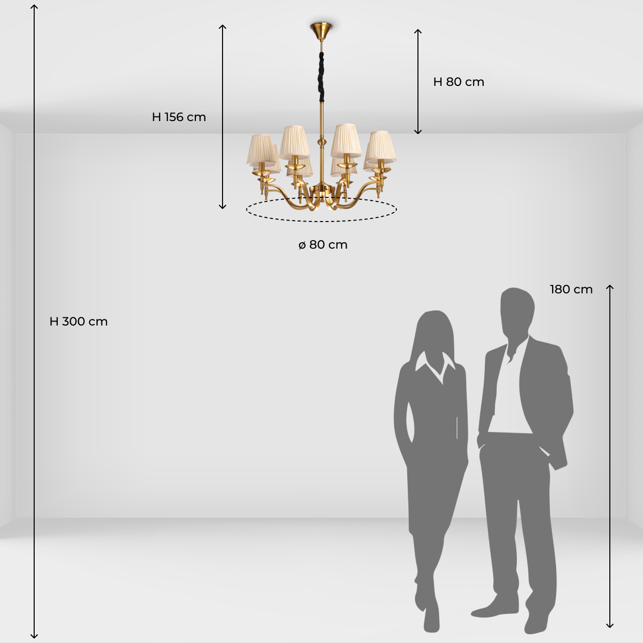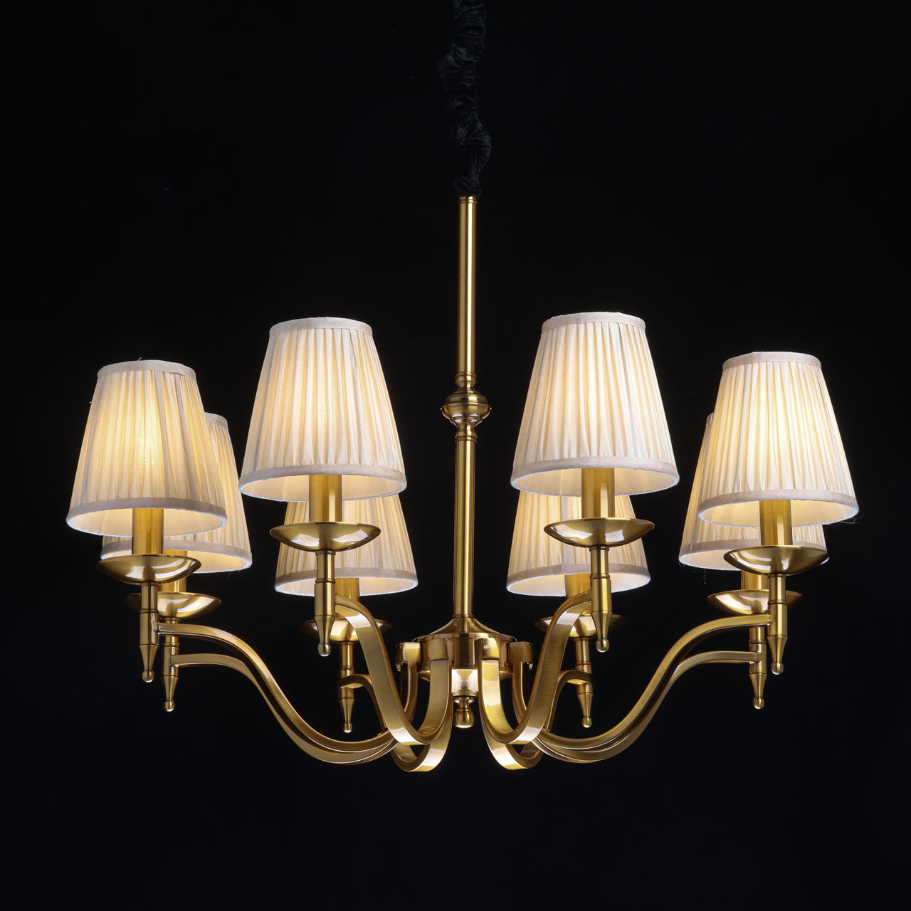 Металлическое основание светильника гальванизировано в цвет медовая бронза. Светильник декорирован текстильными абажурами бежевого цвета.