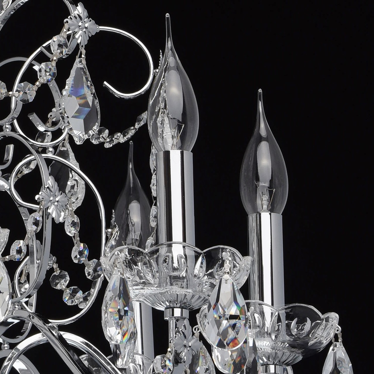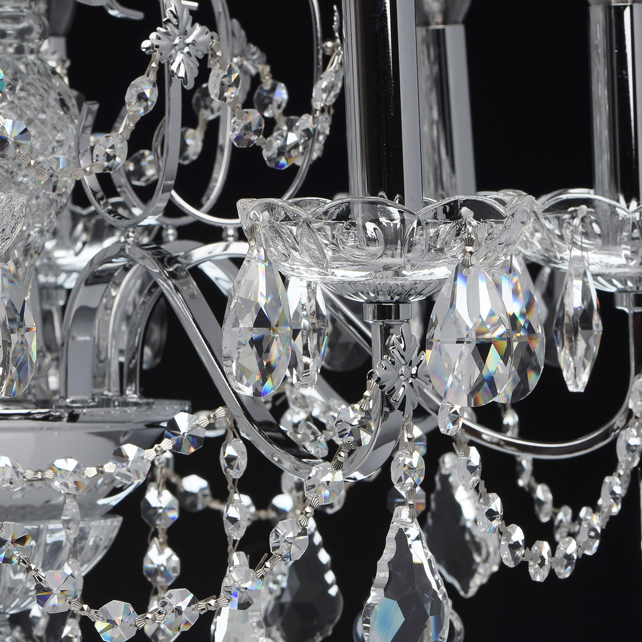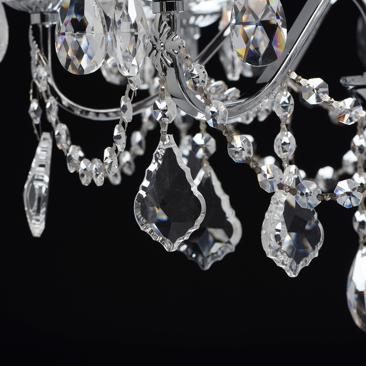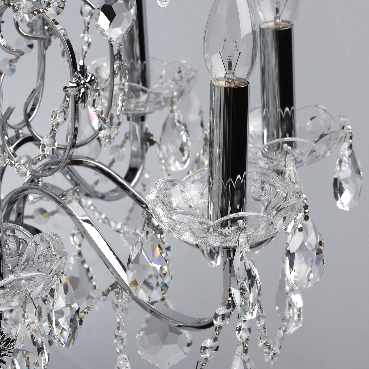 Арматура светильника выполнена из сплава железа и гальванизирована в цвет хрома. Центральная ось декорирована прозрачным стеклом со сложным орнаментом. Розетки выполнены из прозрачного стекла, отлитого по форме. Светильник декорирован хрустальными подвесками 4-х видов: октагон, миндаль, дубовый лист, шар.