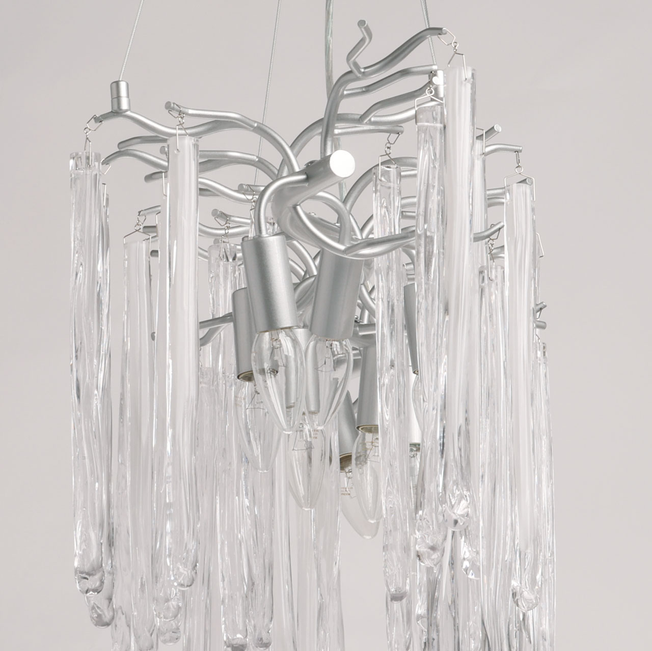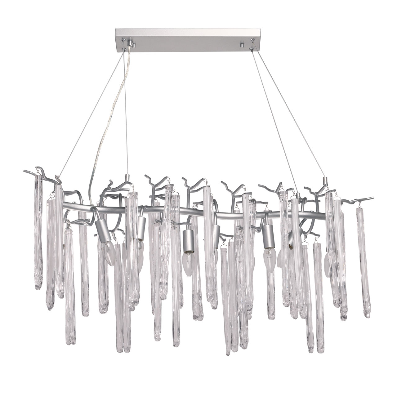 Металлическое основание подвесной люстры окрашено в цвет перламутрового серебра. Люстра декорирована прозрачными стеклянными подвесками и подвесками, окрашенными в белый цвет.