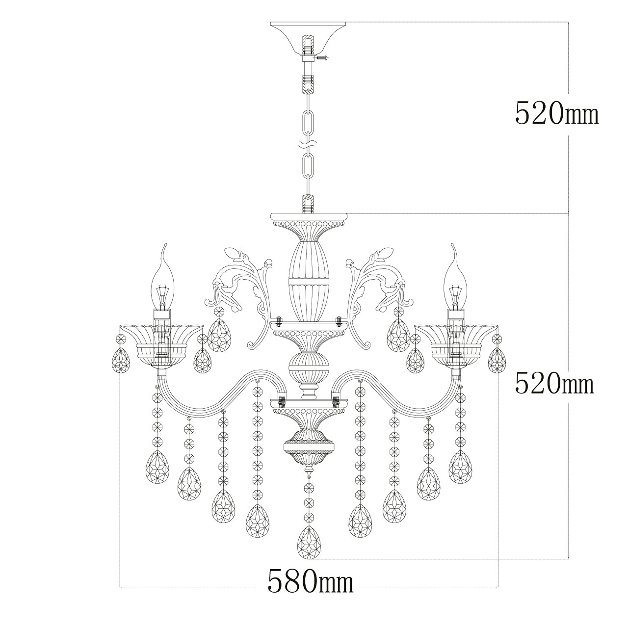Основание светильника выполнено из сплава металла и гальванизировано в цвет французского золота. Рожки профилированы и выполнены по технологии проката на роликовом станке. Декоративные элементы центральной оси выполнены по технологии токарной обработки с последующим прессованием. Декоративная розетка в верхней части центральной оси выполнена из стали по технологии прессования. Декоративные элементы выполнены из сплава алюминия по технологии художественного литья. Декоративные розетки выполнены из стекла, отлитого в сложную форму. Светильник декорирован подвесками из хрусталя формы октагон и миндаль.