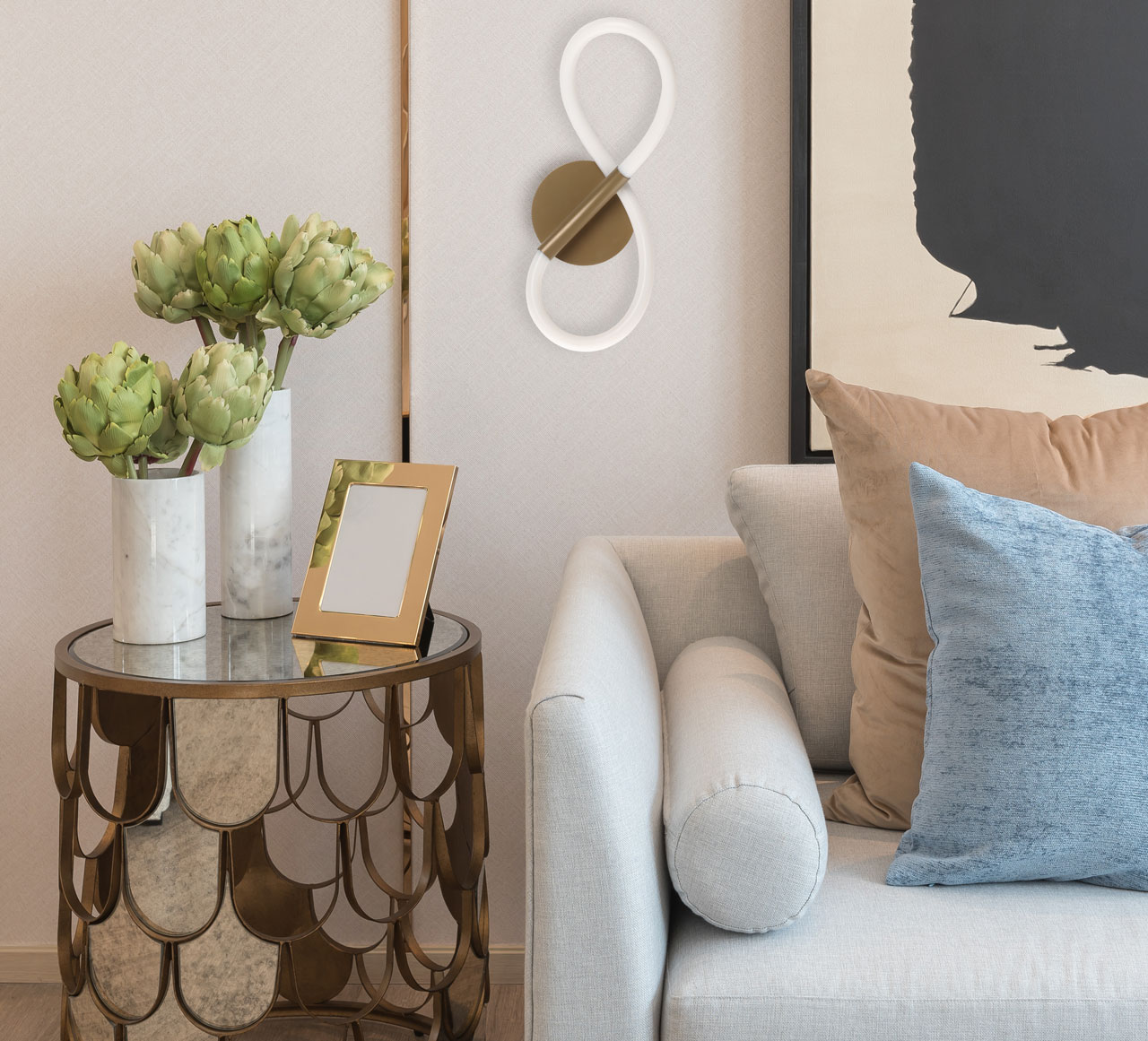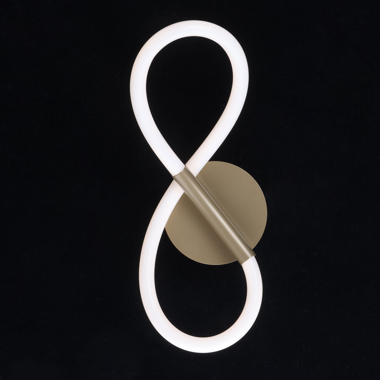 Металлическое основание бра окрашено в цвет перламутрового золота. Гибкий плафон настенного бра выполнен из белого матового силикона.