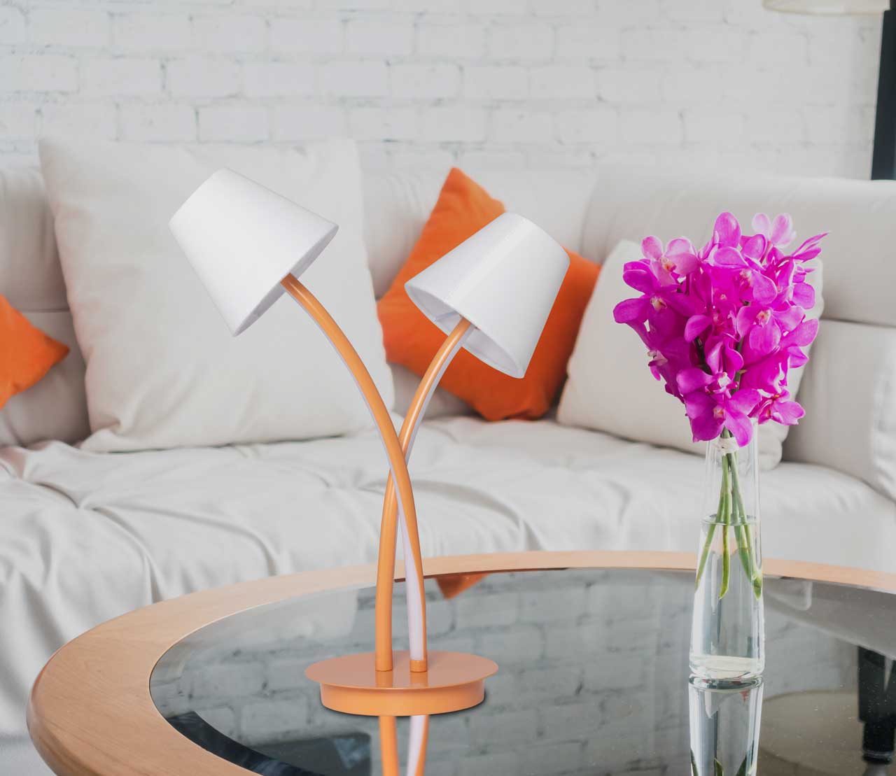 Металлическое основание настольной лампы окрашено в терракотовый цвет. Корпус плафонов изогнутой формы выполнен из сплава алюминия с цинком и окрашен в цвет основания. Двухслойные абажуры состоят из текстиля белого цвета и термостойкого акрила с внутренней стороны. Абажуры прошиты. Светодиодные источники света закрыты белым силиконом.