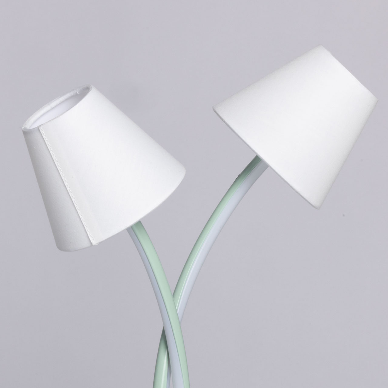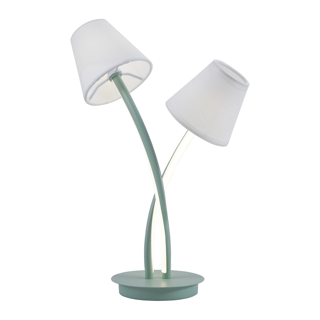Металлическое основание настольной лампы окрашено в зеленый цвет. Корпус плафонов изогнутой формы выполнен из сплава алюминия с цинком и окрашен в цвет основания. Двухслойные абажуры состоят из текстиля белого цвета и термостойкого акрила с внутренней стороны. Абажуры прошиты. Светодиодные источники света закрыты белым силиконом.