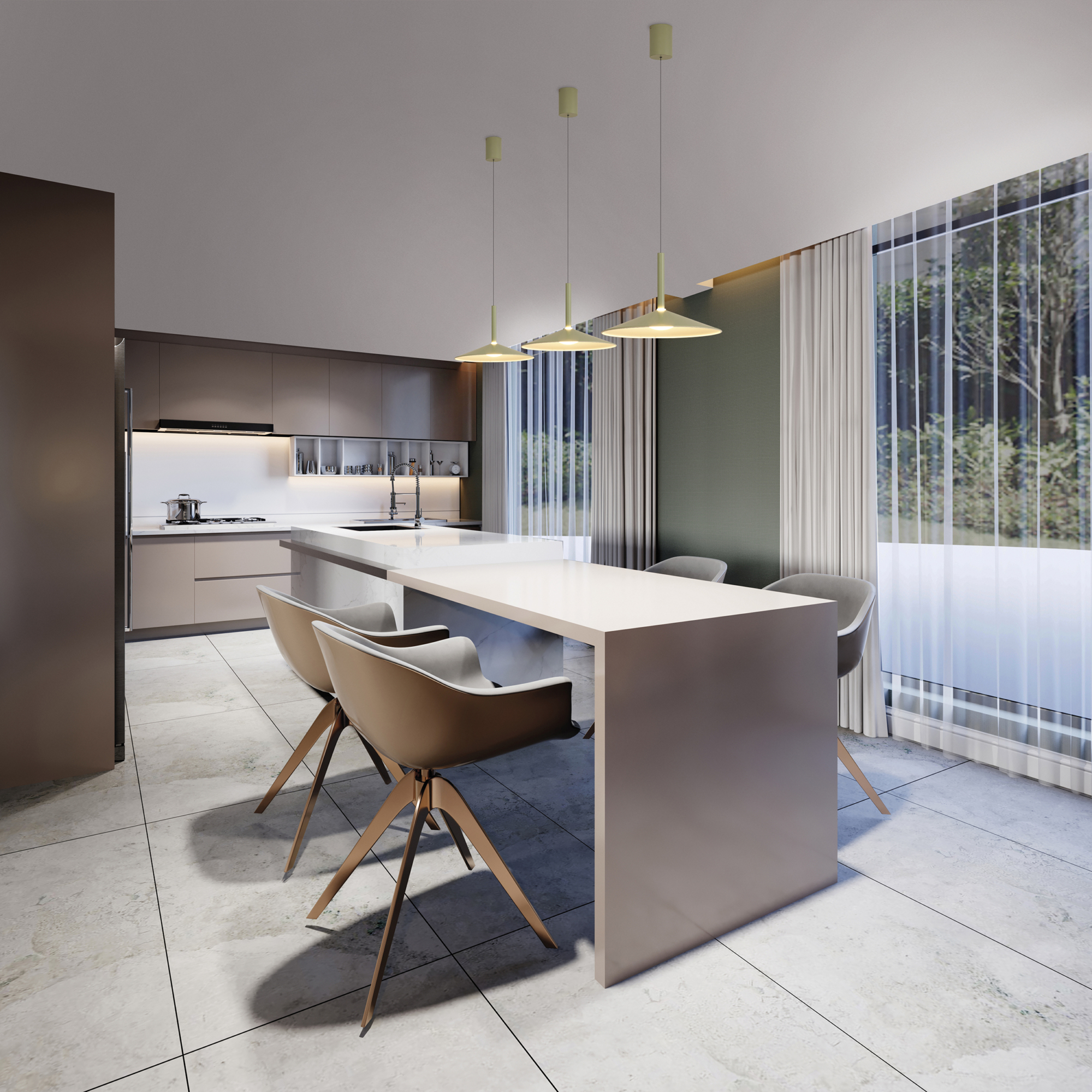 Высота подвеса светильника легко регулируется вручную, а также становится предметом удобной эргономики и трансформации в интерьерных пространствах. Максимальная длина провода достигает двух метров. Кроме классической черной и белой окраски всех частей светильника дизайнеры добавили актуальные природные цвета: фисташковый, бежевый и винный. Эта гамма позволяет органично применить светильники Calice в загородных пространствах, скандинавских и экологических интерьерах.