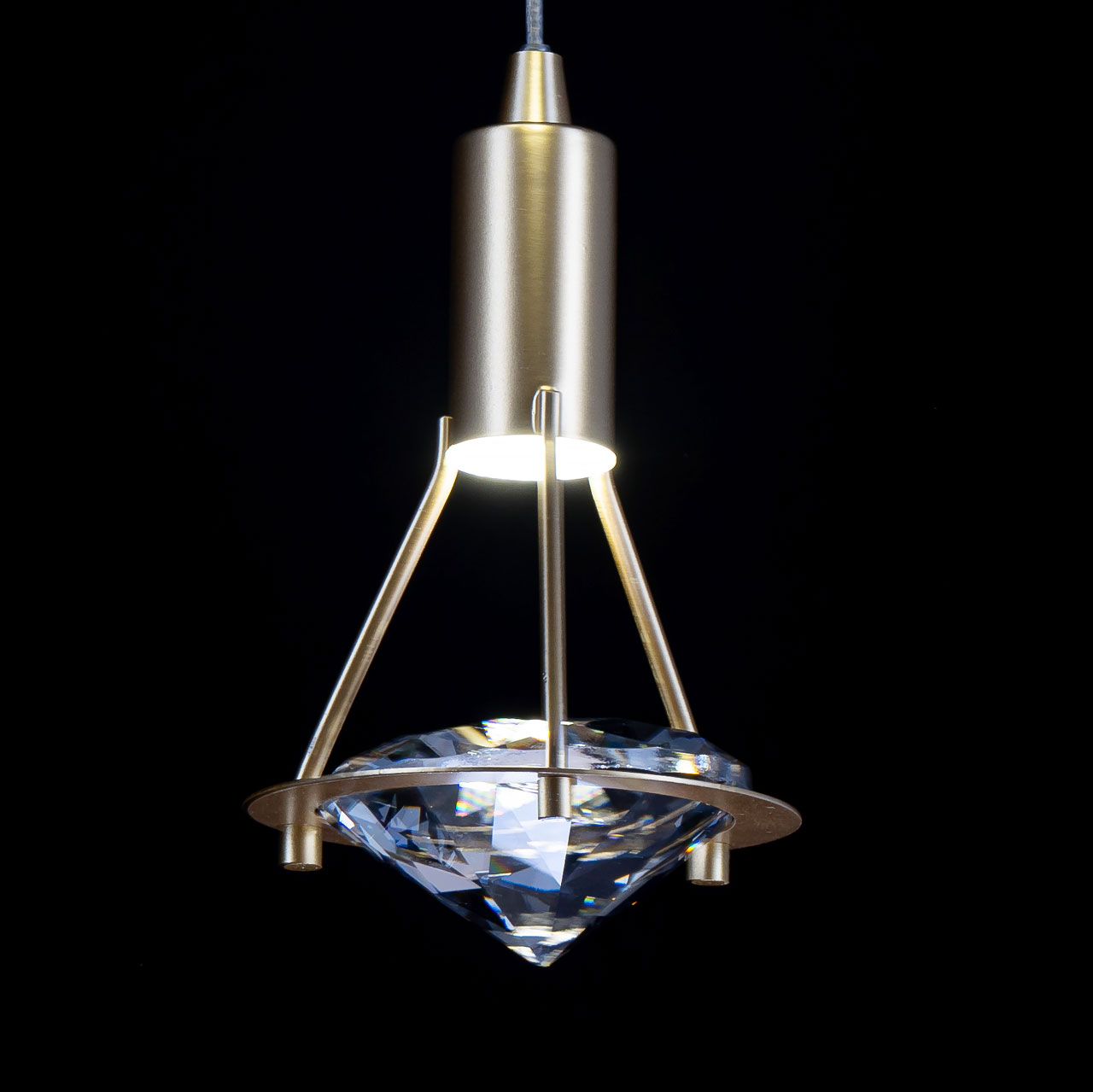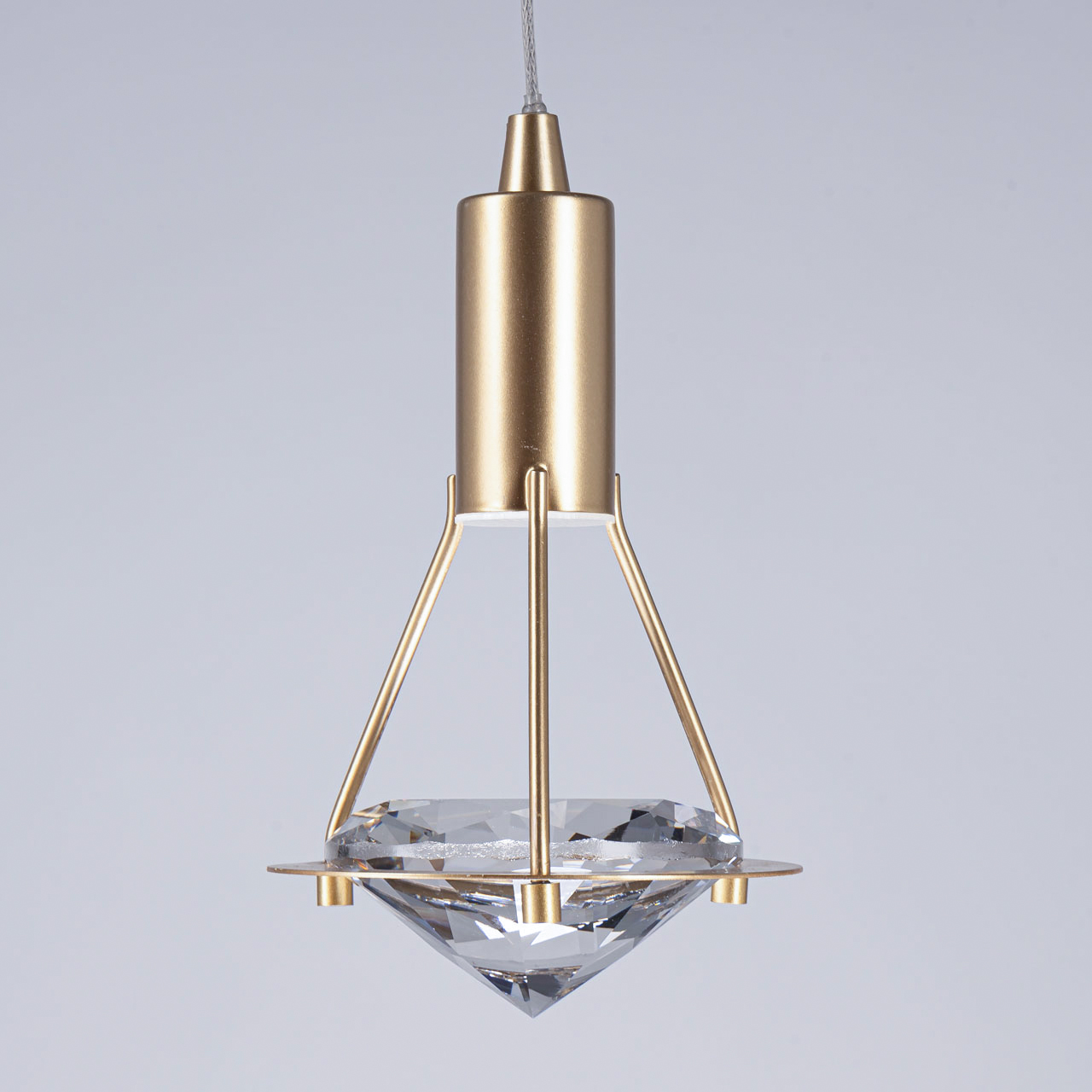 Металлическое основание подвеса гальванизировано в цвет золота. Светильник декорирован прозрачным хрусталем в форме бриллианта.