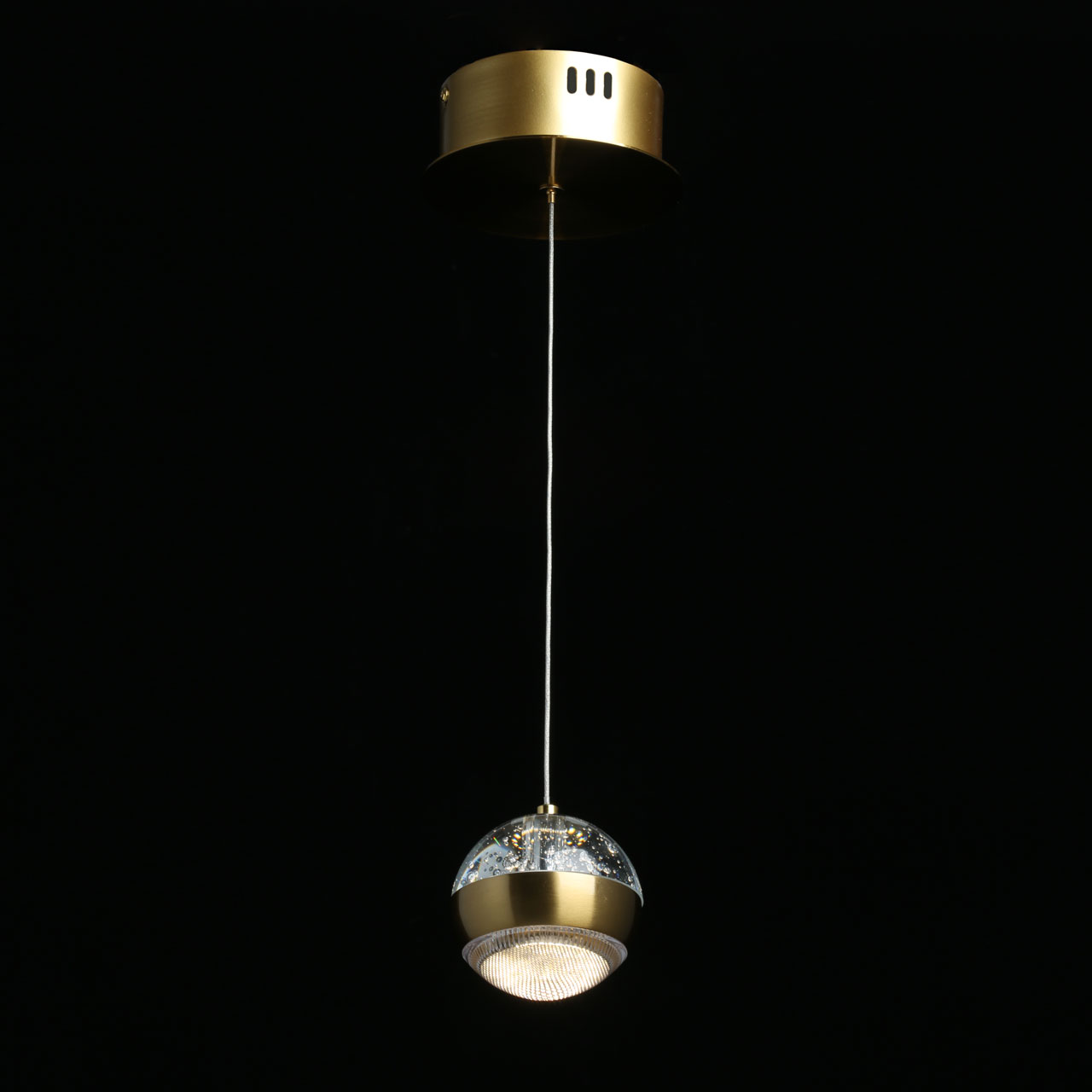Основание светильника выполнено из комбинации сплавов металлов. Потолочная чаша выполнена из металла и окрашена в цвет латунь. Потолочная чаша закрыта пластиной из сплава алюминия цвета латунь, обработанного по технологии браширования с последующим патинированием.Плафон на подвесе в виде троса: каркас плафона выполнен из сплава алюминия цвета латунь и обработан по технологии браширования с последующим патинированием. В верхней части плафона светодиодный источник света типа SMD chip закрыт стеклом, отлитым в форму и обработанным по технологии пулегозо, при которой в плафоне образуются пузырьки. В нижней части плафона второй светодиодный источник света типа SMD chip закрыт прозрачным акрилом с фактурой сот.