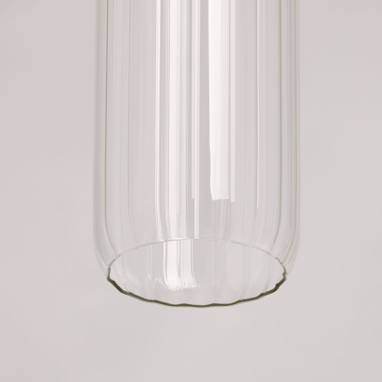 Металлическое основание подвеса гальванизировано в цвет латуни. Плафон вытянутой формы отлит из прозрачного стекла.