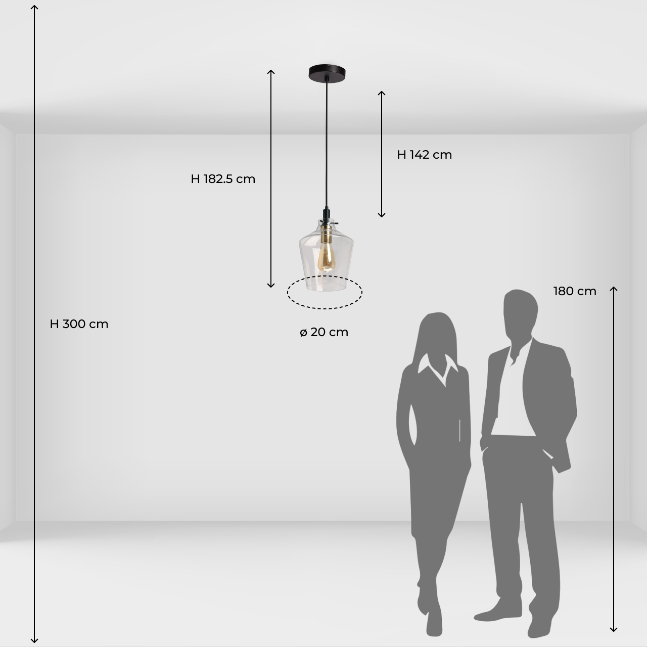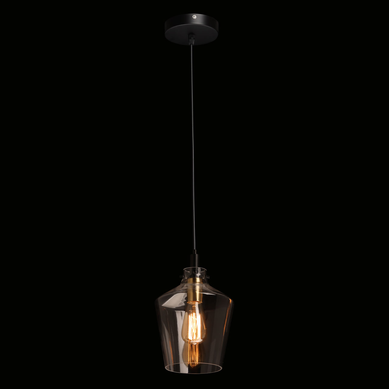 Металлическое основание подвеса окрашено в черный цвет. Отдельные элементы основания гальванизированы в цвет латуни. Прозрачный стеклянный плафон отлит в сложную форму.