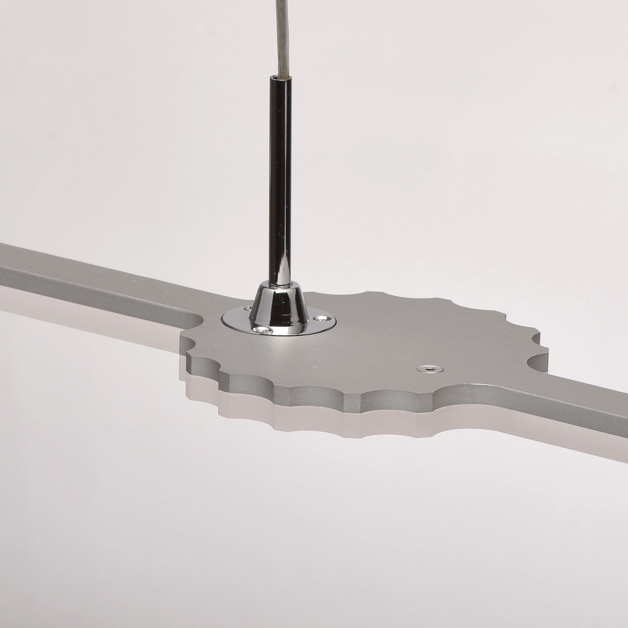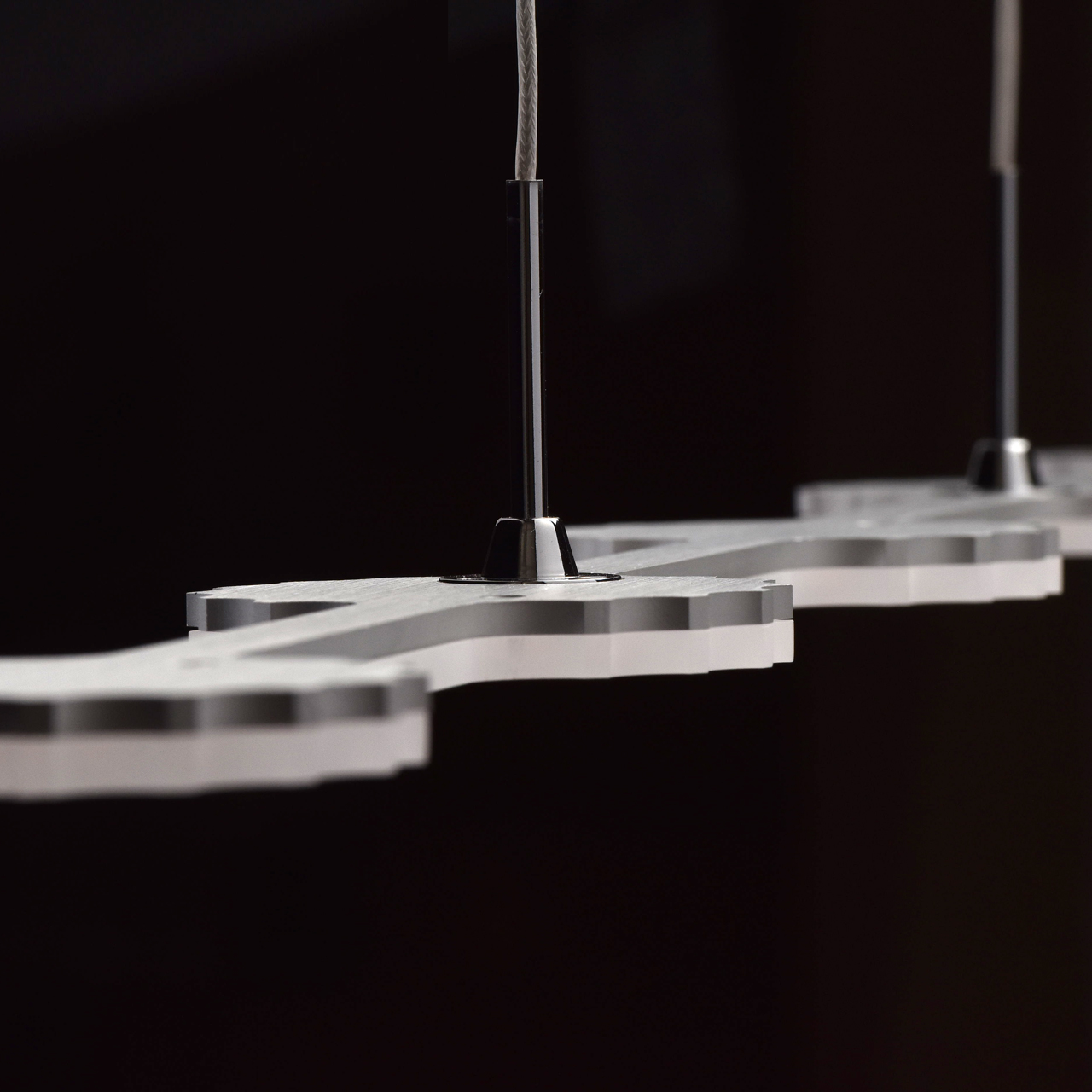 Основание выполнено из нержавеющей стали. Плафон выполнен из сплава аллюминия, круглые источники света типа СОВ закрыты белым матовым акрилом. Подвес — металлические троссы.
