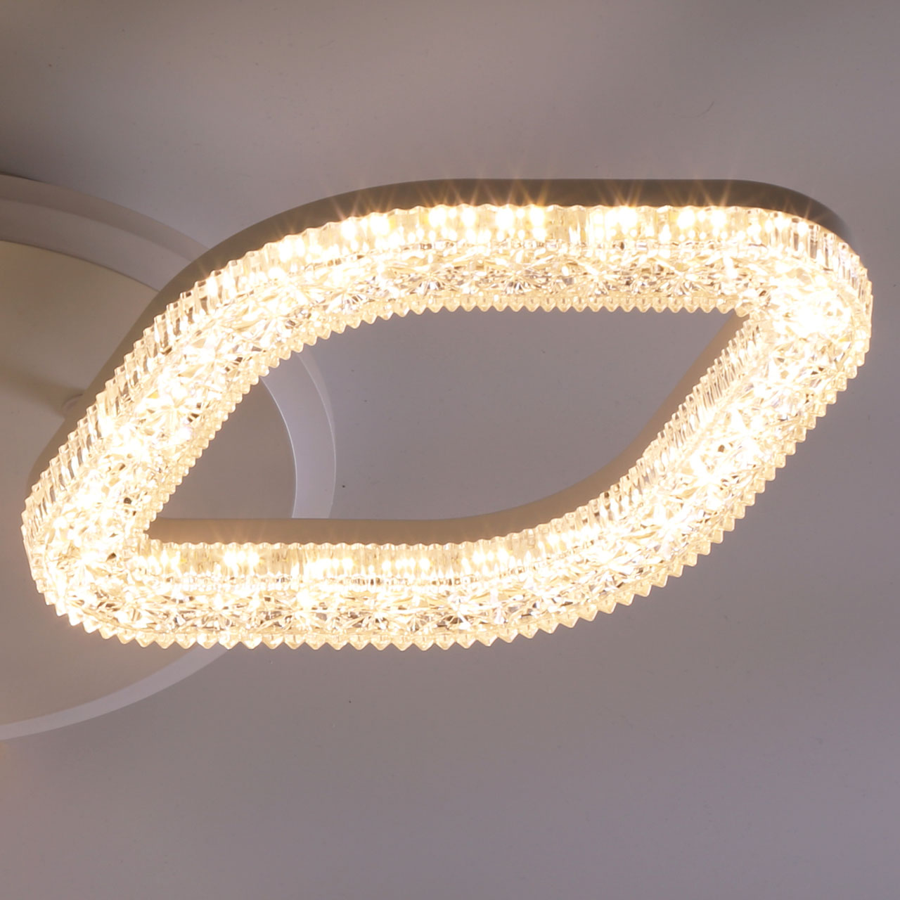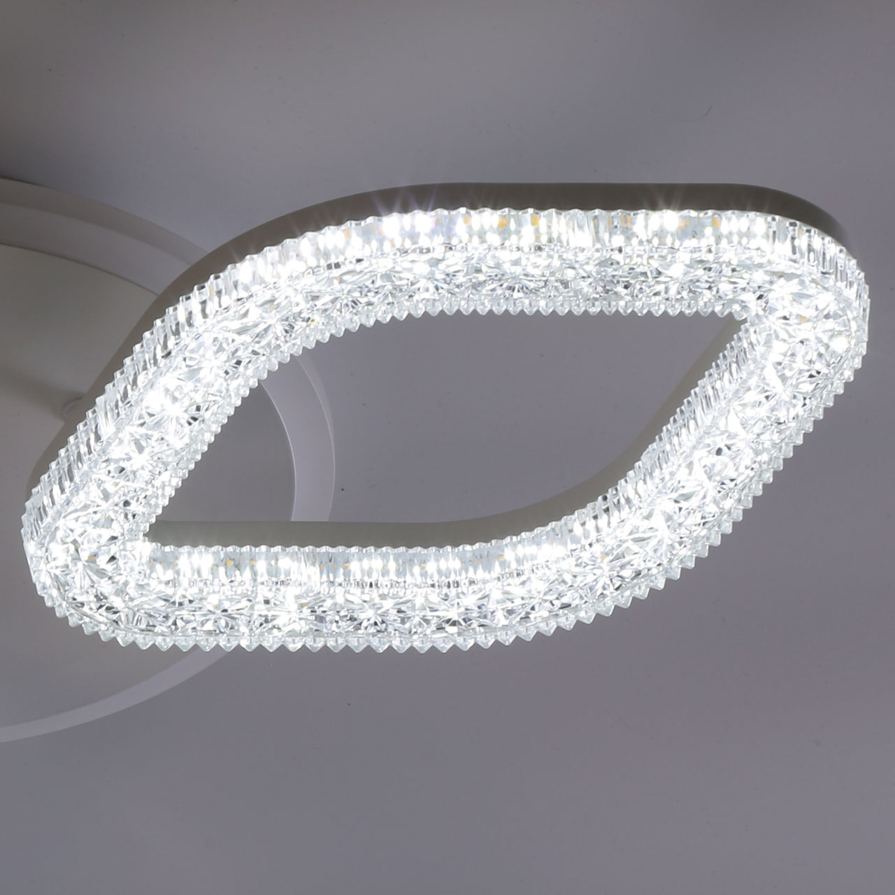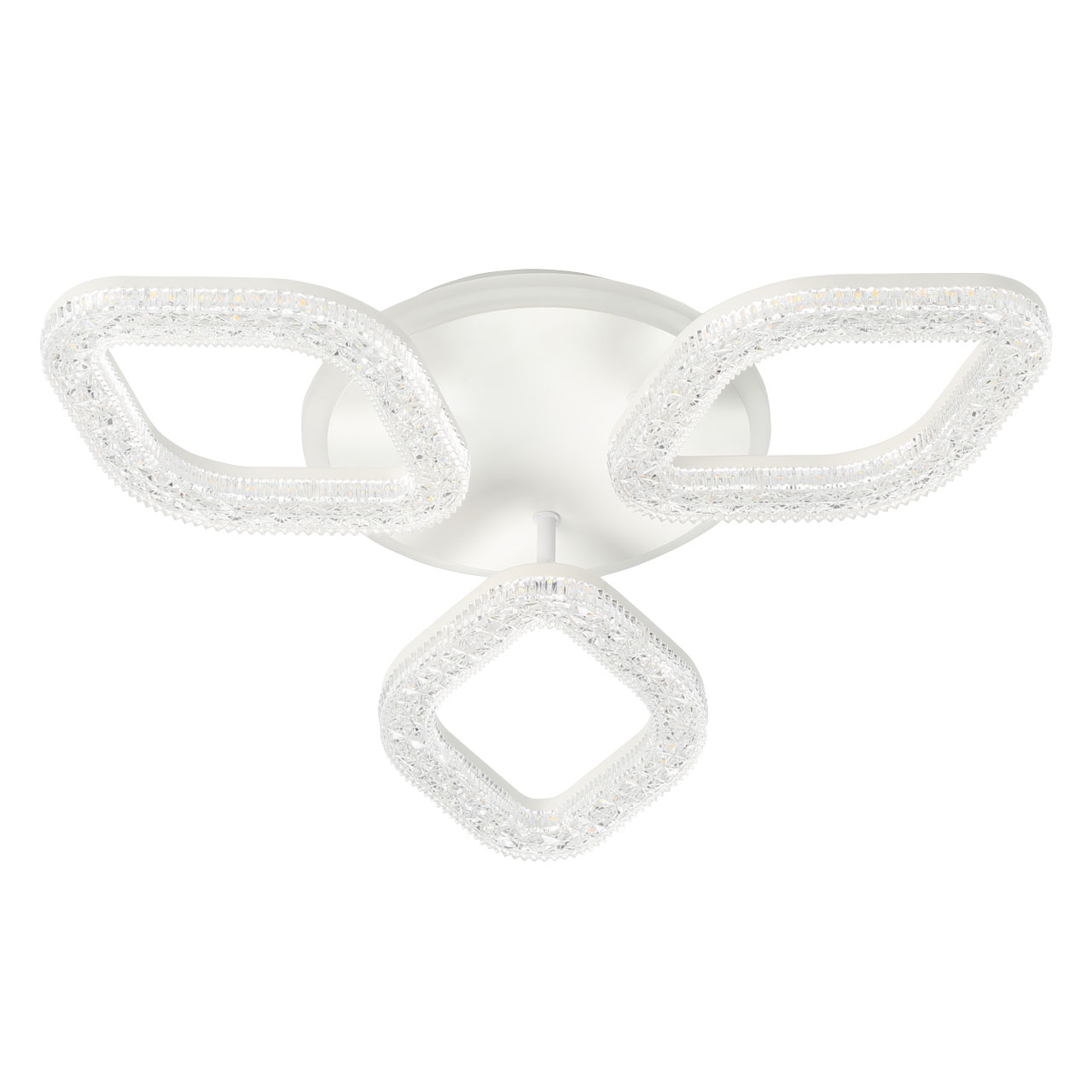 Металлическое основание светильника окрашено в белый цвет. Каркас плафона выполнен из сплава алюминия с цинком и окрашен в цвет основания. Светодиодные источники света на потолочной чаше закрыты белым матовым и прозрачным фактурным акрилом. Дополнительно, в светильнике предусмотрена подсветка потолочной чаши. Светильник приходит в состоянии частичной сборки в компактной упаковке: вся электрика подсоединена, достаточно закрепить плафоны на корпусе.