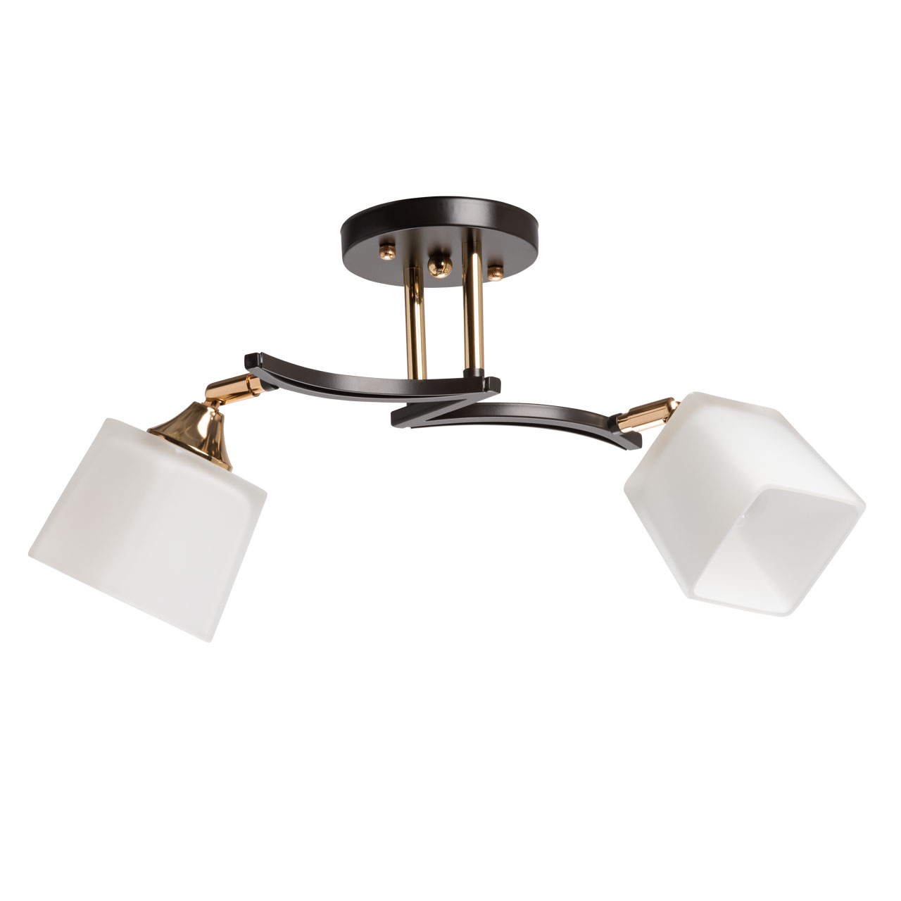 Металлическое основание потолочной люстры окрашено в цвет кофе. Отдельные элементы основания гальванизированы в цвет золота. Стеклянные плафоны отлиты в оригинальную форму и окрашены в белый цвет с внутренней стороны.