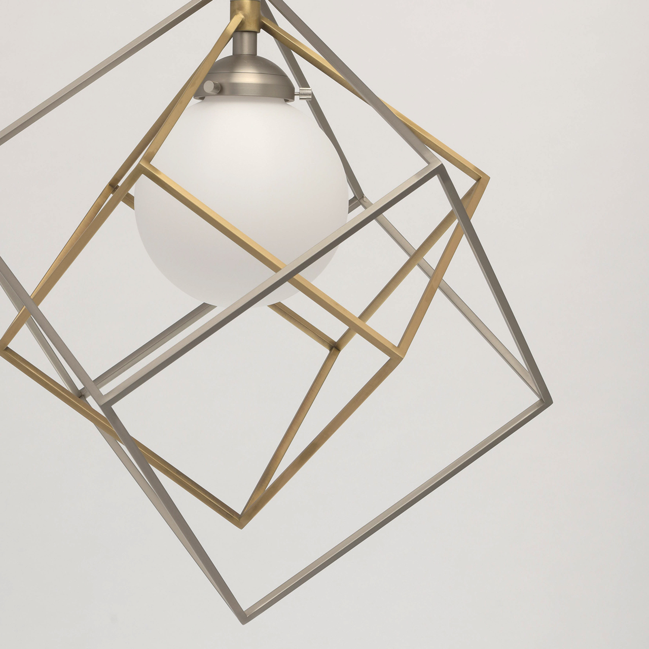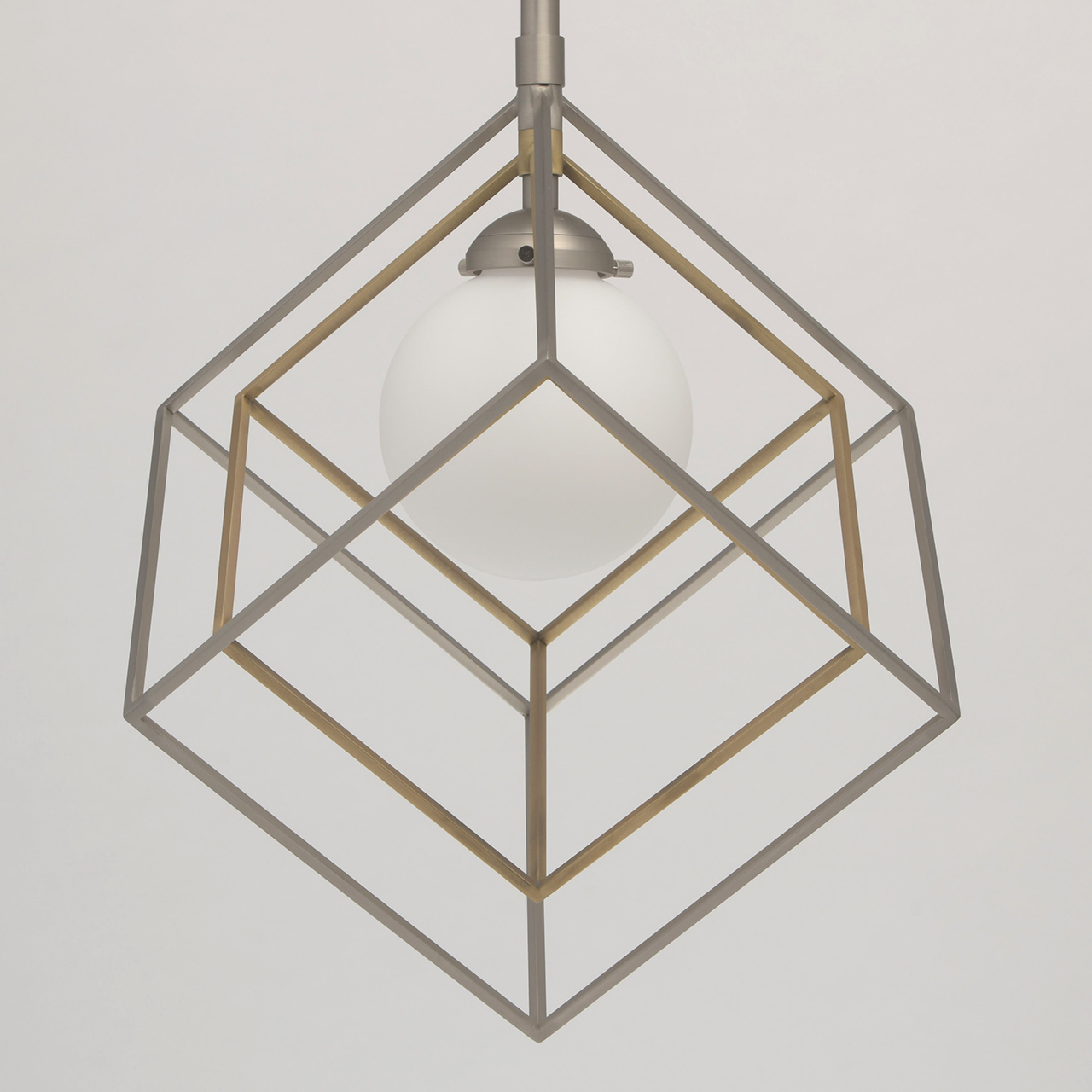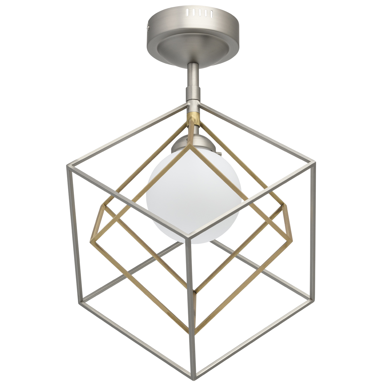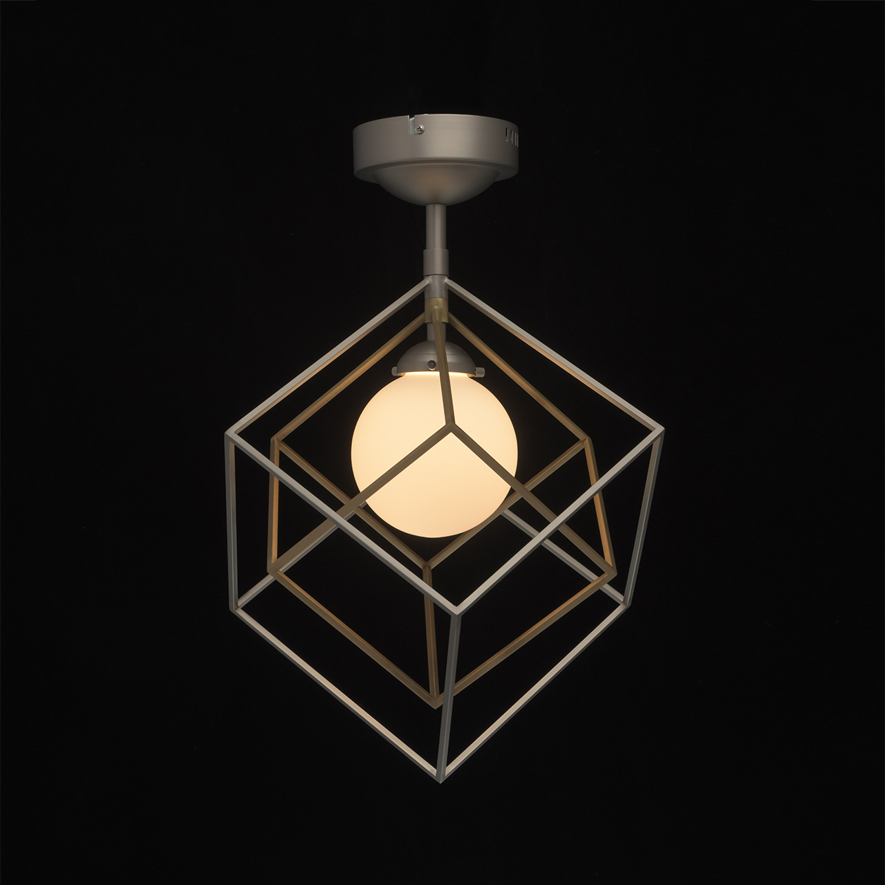 Основание выполнено из металла и гальванизировано в цвет матового никеля. Внутренний геометричный декоративный гальванизирован в цвет матовой бронзы. Плафон из стекла, отлитого в форму шара; изнутри окрашен в белый цвет, внешняя поверхность плафона матирована. Светодиодный источник света типа COB.