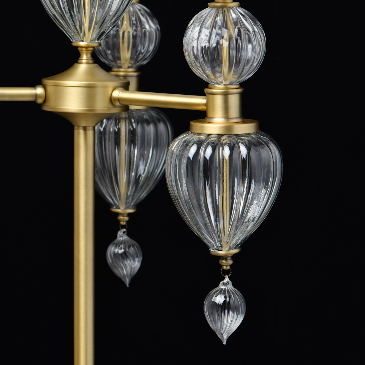 Основание светильника выполнено из металла и гальванизировано в цвет латуни. Светильник декорирован выдувным стеклом ручной работы. Текстильные абажуры белого цвета с термостойким акрилом внутри, отделаны кантом и прошиты.