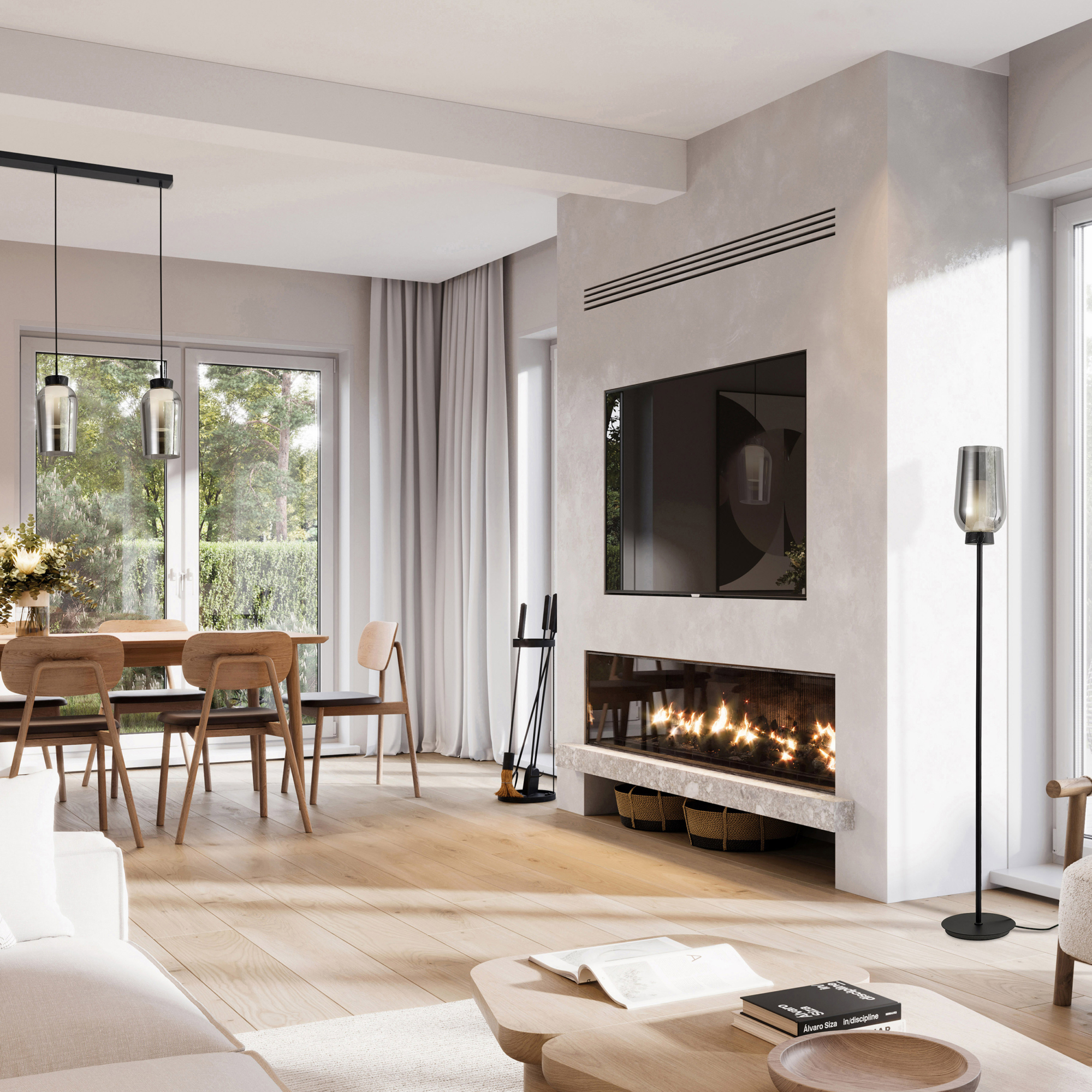 Второй вариант отделки – прозрачное стекло в сочетании с металлом, стилизованным под дерево. Идеально подойдет для интерьеров в современном деревенском ЭКО-стиле.