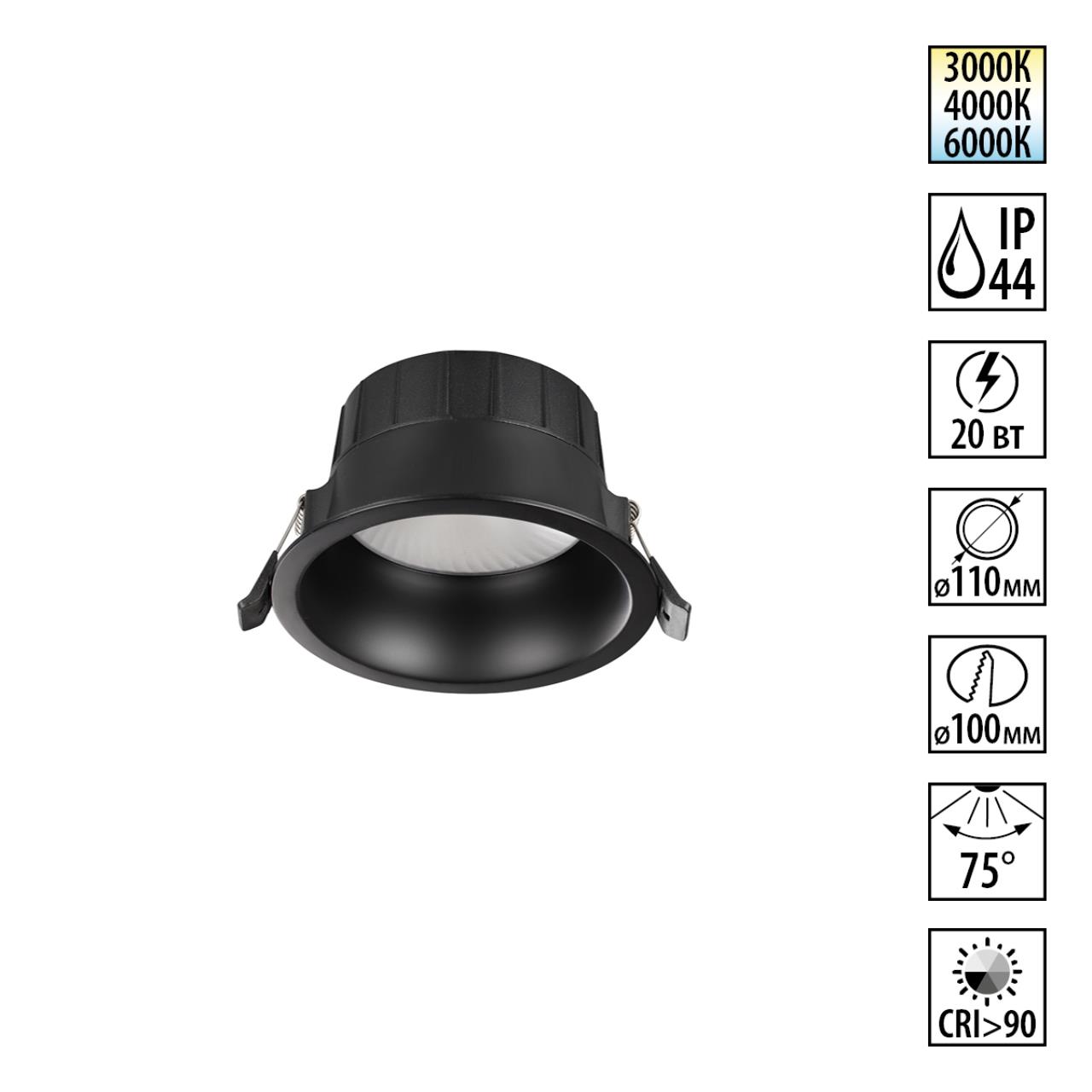 359554 WIR NT25 000 черный Светильник встраиваемый с переключателем цв. температуры IP44 LED 20W 220-240V 3000К4000К6000К CLARA