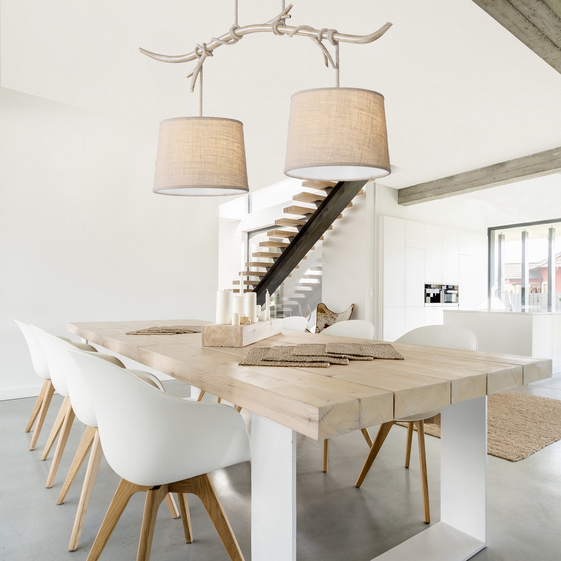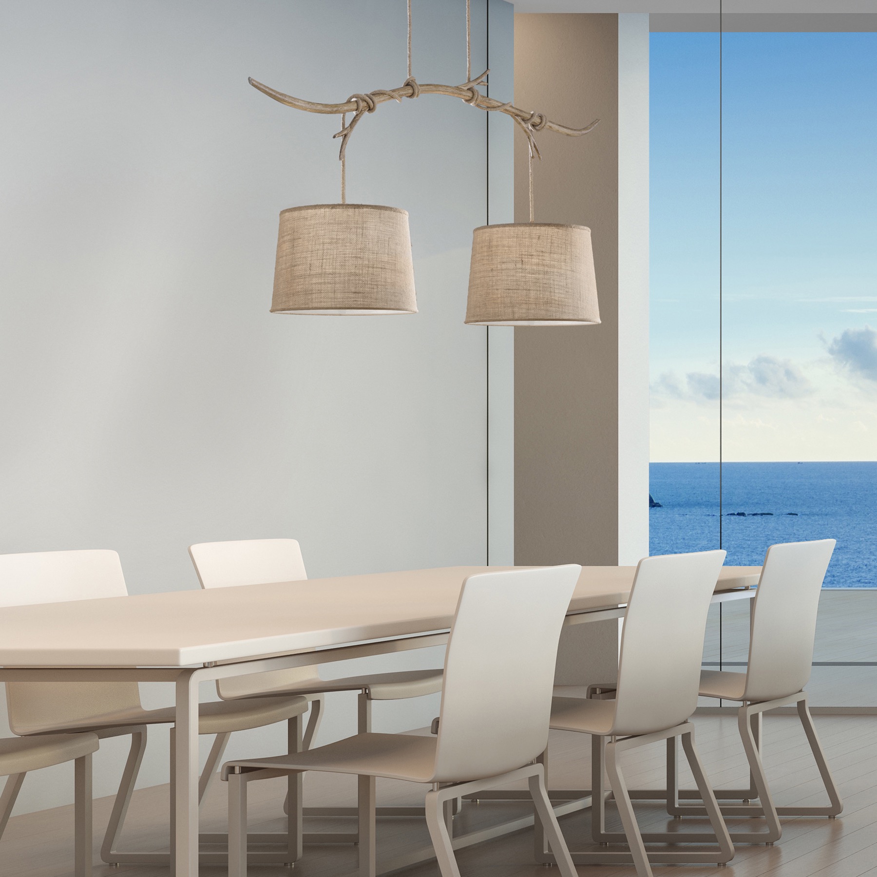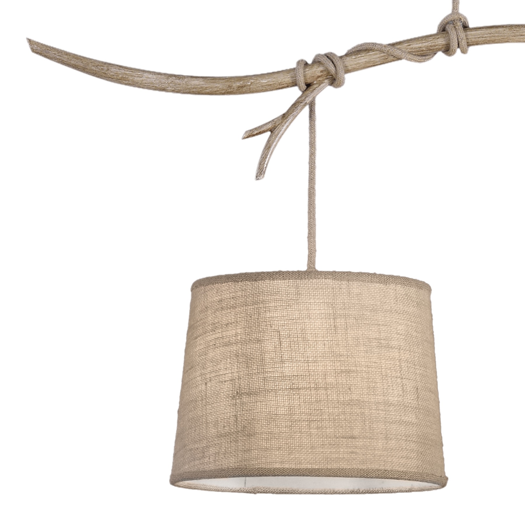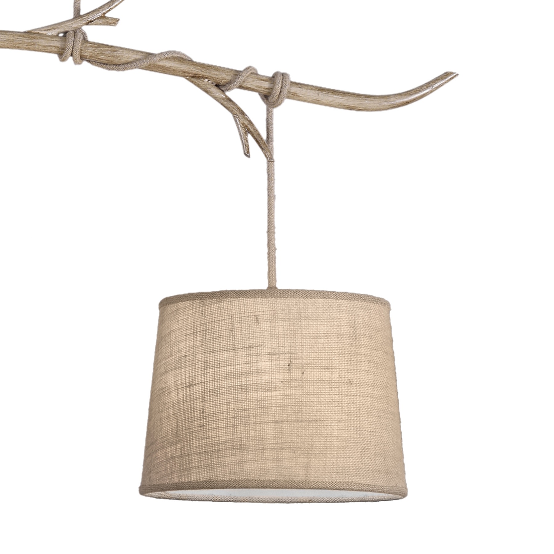 завязываются узлом вокруг ветвей и ведут к бежевым льняным оттенкам абажуров,