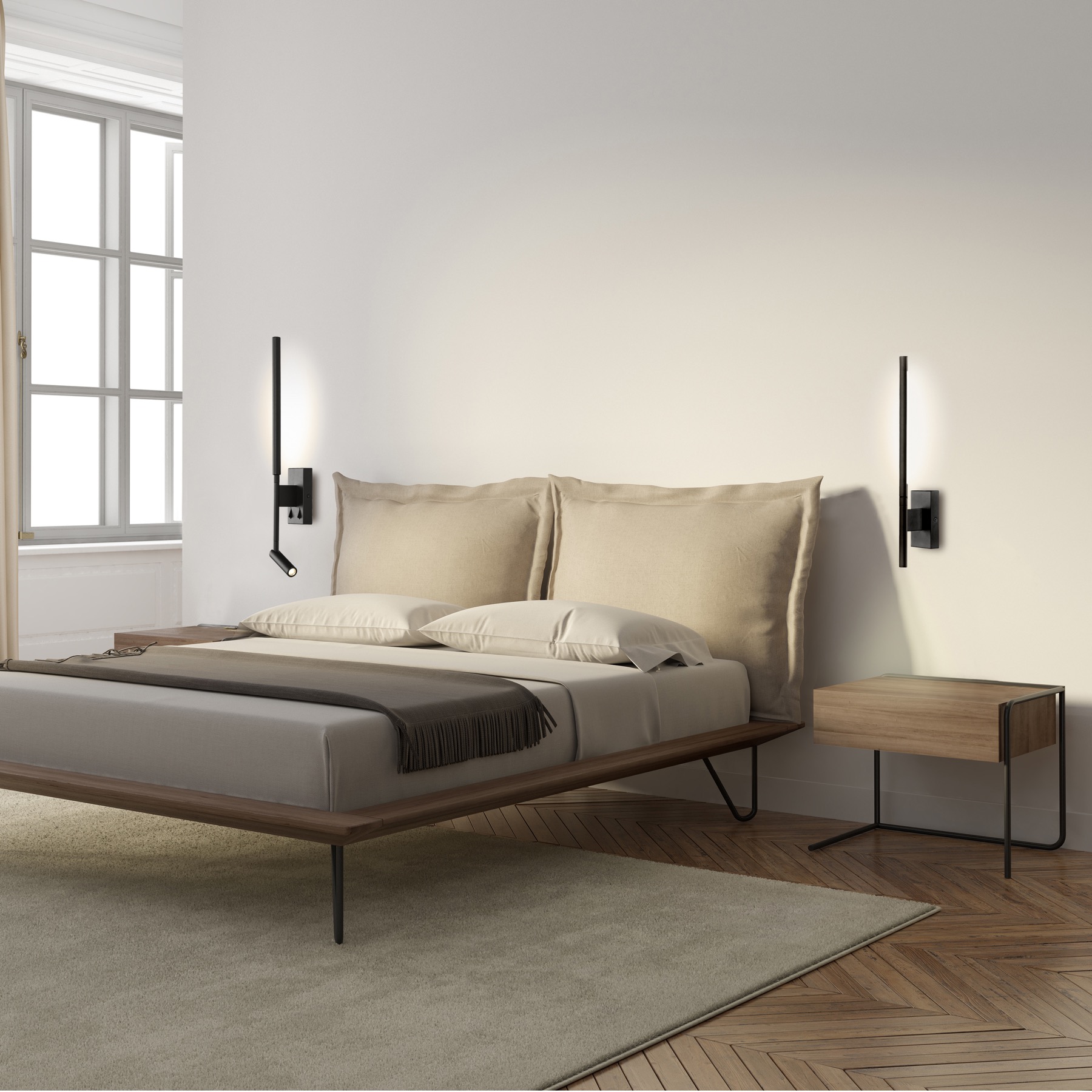 Коллекция TORCH использует гладкую цилиндрическую форму для создания целого ряда современных накладных бра, бра с дополнительным направленным светом, торшера, настольной лампы, линейного подвесного и потолочного света. Тонкие рамы светильника содержат интегральные светодиоды 3000K, рассеянные узкой акриловой крышкой. Накладной бра, комбинированный с направленным спотом, идеально подходит для задач, требующих большей фокусировки, таких как чтение перед сном, а основная лампа может дополнять или заменять основной свет в спальне, в зависимости от ее размера. Оригинальный потолочный светильник образует форму веера и может стать центральным светом для светлой гостиной, в то время