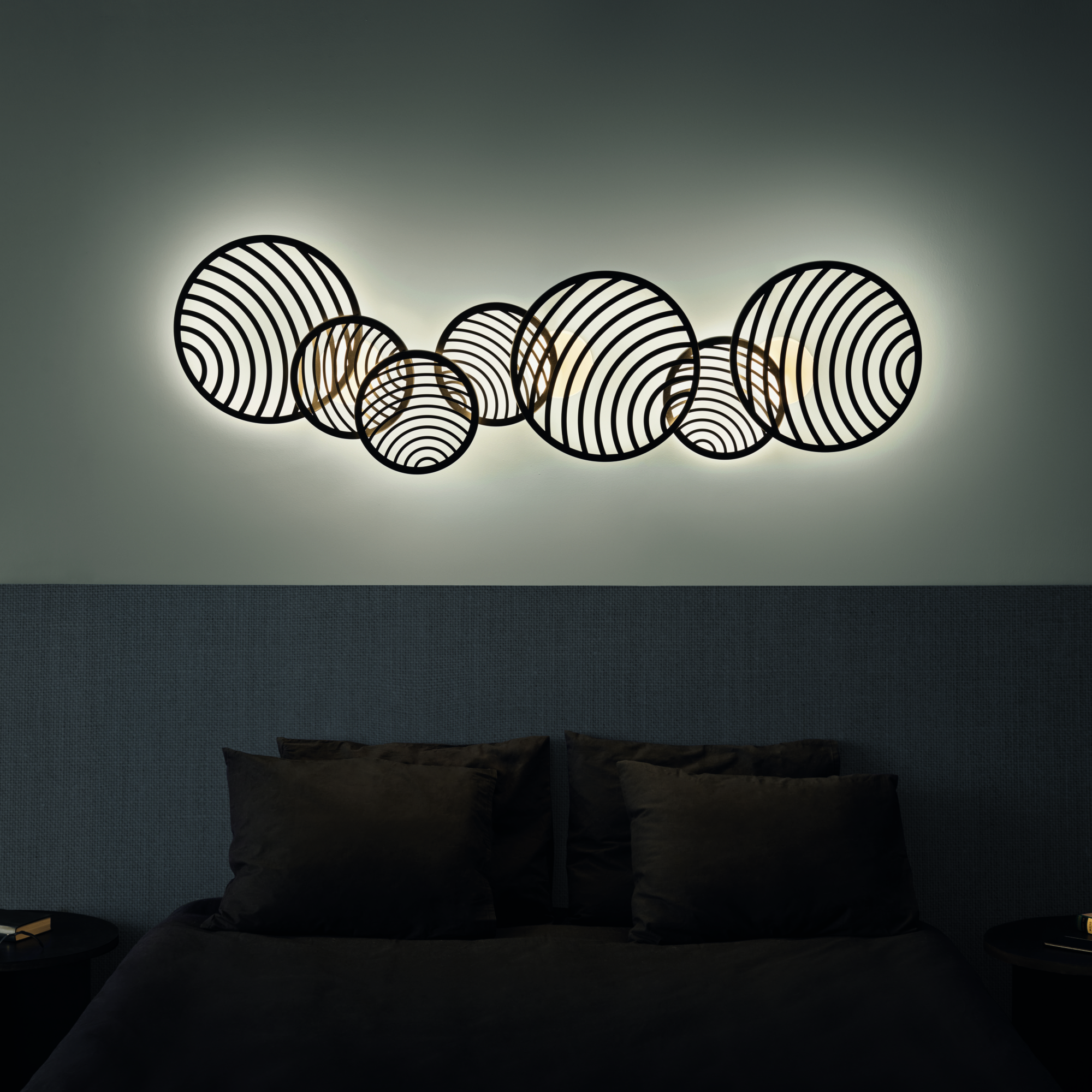COLLAGE представляет собой модульную коллекцию настенно-потолочных бра, которые играют с оптическими иллюзиями. В своем дизайне Сантьяго Севиллано использовал прием наложения двух сетчатых рисунков. Модули объединяются друг с другом, создавая композиции, которые вызывают эффект муара. Светодиоды расположены как на пересечении, так и по всей окружности плафона. Это функциональное сочетание позволяет осветить пространство не только эффектно, но и эффективно. Благодаря гибкому и многофункциональному дизайну, коллекцию можно использовать в разных сценариях и вариациях, создавая уникальные решения для вашего интерьера.