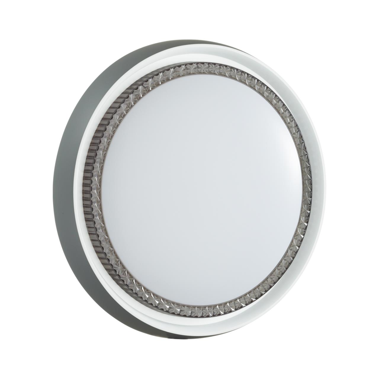 Светильник 7644/ELN линии RAHIG состоит из металлического основания (базы) и пластикового рассеивателя. Материал рассеивателя — высококачественный пластик марки PMMA 2.0 белого цвета с матовой поверхностью. Пластик обеспечивает светильнику равномерное рассеивание и хорошее светопропускание. Материал обода — пластик серого цвета с внешней стороны, белого цвета с внутренней стороны. Форма плафона — круглая, декорирована вставкой под хрусталь из прозрачного пластика дымчатого цвета. Степень защиты IP43 позволяет использовать светильник в определенных зонах влажных помещений. В комплект входит LED-модуль с линзами мощностью 76 Вт, которая соответствует лампе накаливания 740 Вт, а также переключатель температуры цвета (ССT) на драйвере, с помощью которого осуществляется изменение цветовой температуры 3000/4000/6000 К и переход светильника в режим теплого/белого/холодного света. Для установки необходимого режима рекомендуется использовать удлиненный тонкий предмет типа небольшой отвертки.