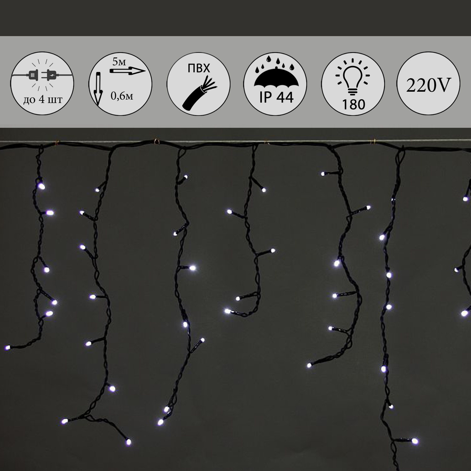A-056AR WT светодиодная гирлянда «бахрома» 5×0.6м 180LED черный провод влагозащищен.