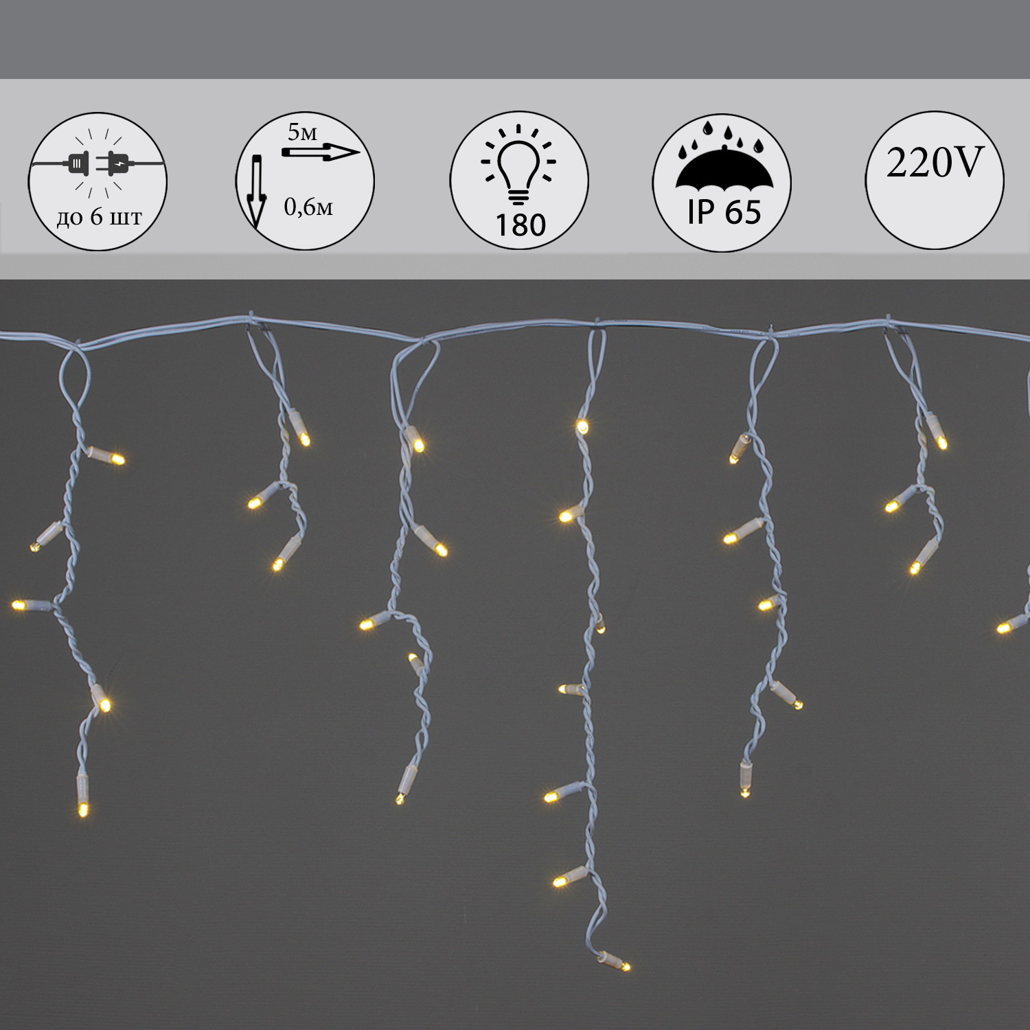 A-057B WW гирлянда светодиодная 5х0,6м 180LED в виде «бахрома», провод белый, морозостойк.