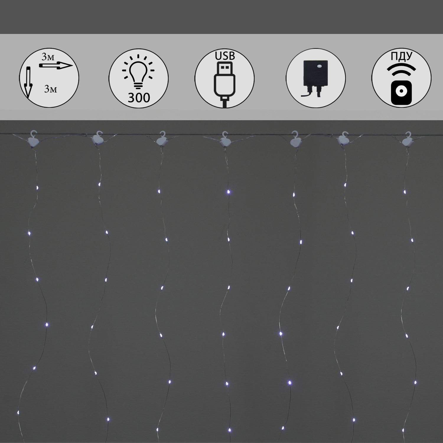 A-972 W cветовой занавес «Роса», 3х3м, провод серебристый, 300LED, USB-контроллер, ПДУ